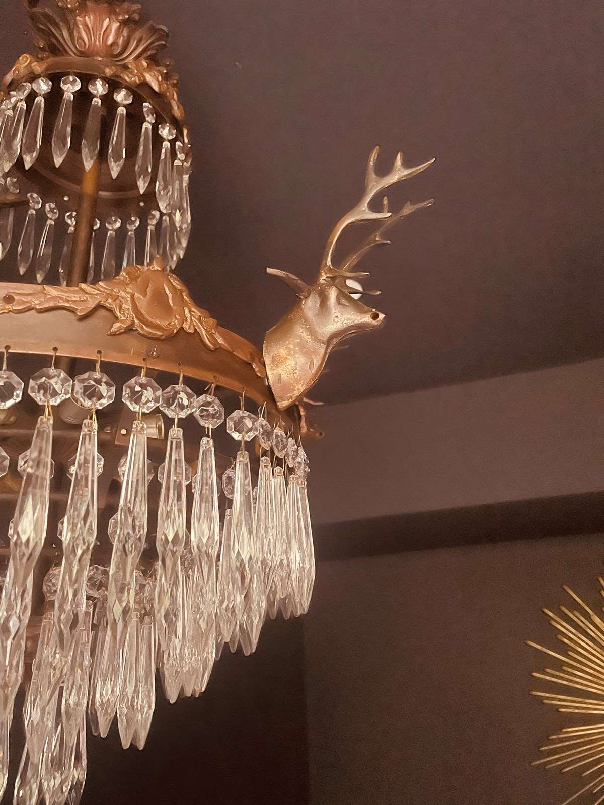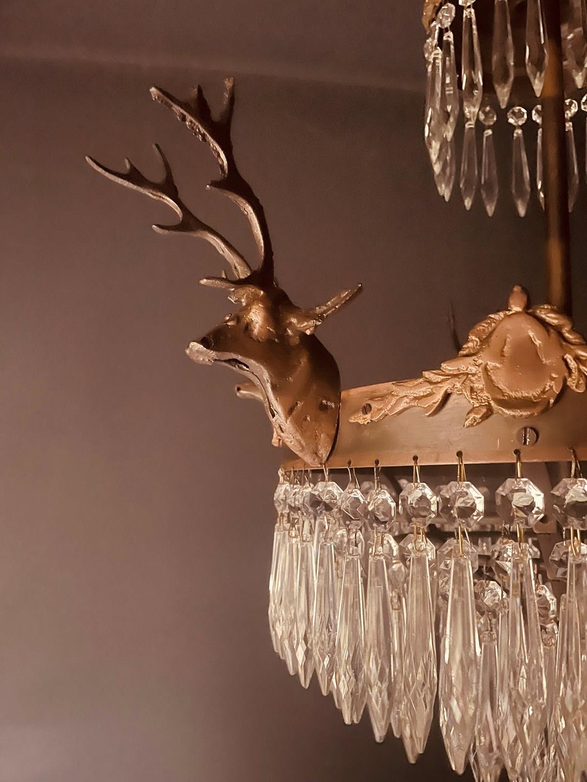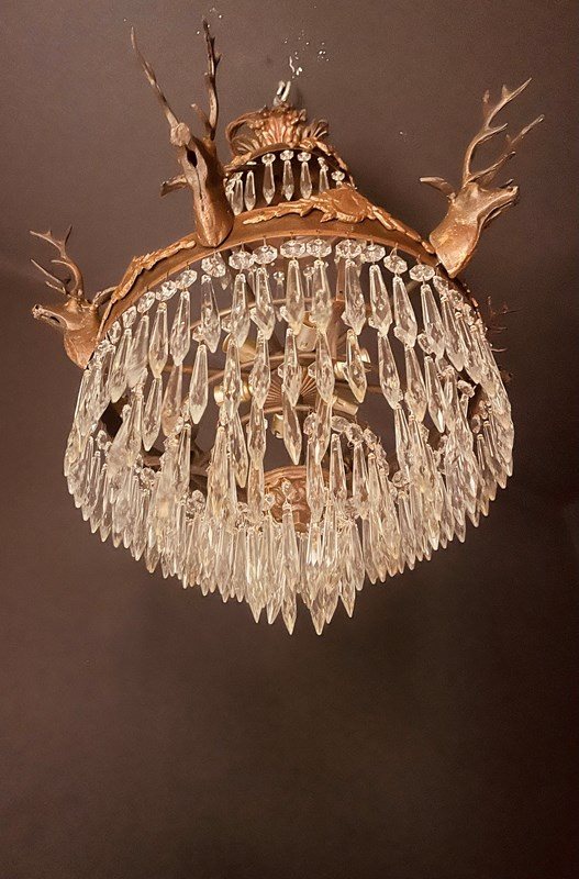 An exquisite French two-tiered chandelier with stags adorning the lower tier.