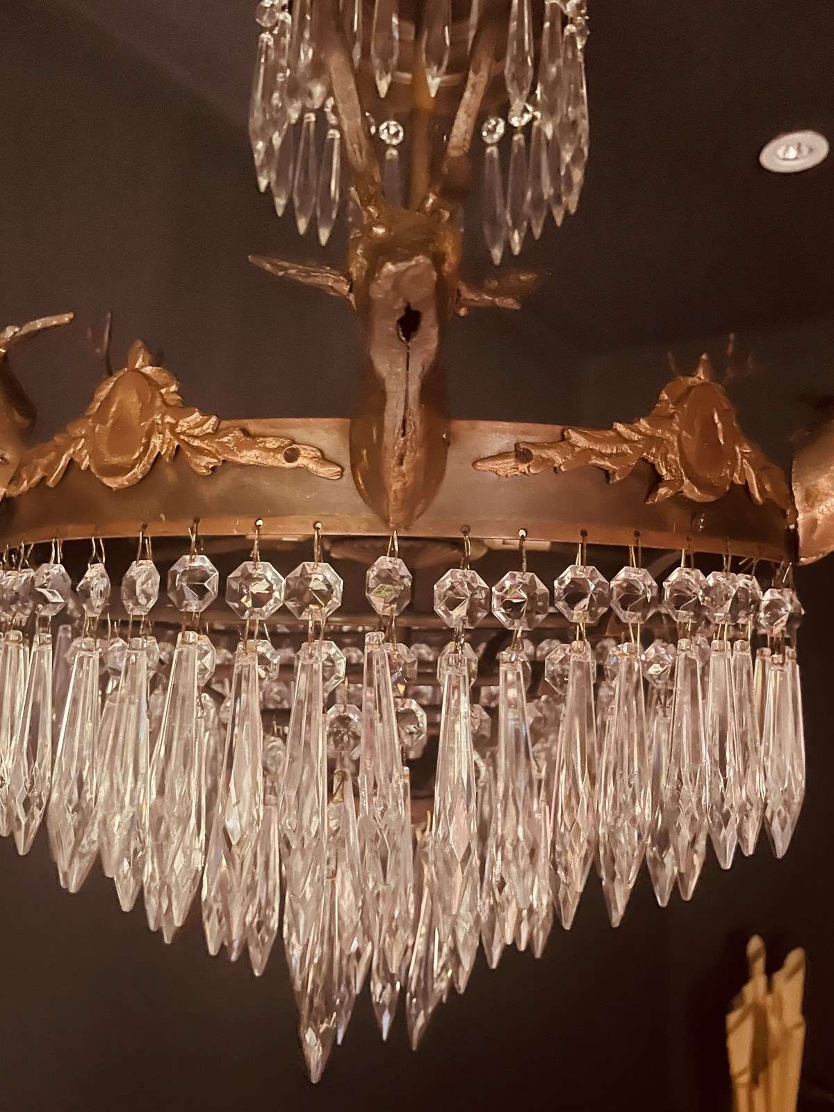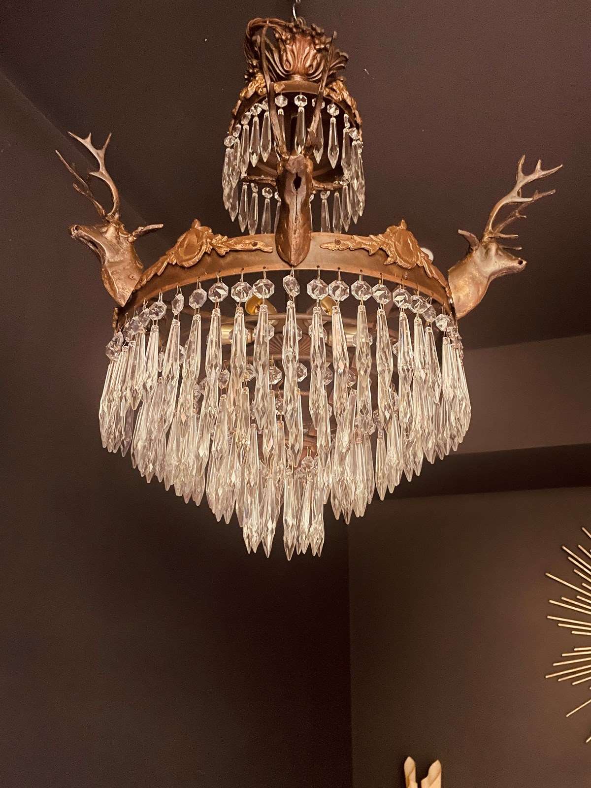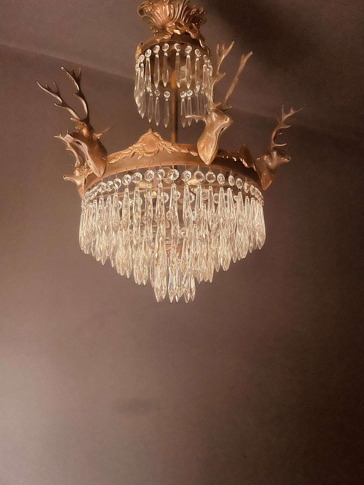 An exquisite French two-tiered chandelier with stags adorning the lower tier.