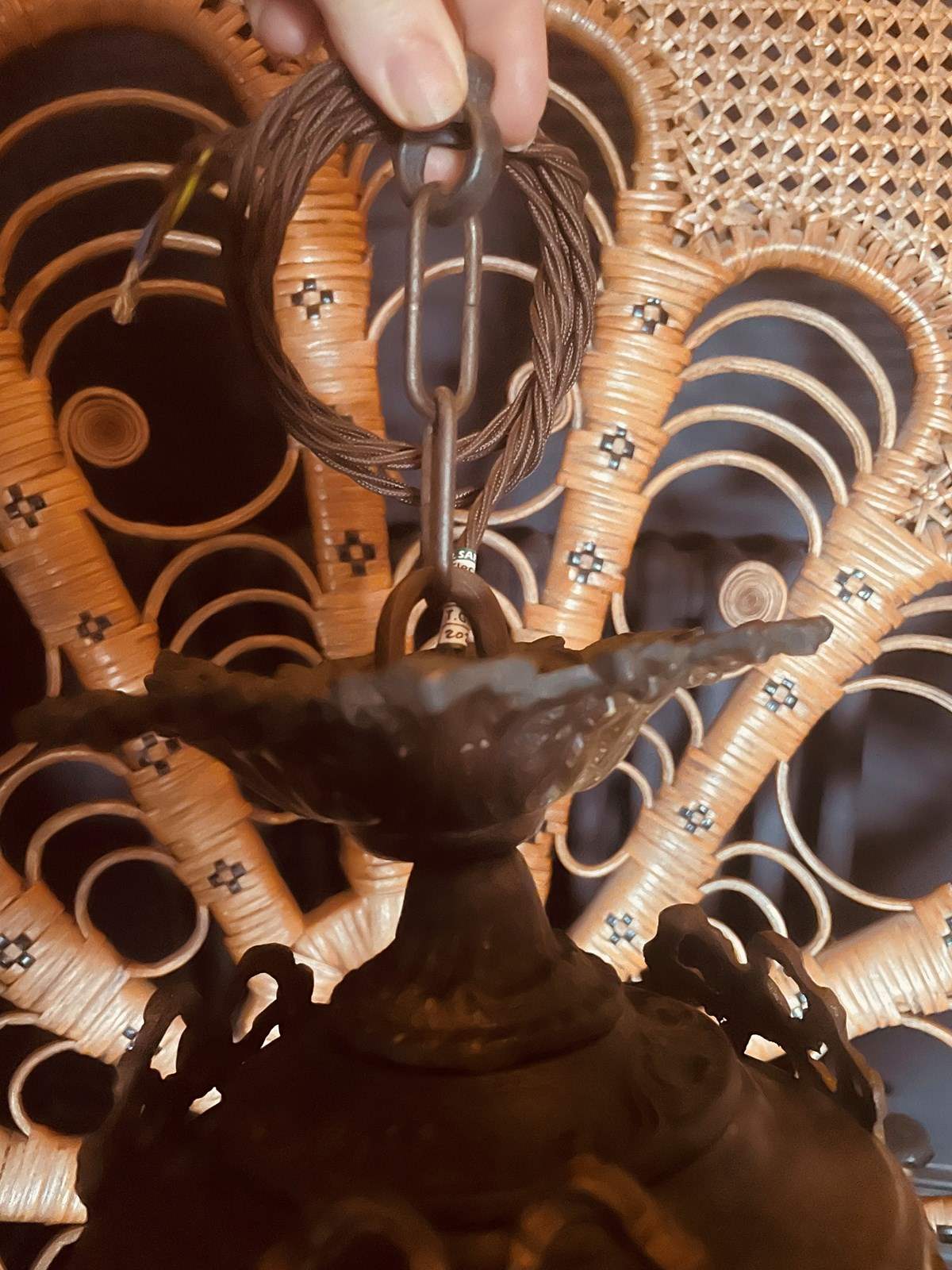 It looks like it was designed to be flush mounted to a ceiling - and there is the original rose, however there is a further piece of chain so it could hung lower. I reckon it weighs at least 20-25kg so please bear in mind when affixing to a ceiling.