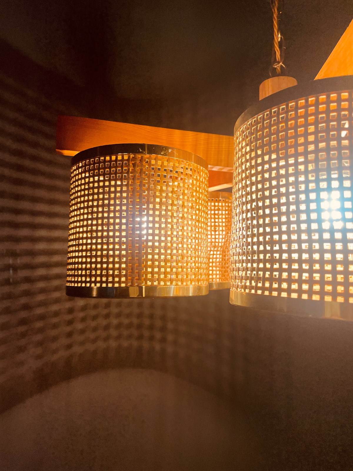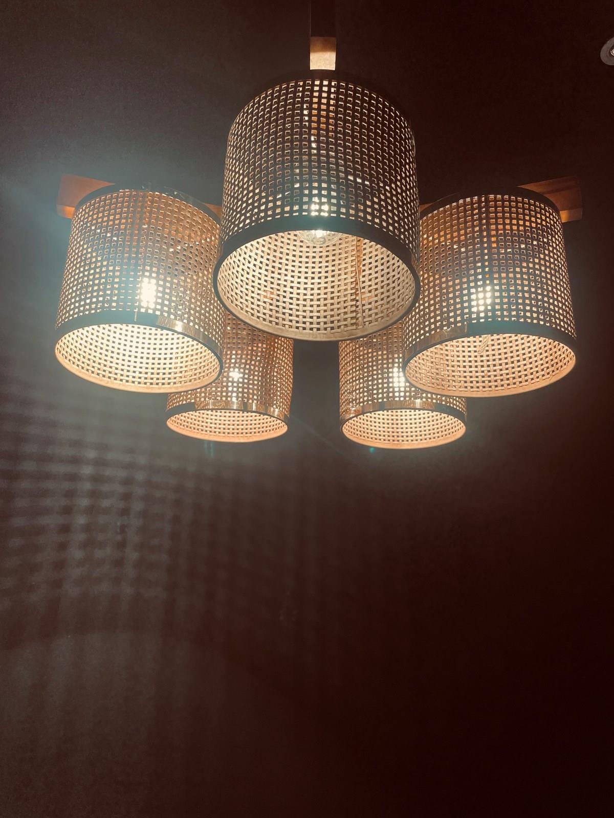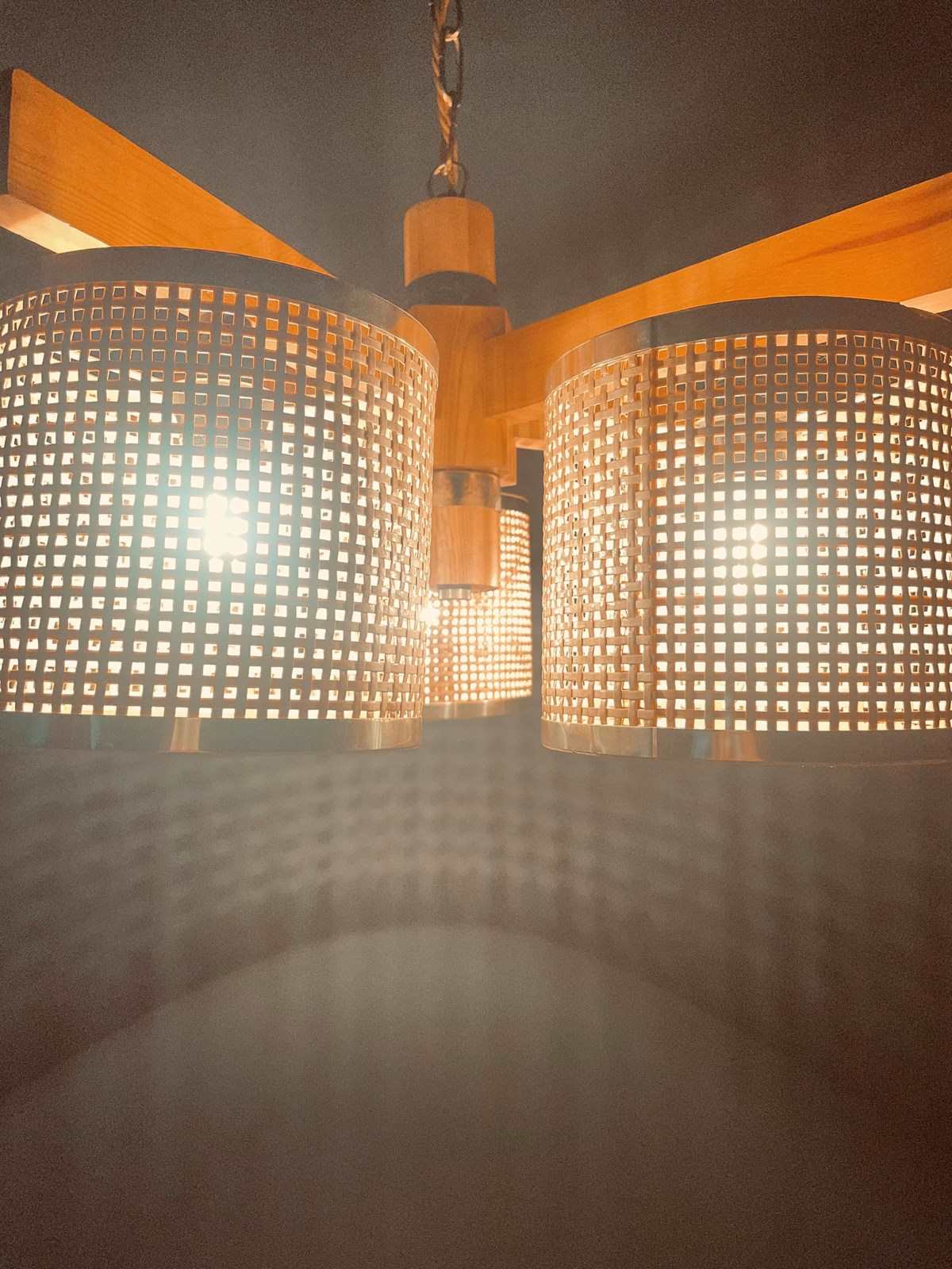 The main body is made from teak with brass fittings and five cylindrical rattan shades, each housing one e14 bulb holder.