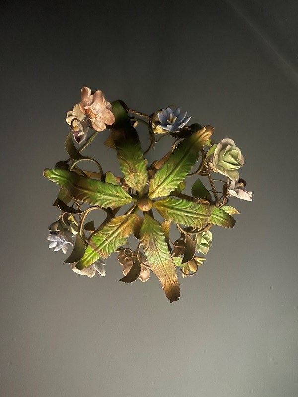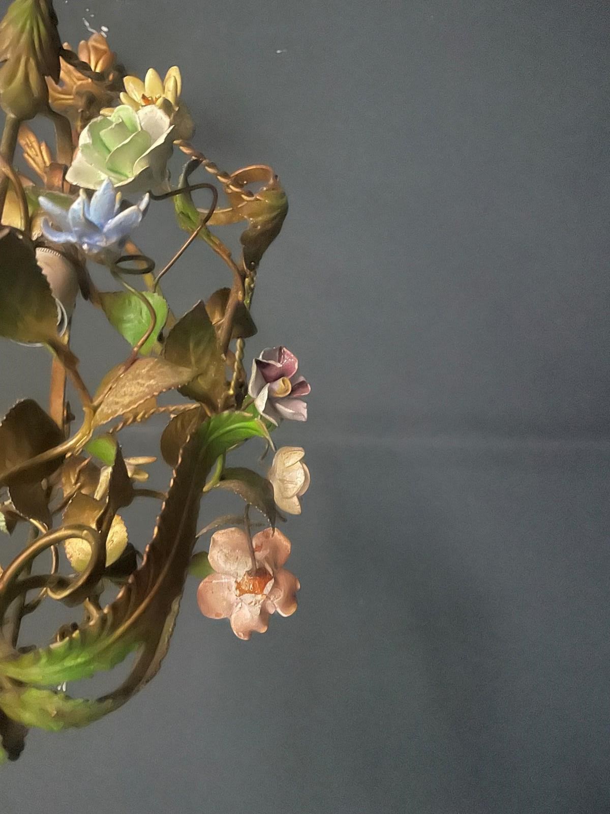 The flowers are both ceramic and tile, surrounded by gilt tinged leaves.