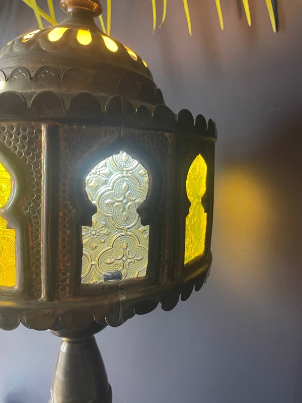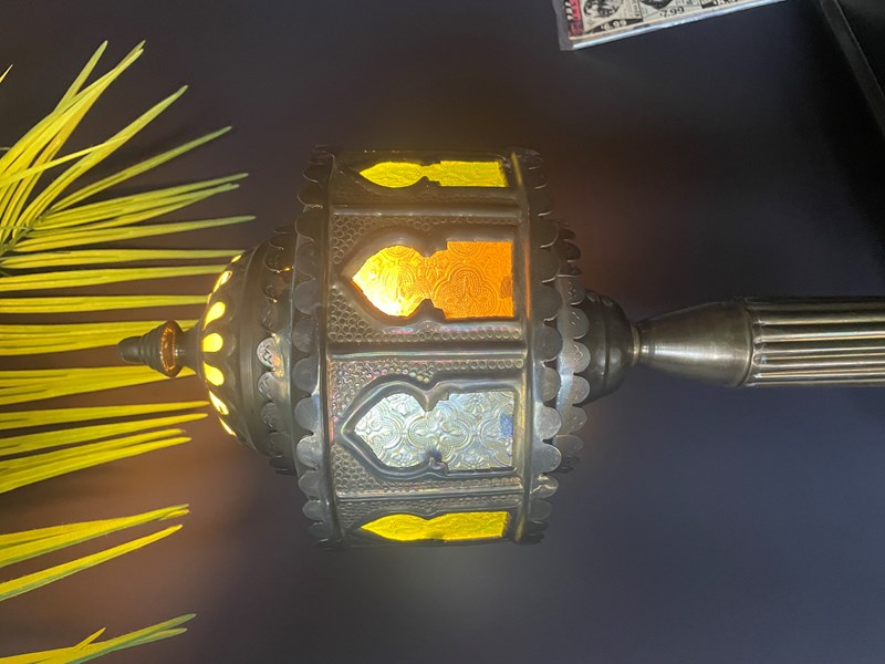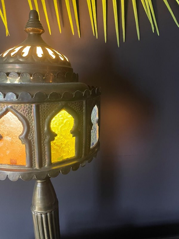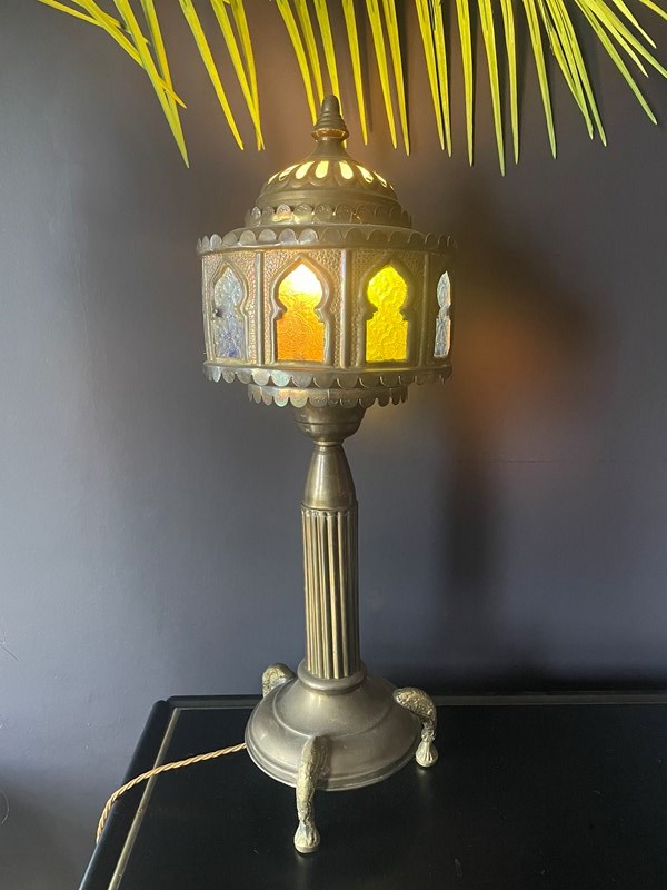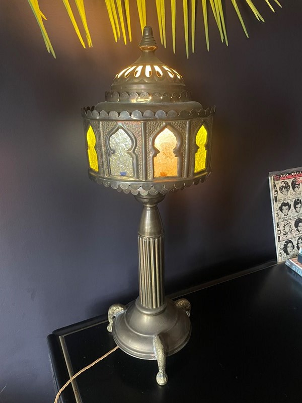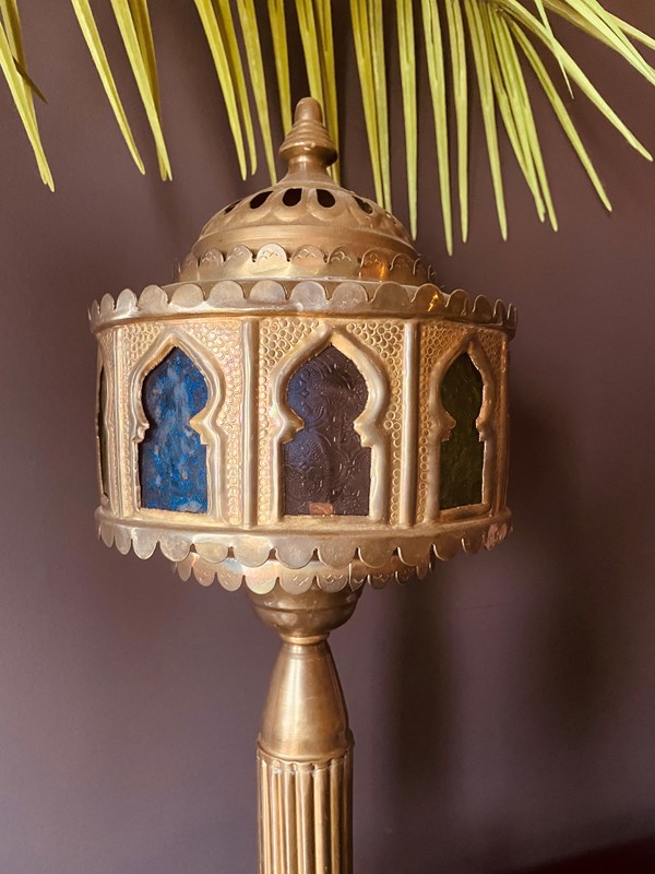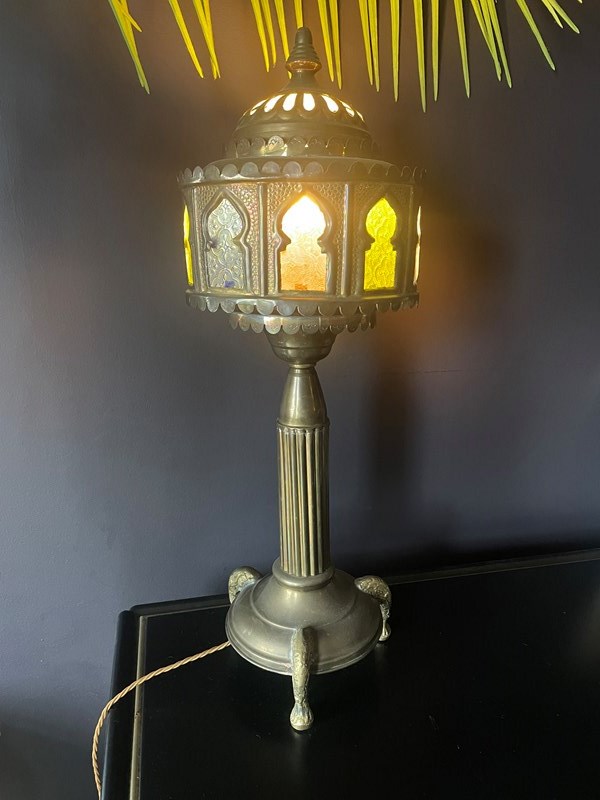 An unusual, tall brass table lamp, featuring coloured, patterned glass in green, blue, yellow and orange.