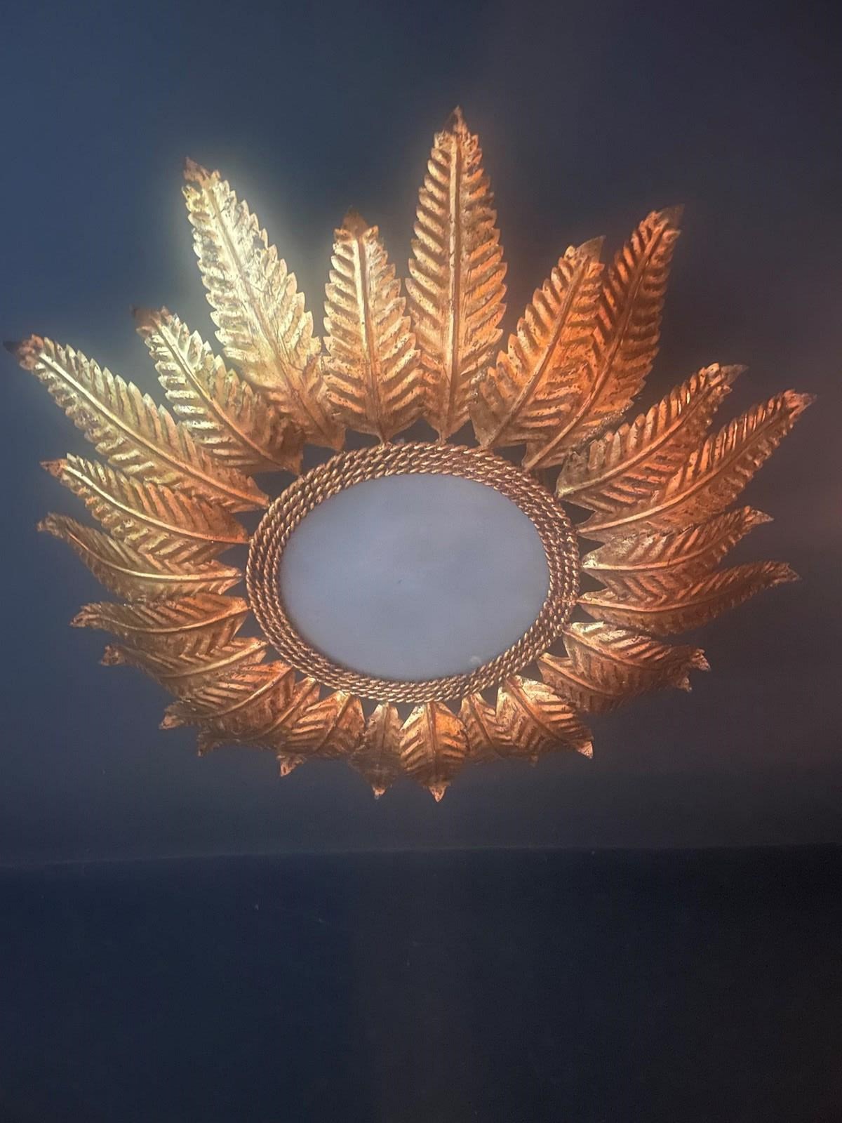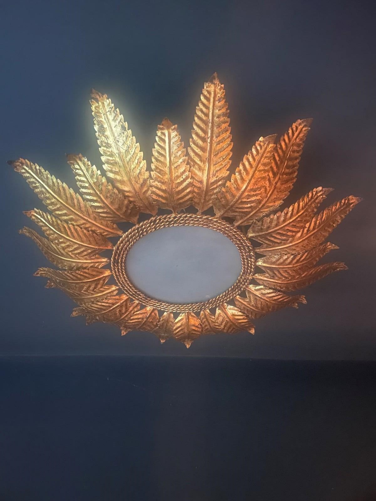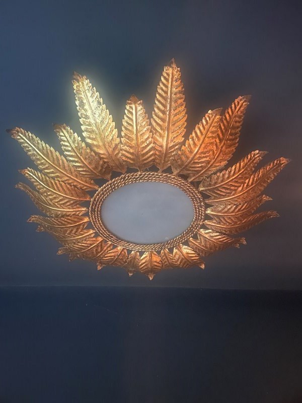 One tier of longer gilt leaves and another of smaller ones, these are becoming incredibly difficult to source. Made in Spain during the 50s & 60s, they work extremely well in rooms that require a statement light, but with limited ceiling height.