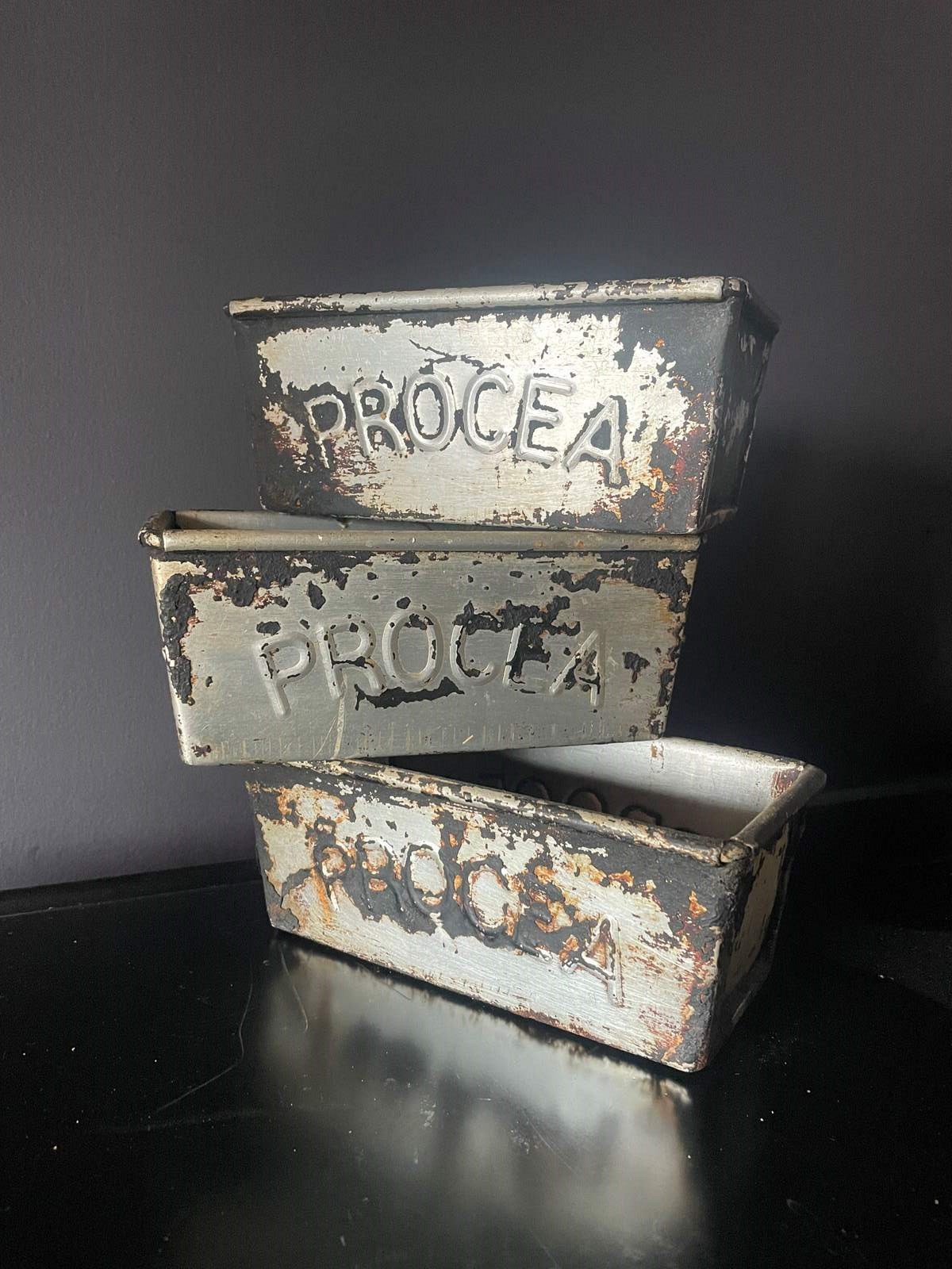 Three mid century metal bread tins embossed with Procea - a British bread which was popular in the 50s & 60s.
