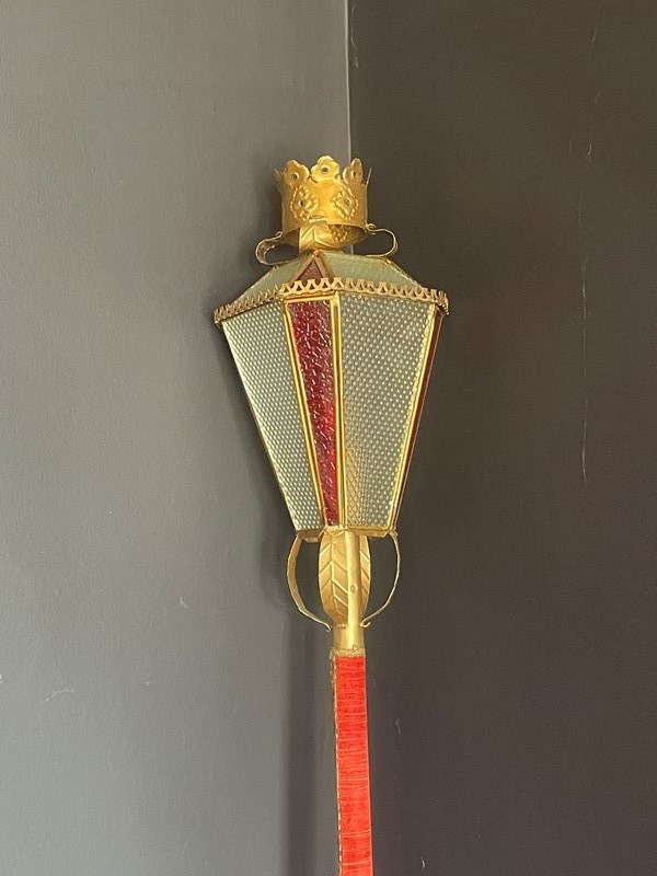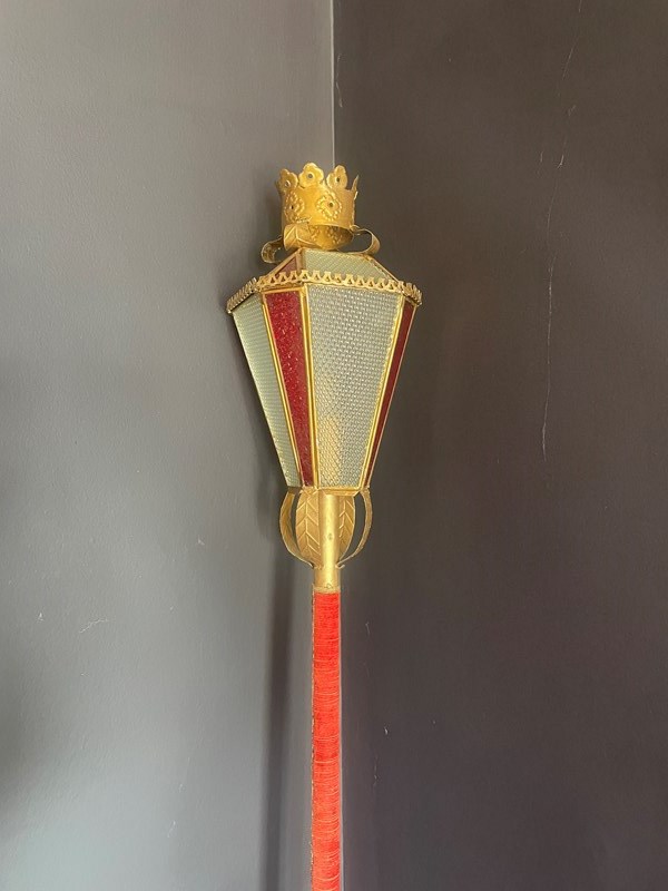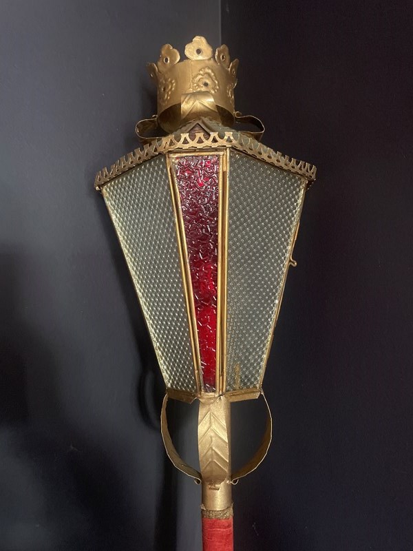 The lantern is made from red and clear mottled glass, with one ‘door’ opening so you can change the bulb.