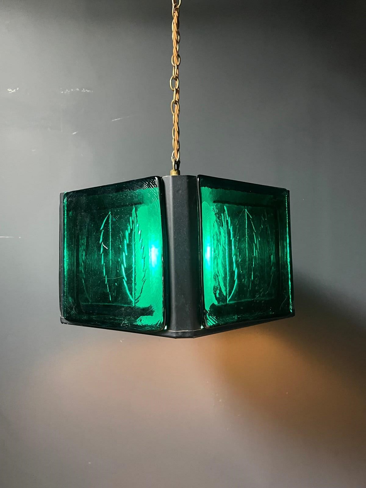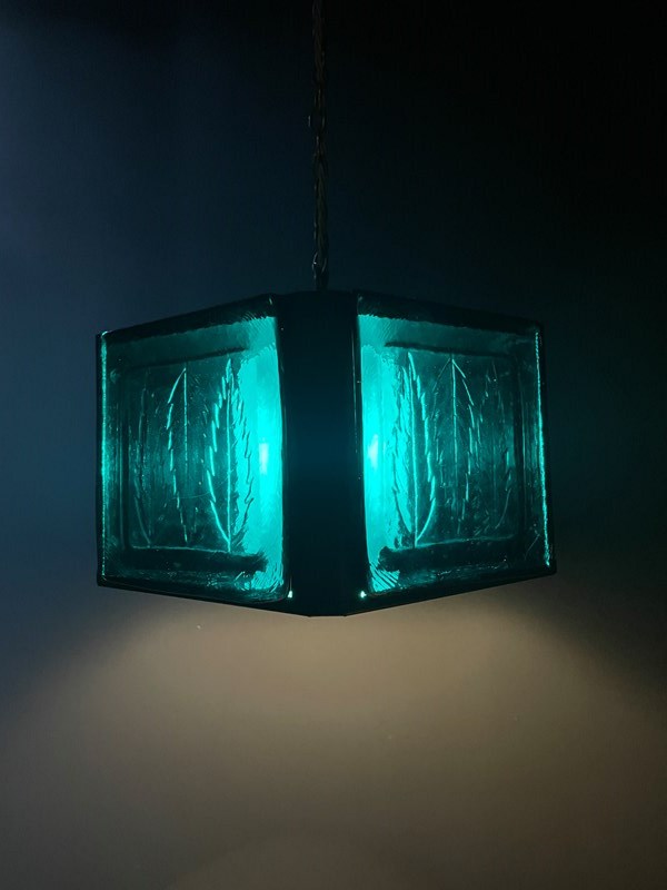 Pentagonal in shape, the frame is black metal and there are five, leaf embossed panels that slide out of the top. There is a frosted glass diffuser within the panels that holds one bulb.