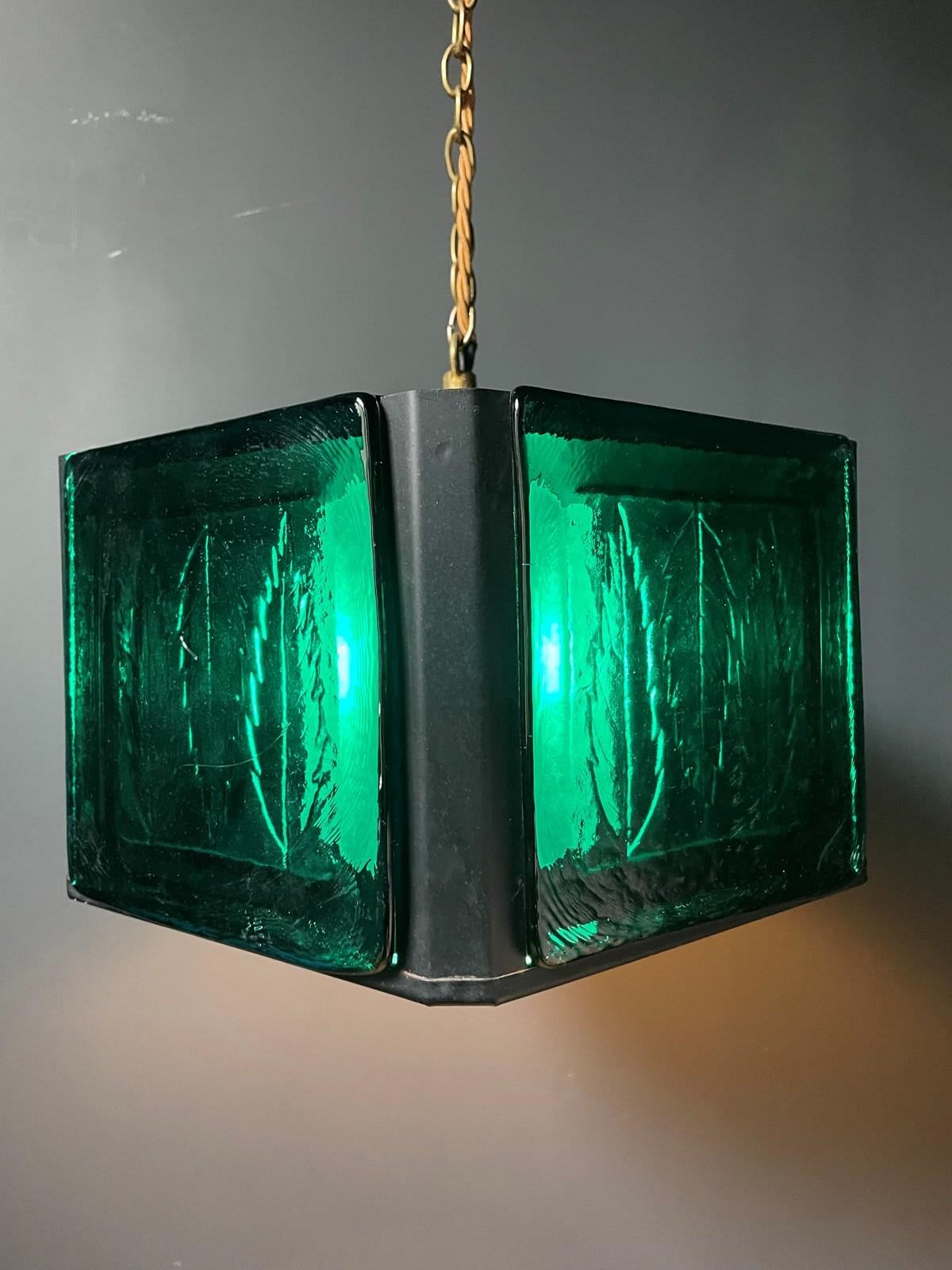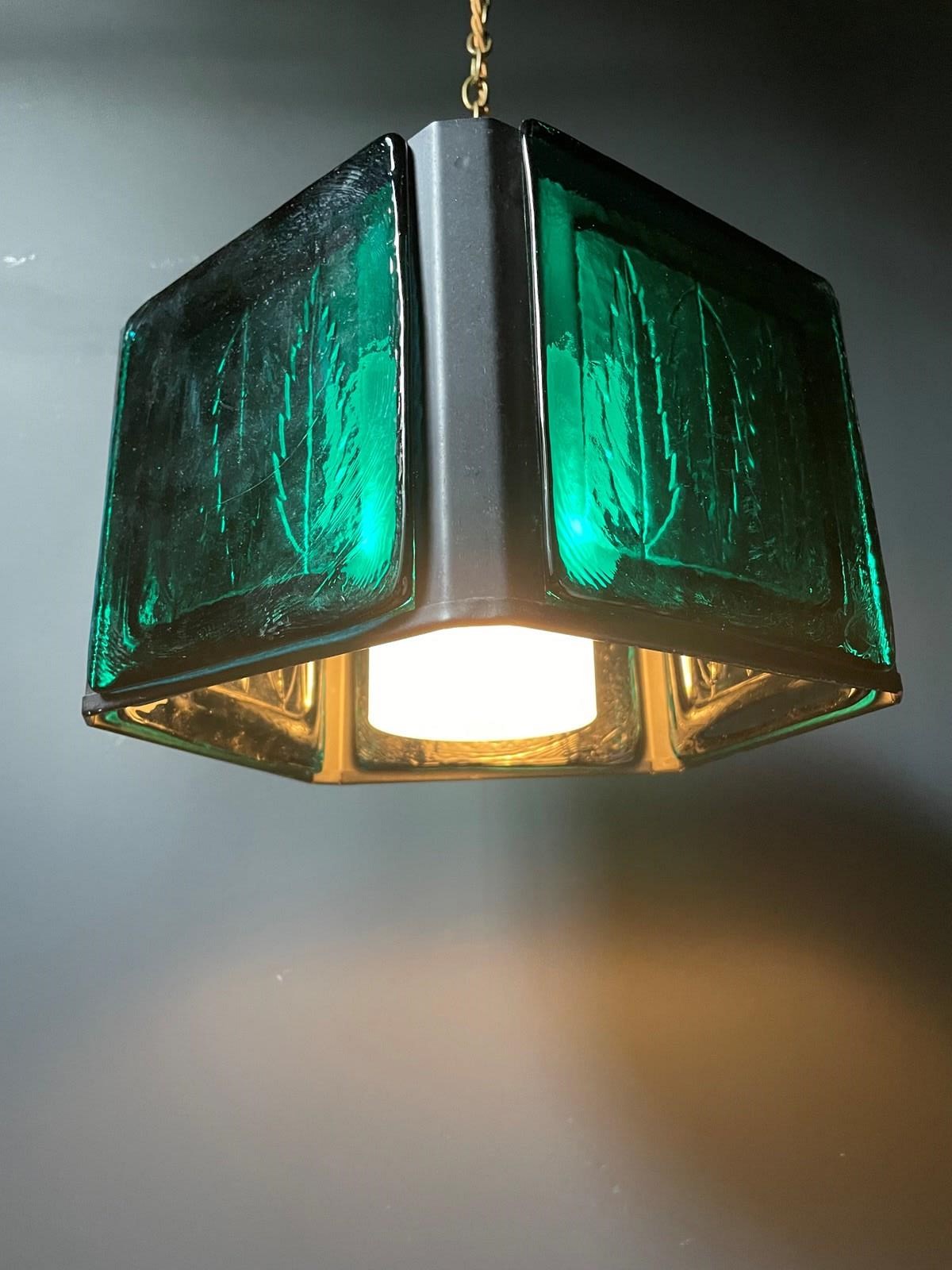 Wonderful glass and metal pendant designed by Erik Hoglund for the well-respected glassmaker, Boda Glasbruk.