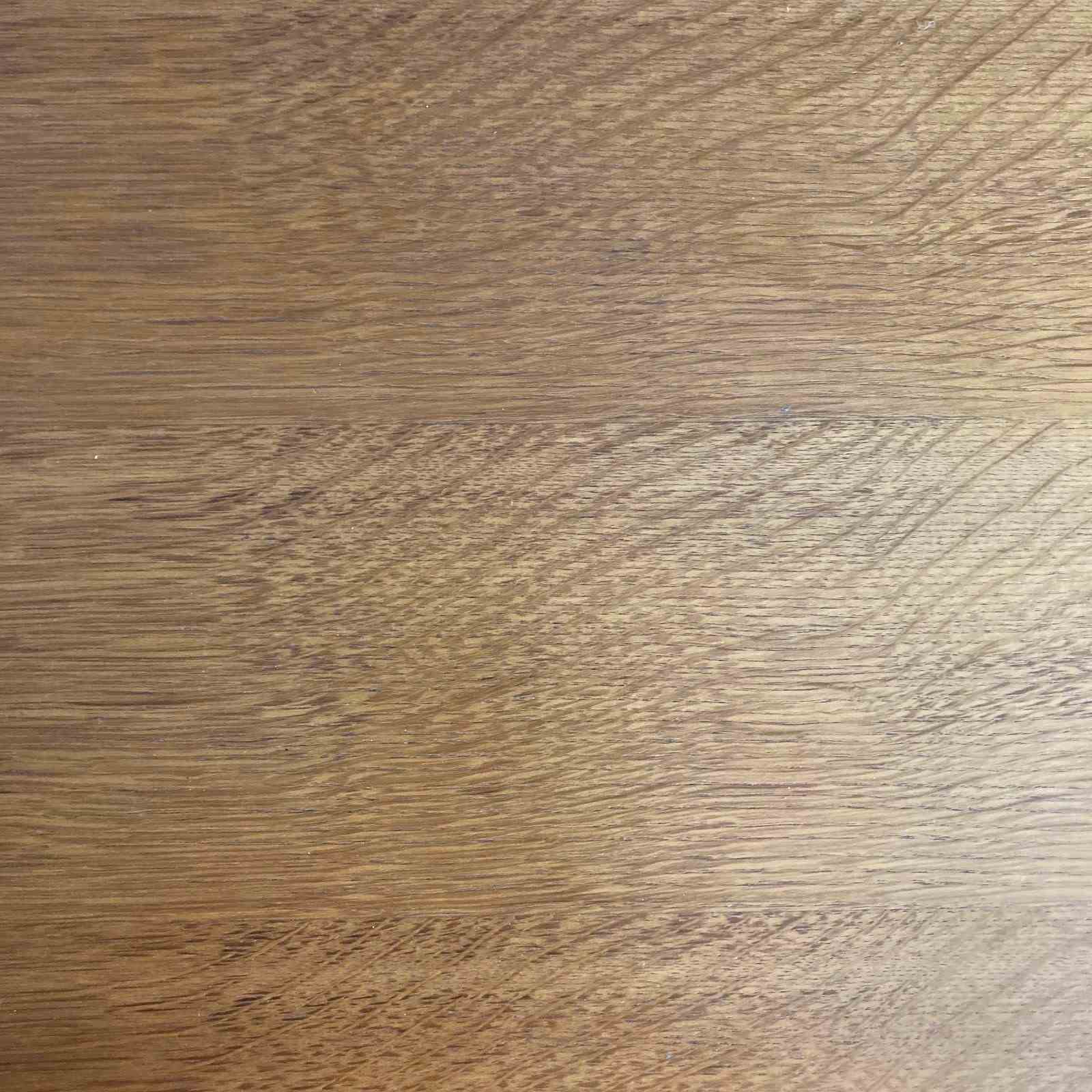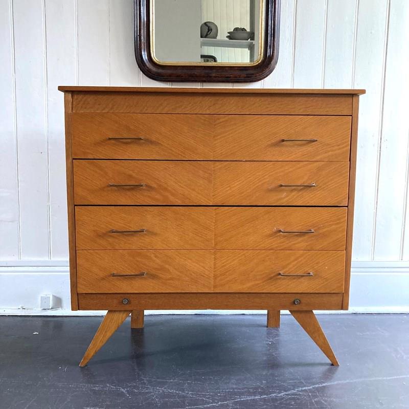 A 1960s French chest of drawers with matched oak veneer, brass handles and long bolt securing the legs front to back.