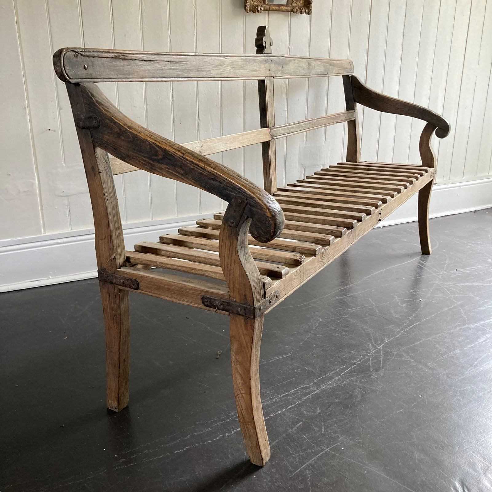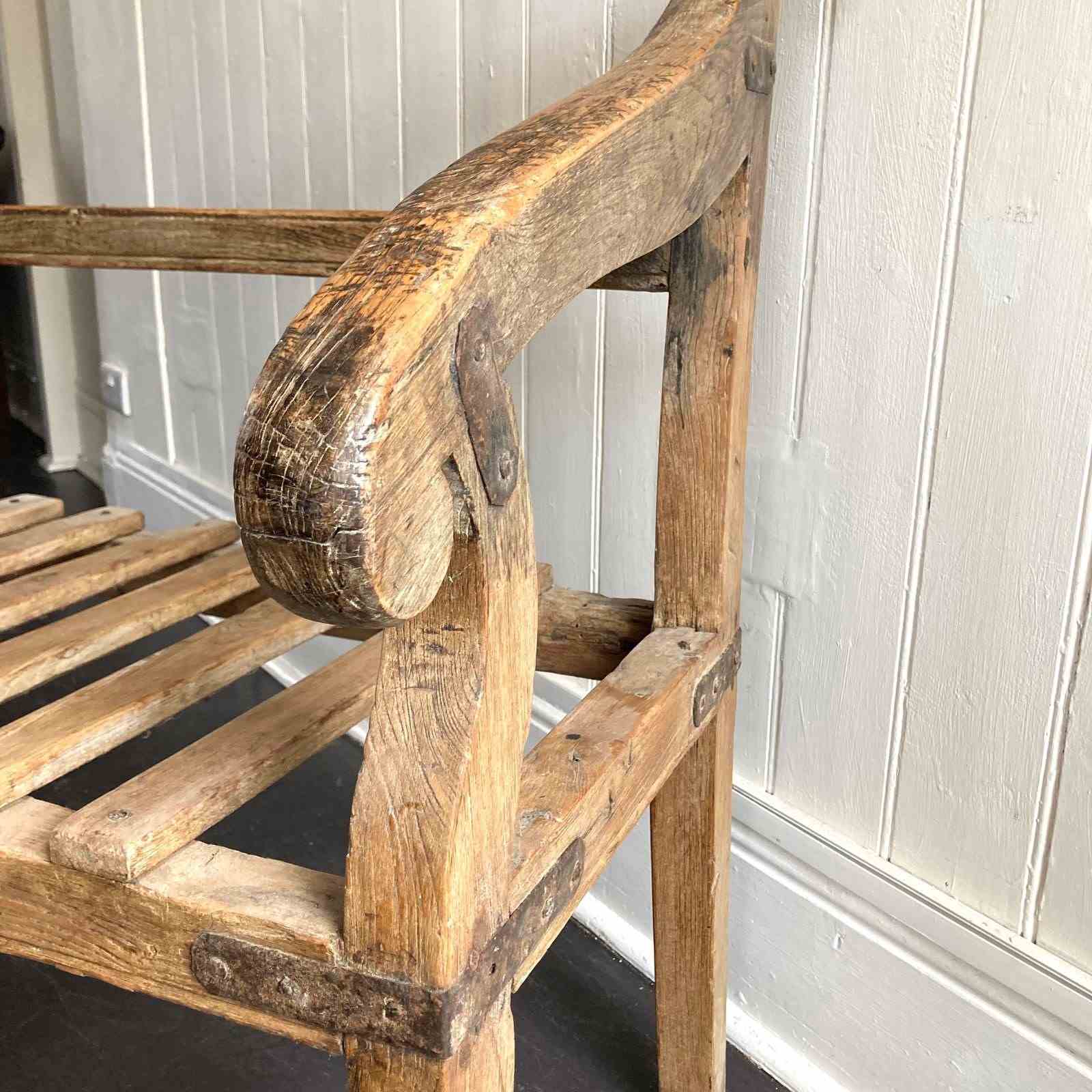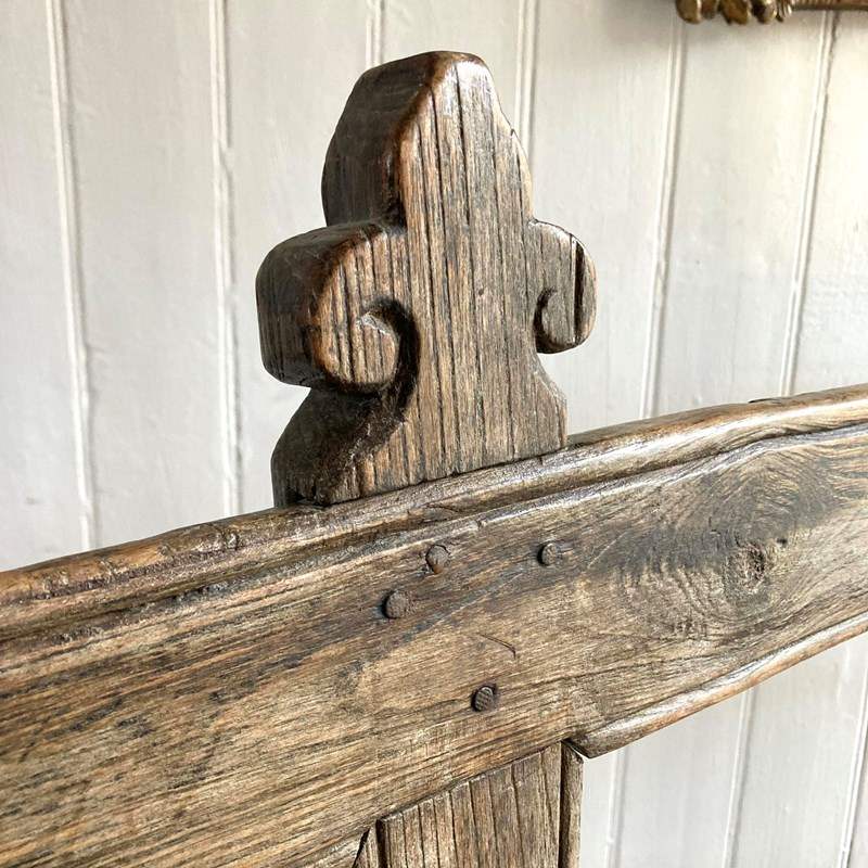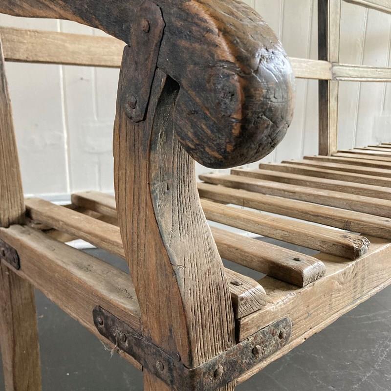 A 19th century French rustic slatted long oak bench with metal straps and Fleur de Lis decoration