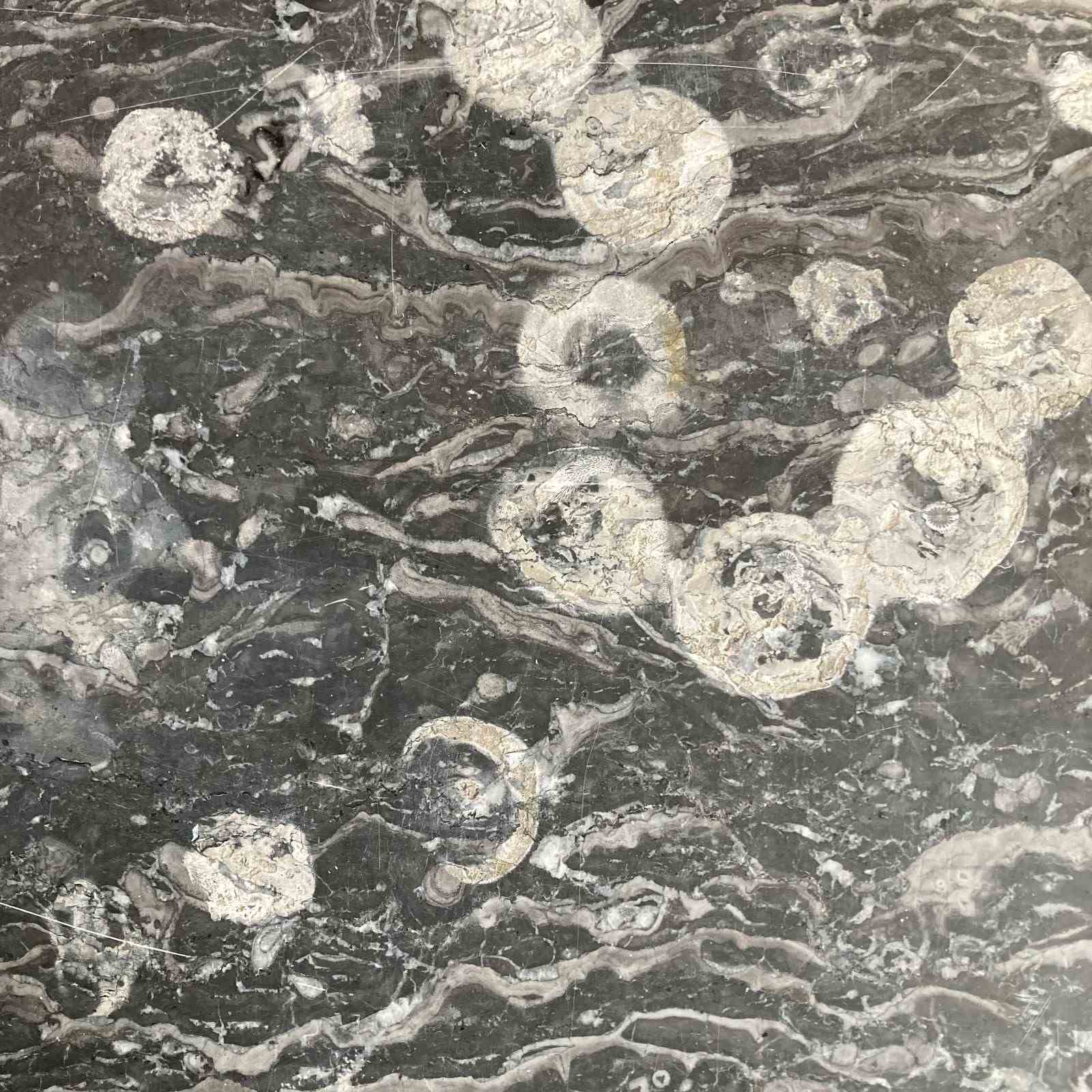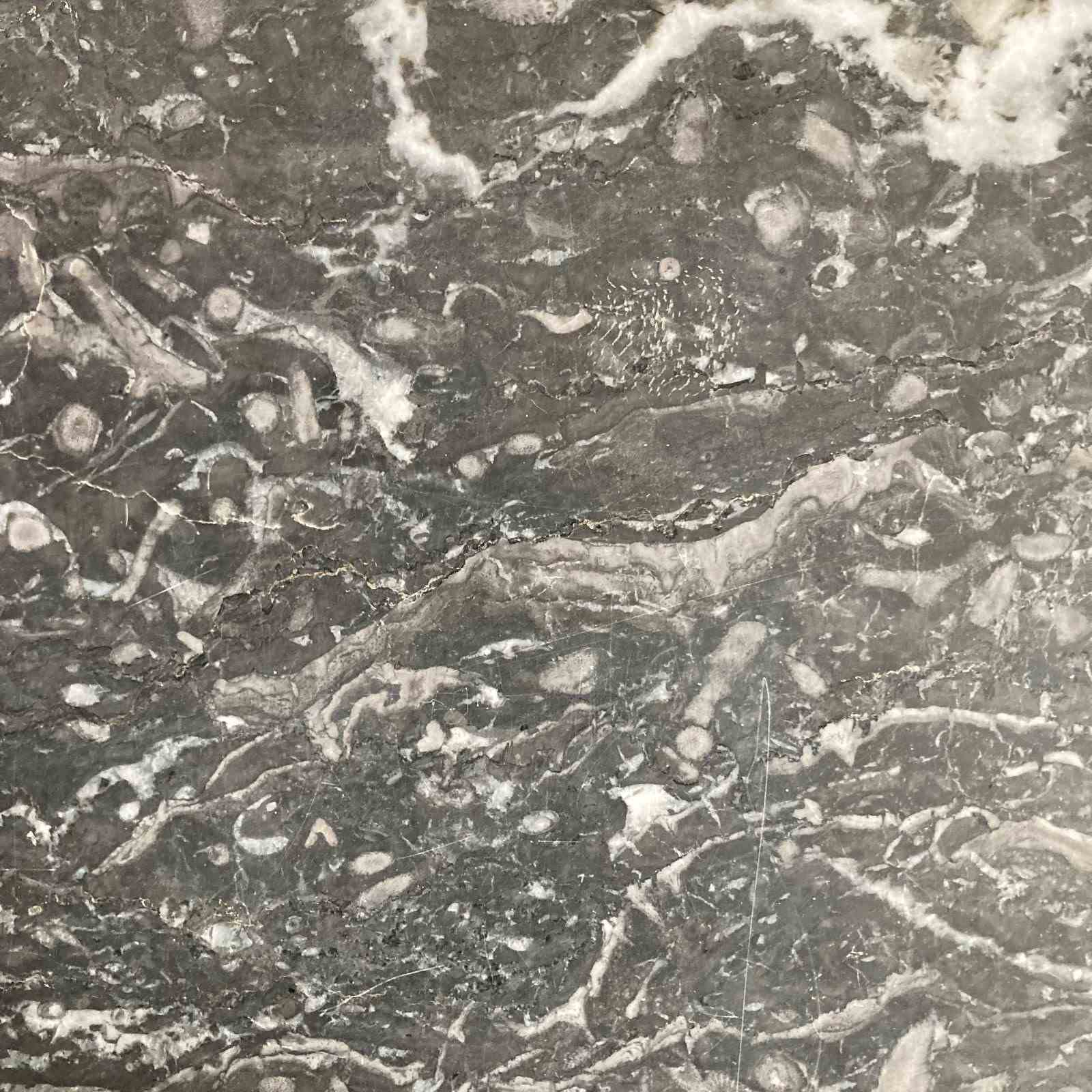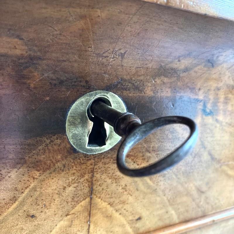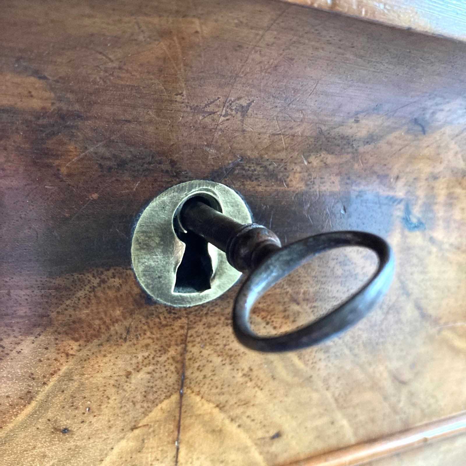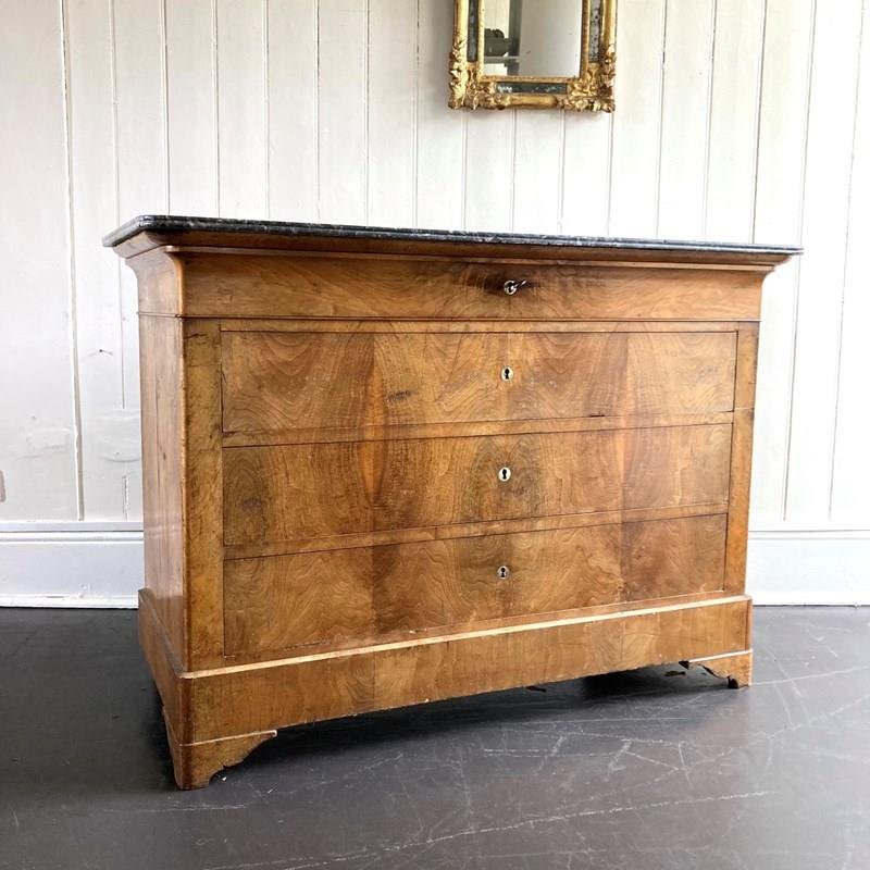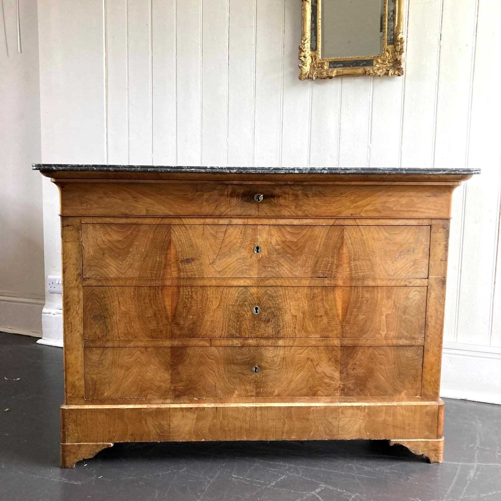 A 19th century walnut commode with book matched veneer front four drawers brass escutcheons, bracket feet and St Anne's grey marble top.