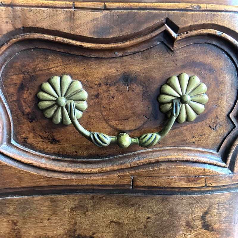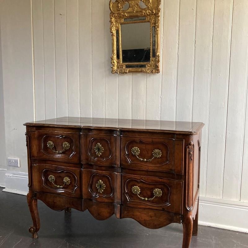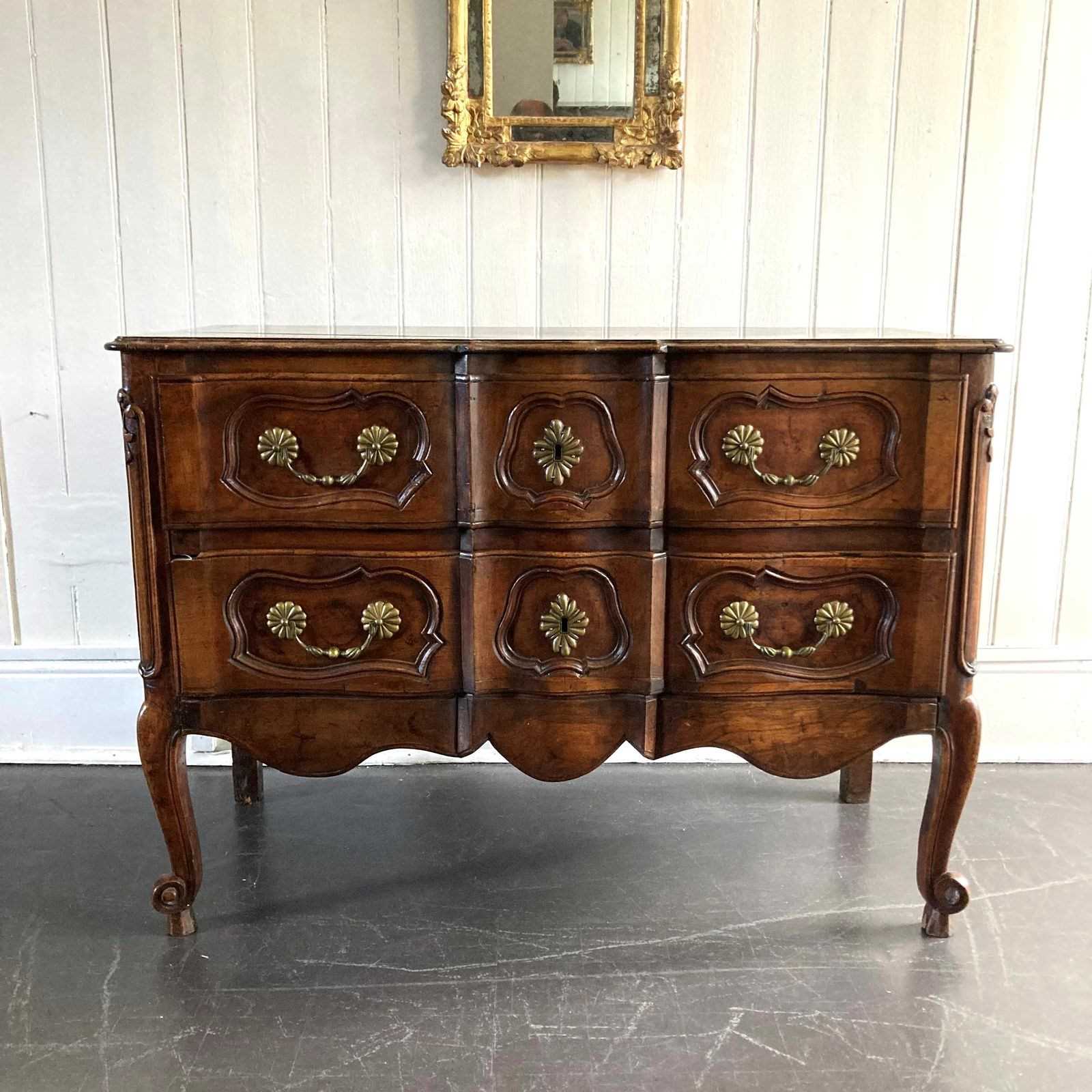 Early 20th Century French walnut serpentine two drawer commode,with brass handles and escutcheons on cabriole legs. Circa 1920