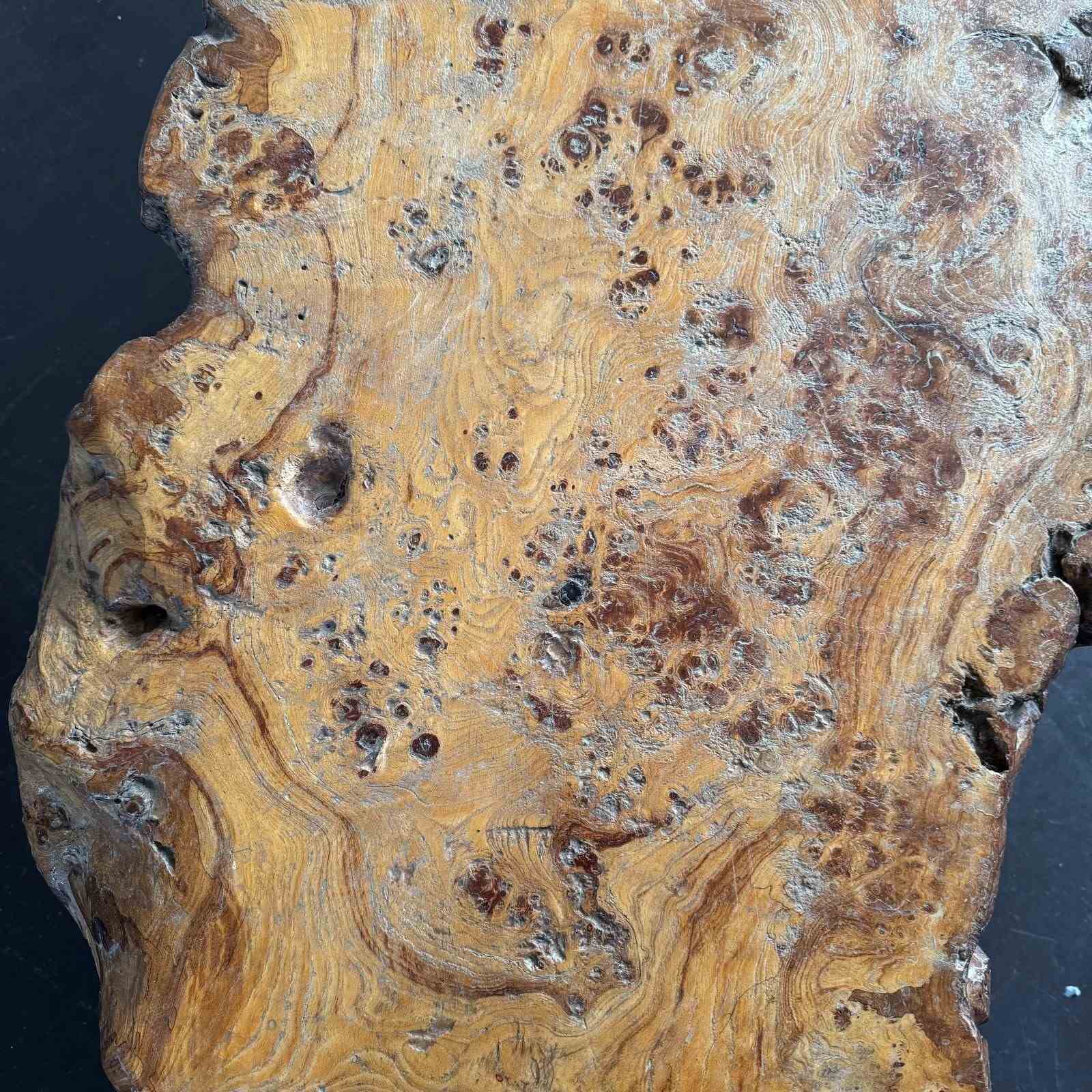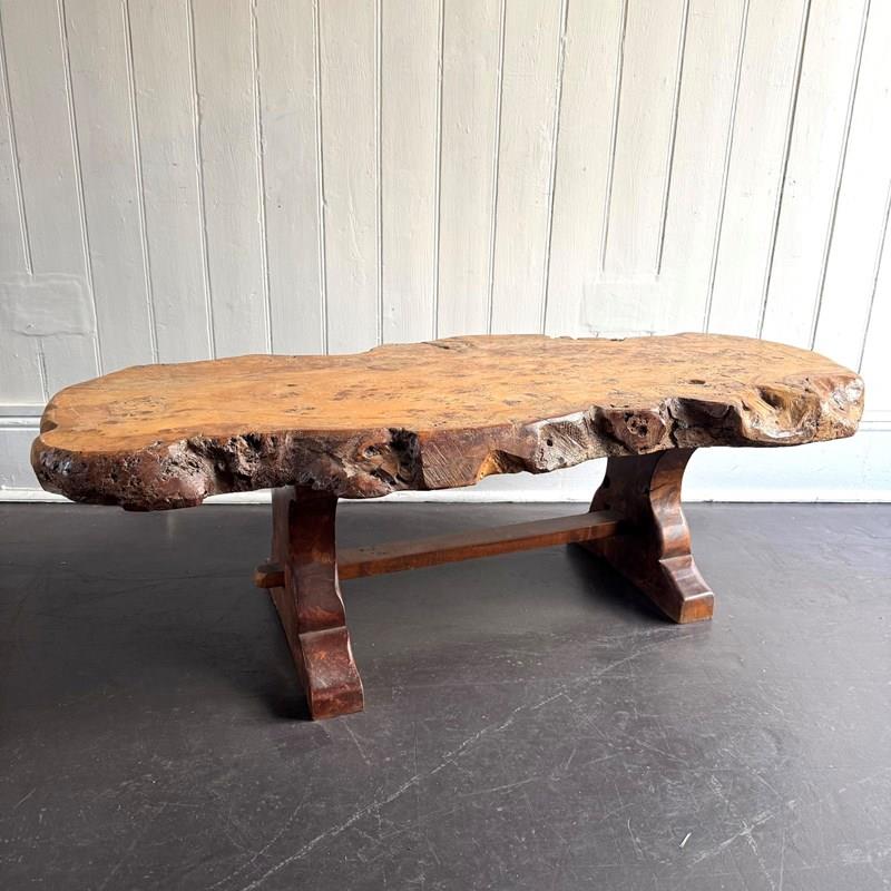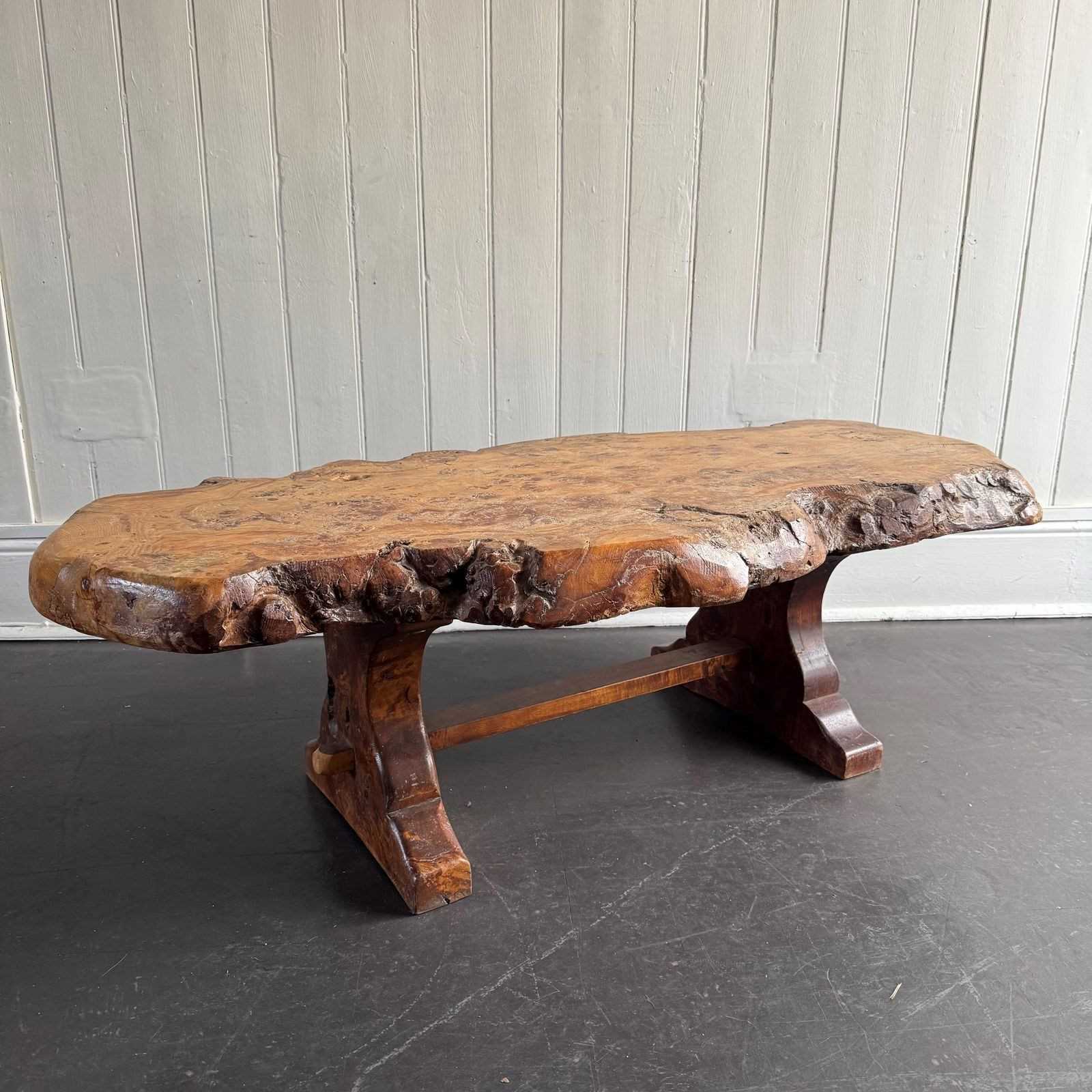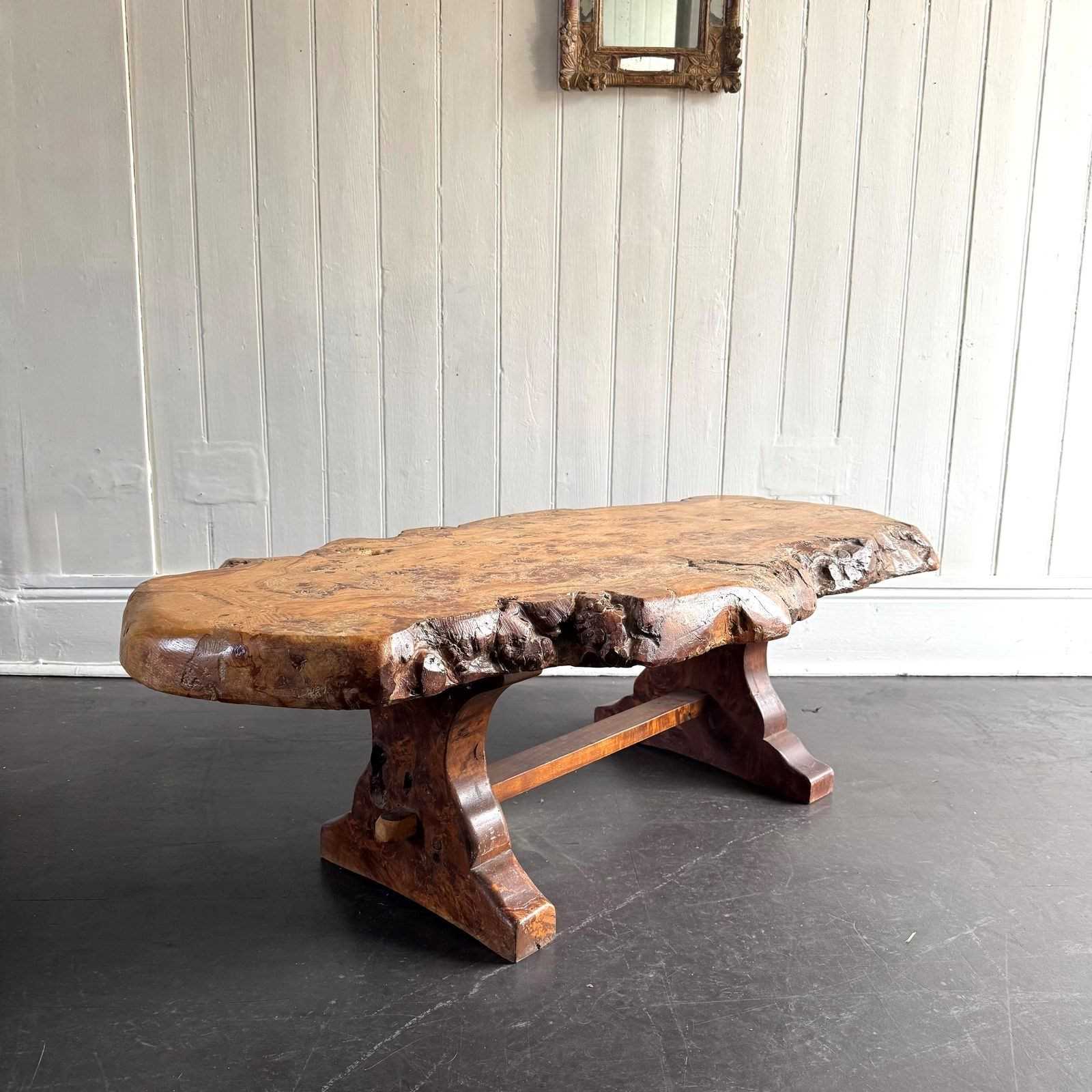 A large mid century burr elm coffee table on a stretcher base. Lovely colour. France
