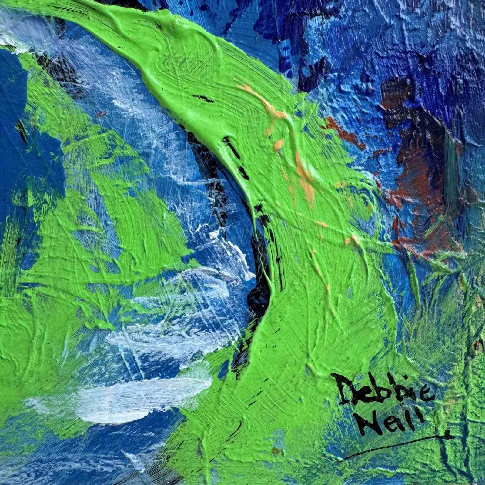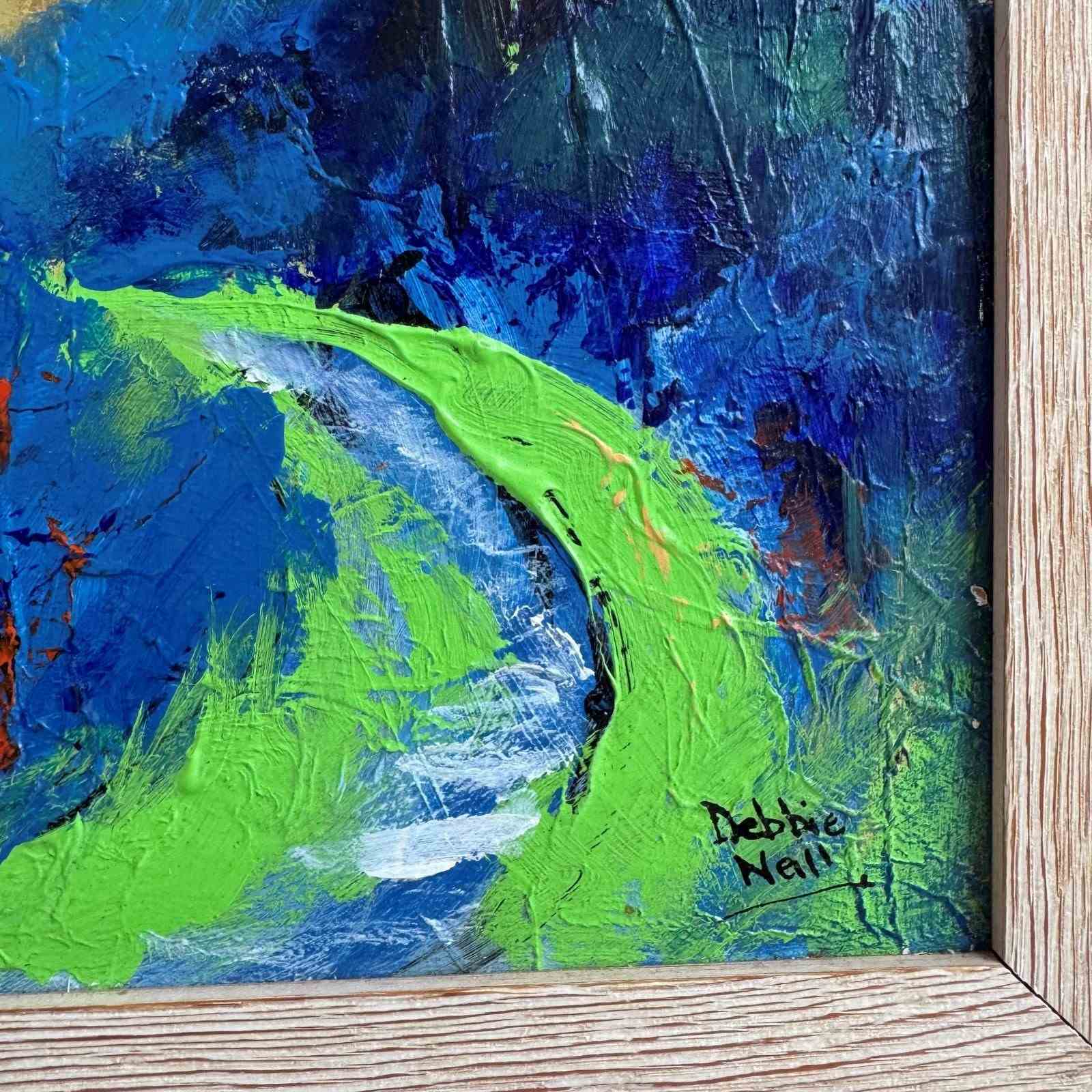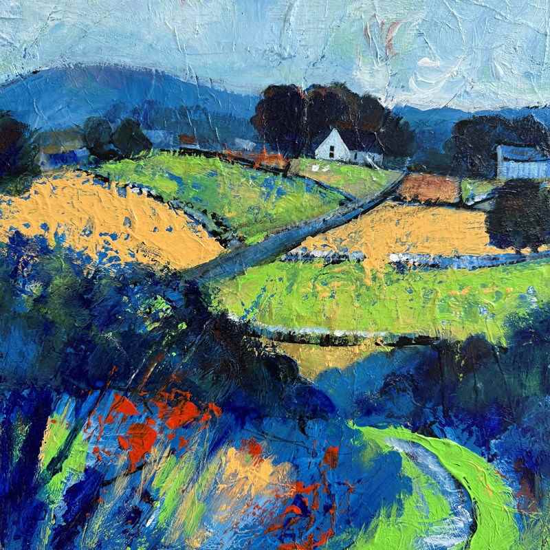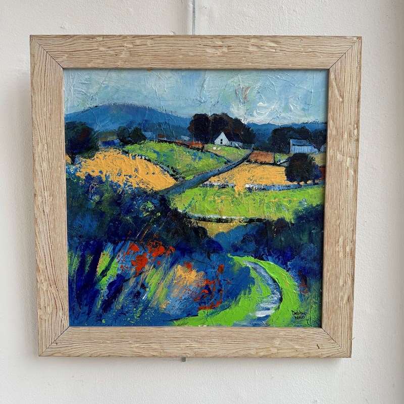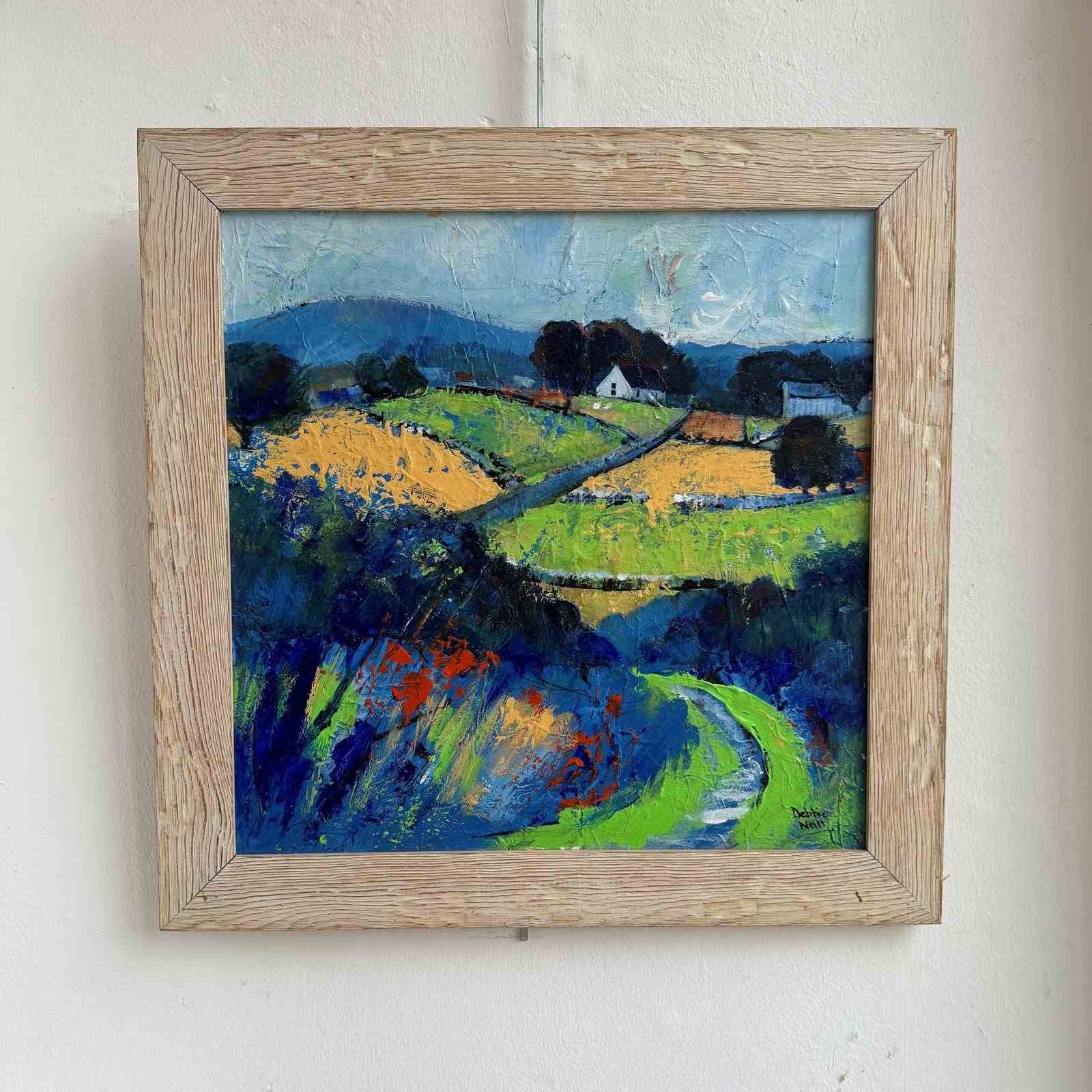 A charming contemporary colourful landscape painting, thick acrylics on board in a limed oak frame.