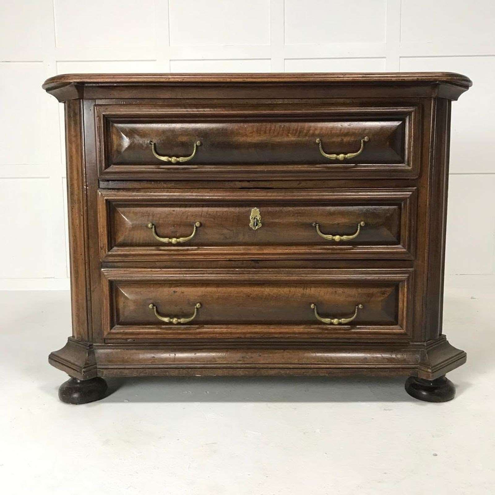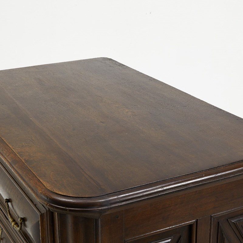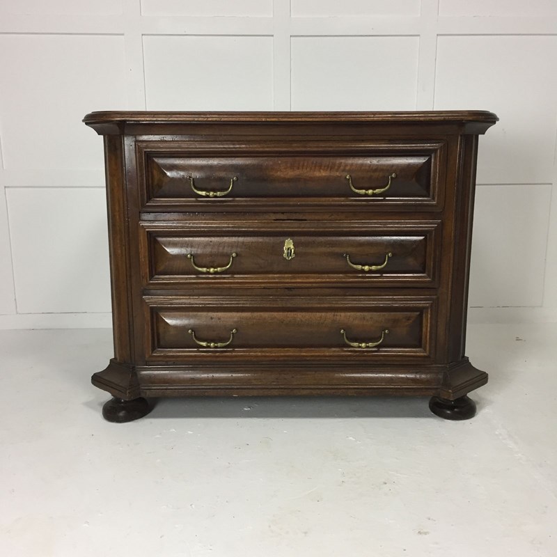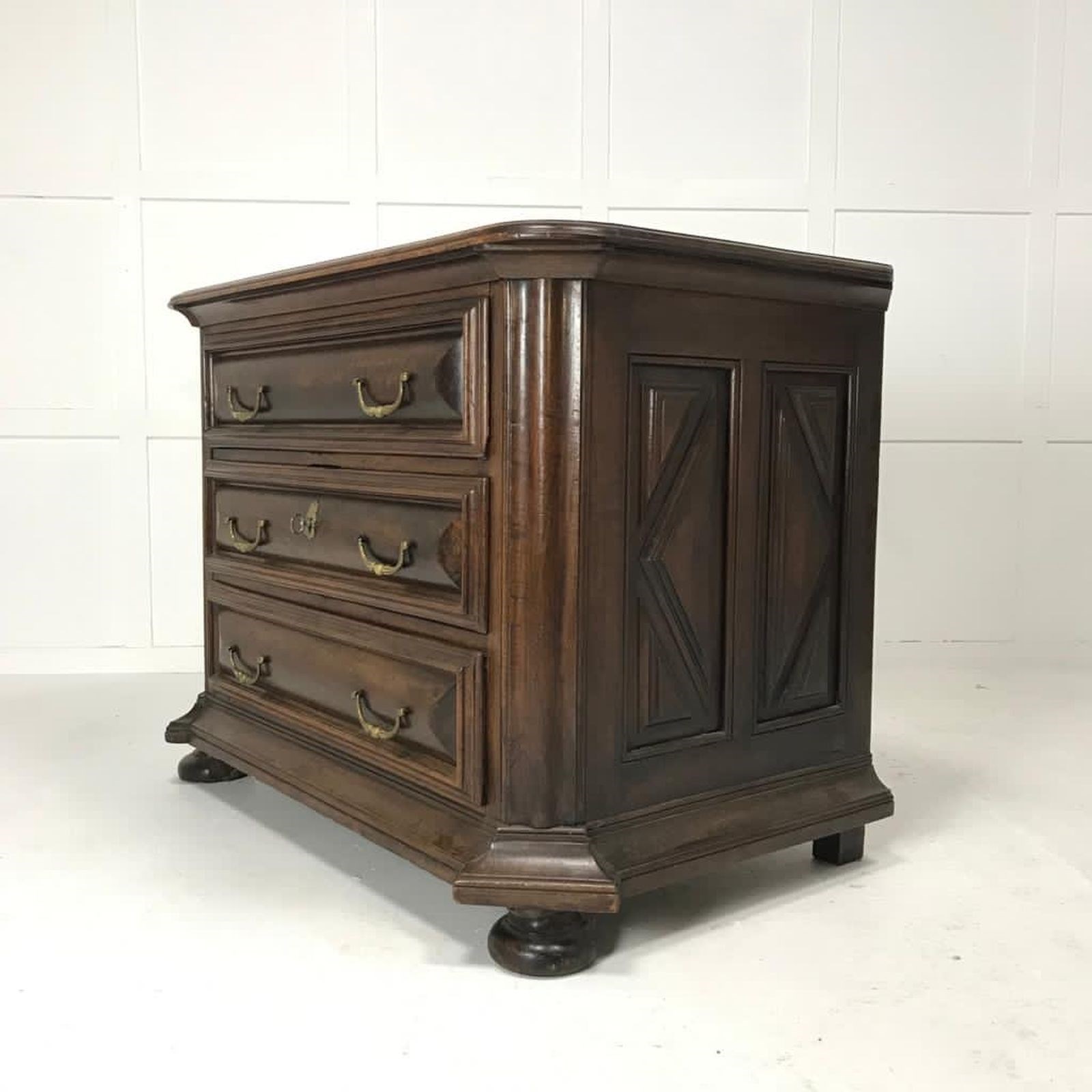 Early 18th Century French walnut commode, three drawer commode with carved geometric panels to the sides. Unusual shaped corners and tapering plinth resting on bun feet at the front and block feet at the rear. Brass handles and escutcheons.
