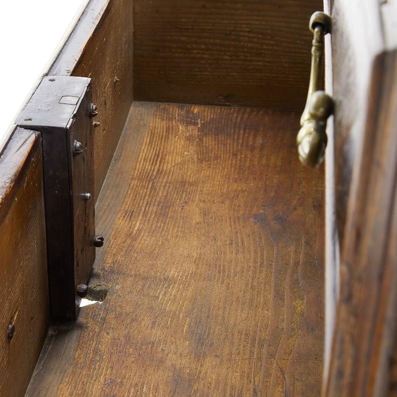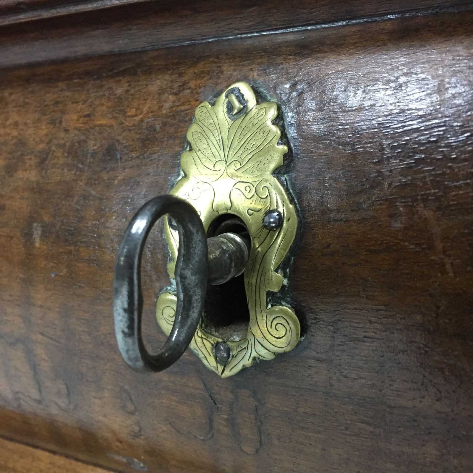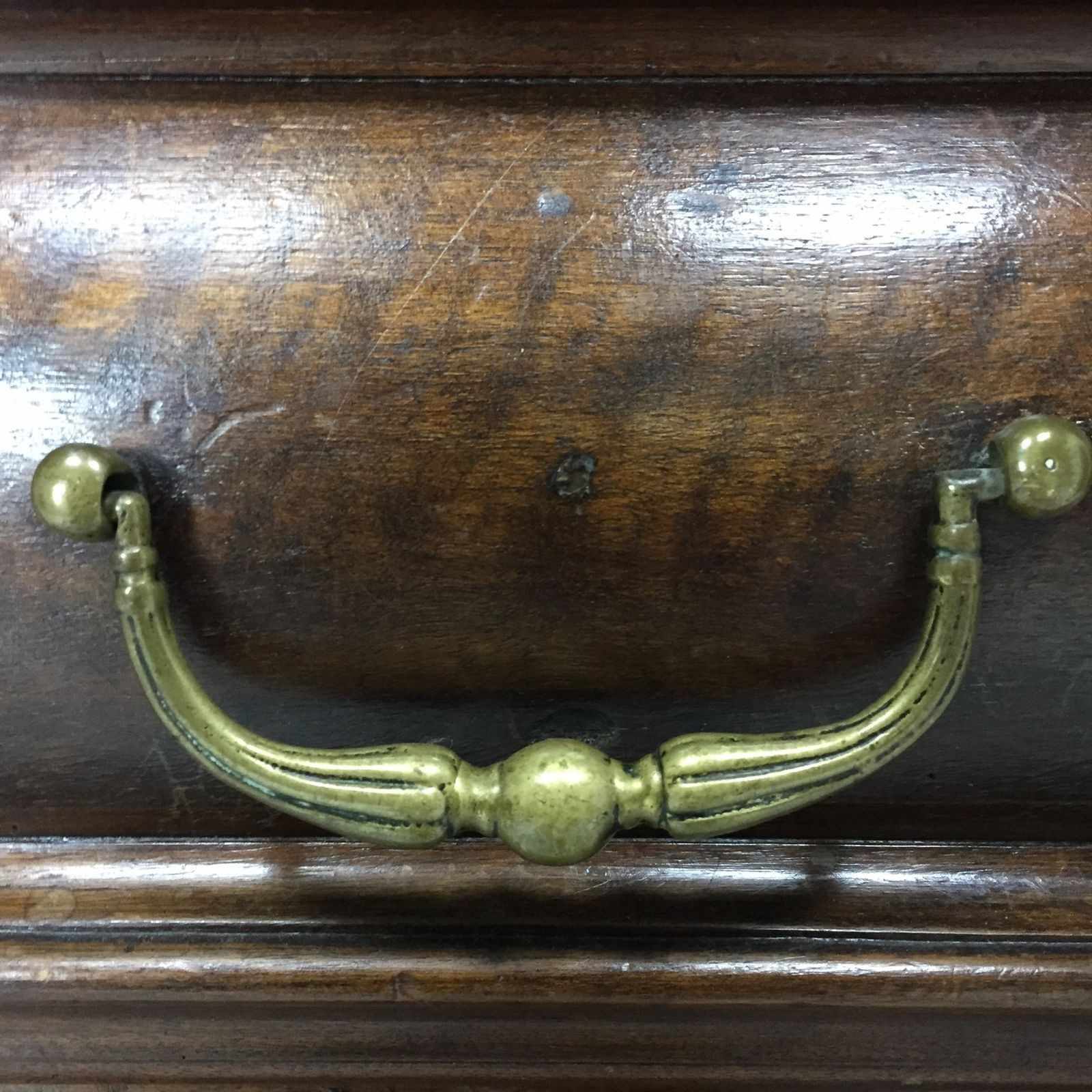 Early 18th Century French walnut commode, three drawer commode with carved geometric panels to the sides. Unusual shaped corners and tapering plinth resting on bun feet at the front and block feet at the rear. Brass handles and escutcheons.