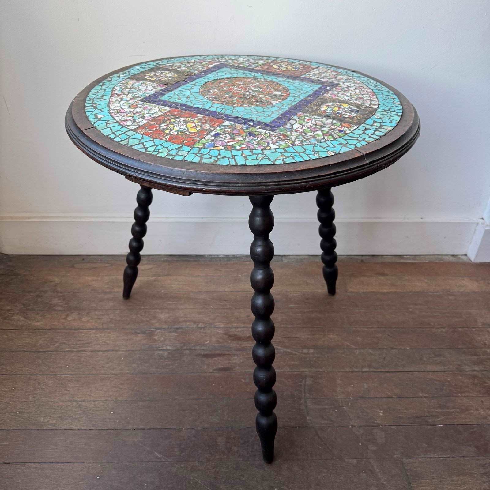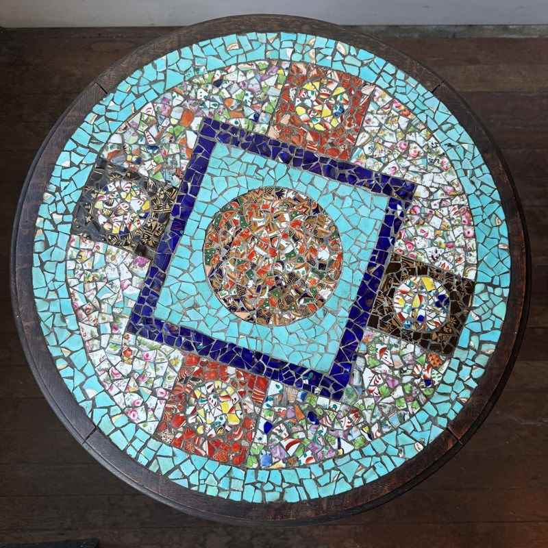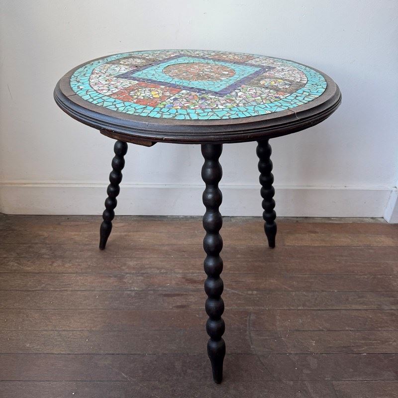 A colourful tiled mosaic tripod bobbin leg table. 19th century. English