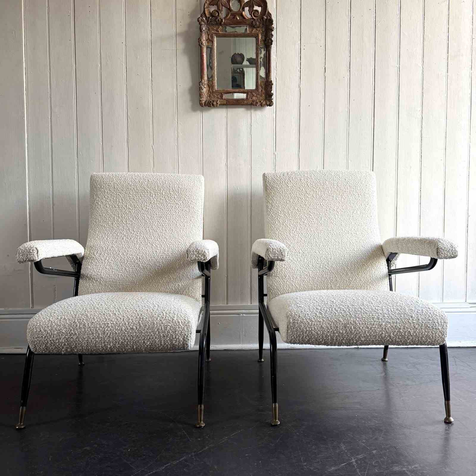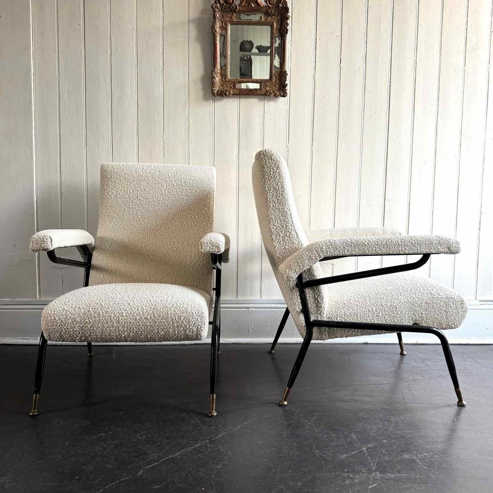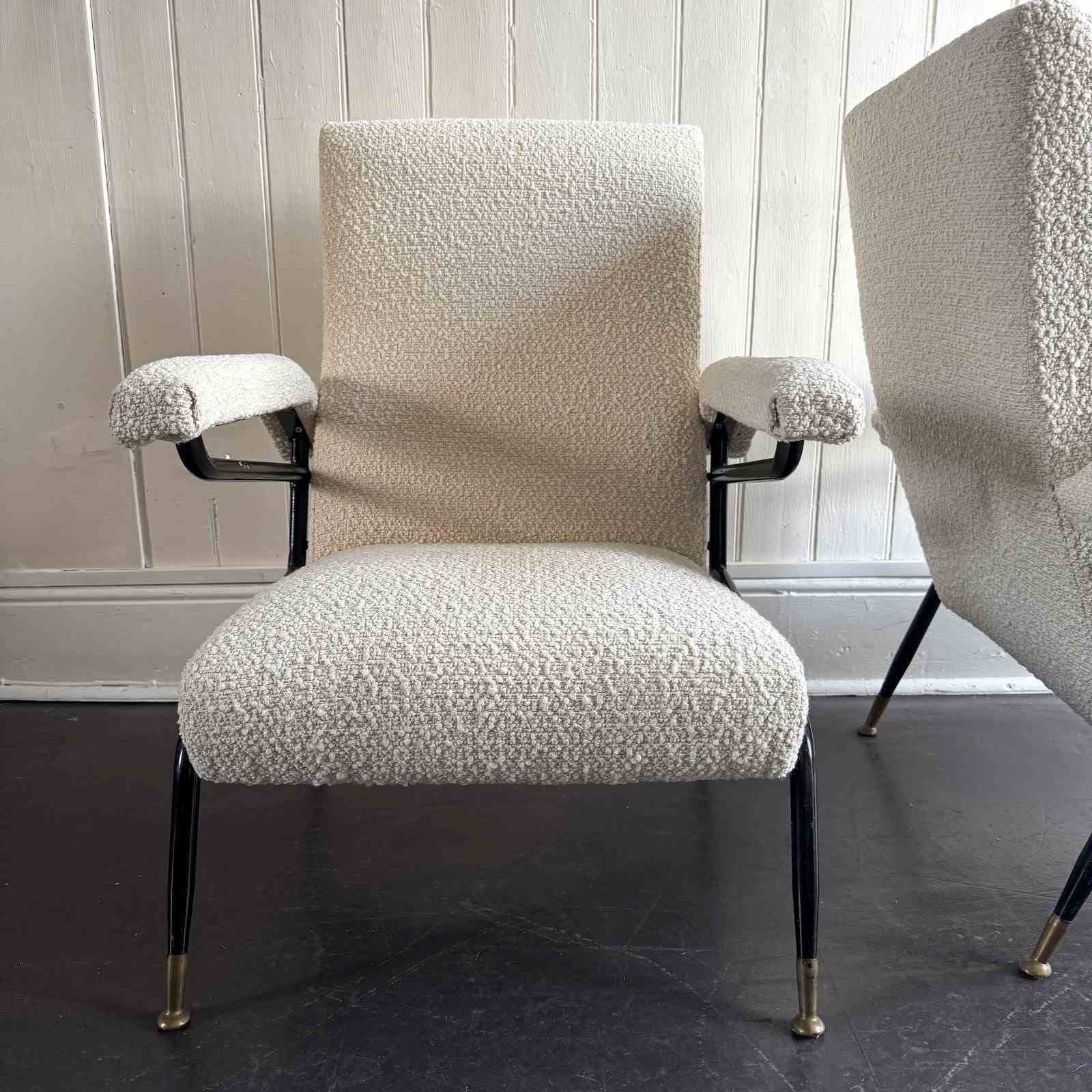 A pair of 1960s Italian metal framed armchairs upholstered in white bouclé, with round brass feet.