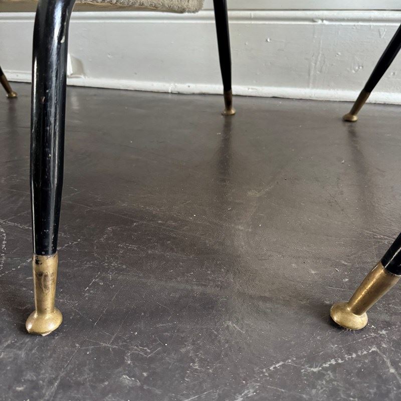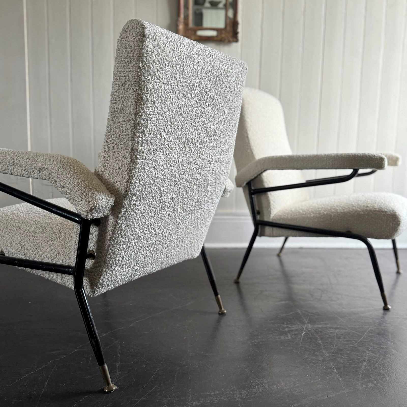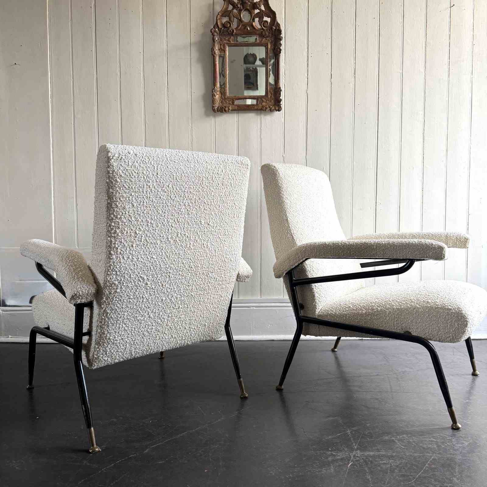 A pair of 1960s Italian metal framed armchairs upholstered in white bouclé, with round brass feet.