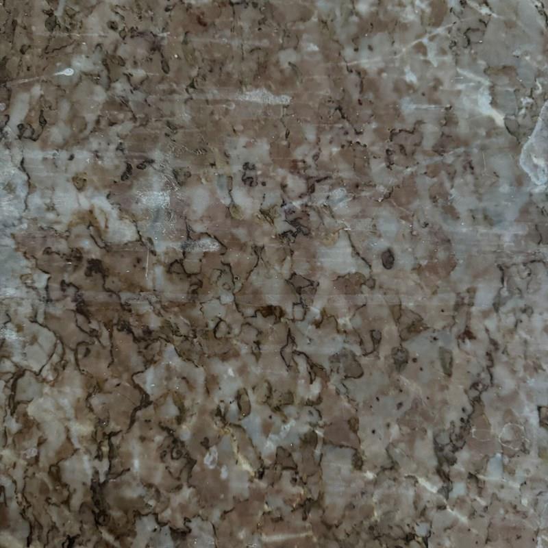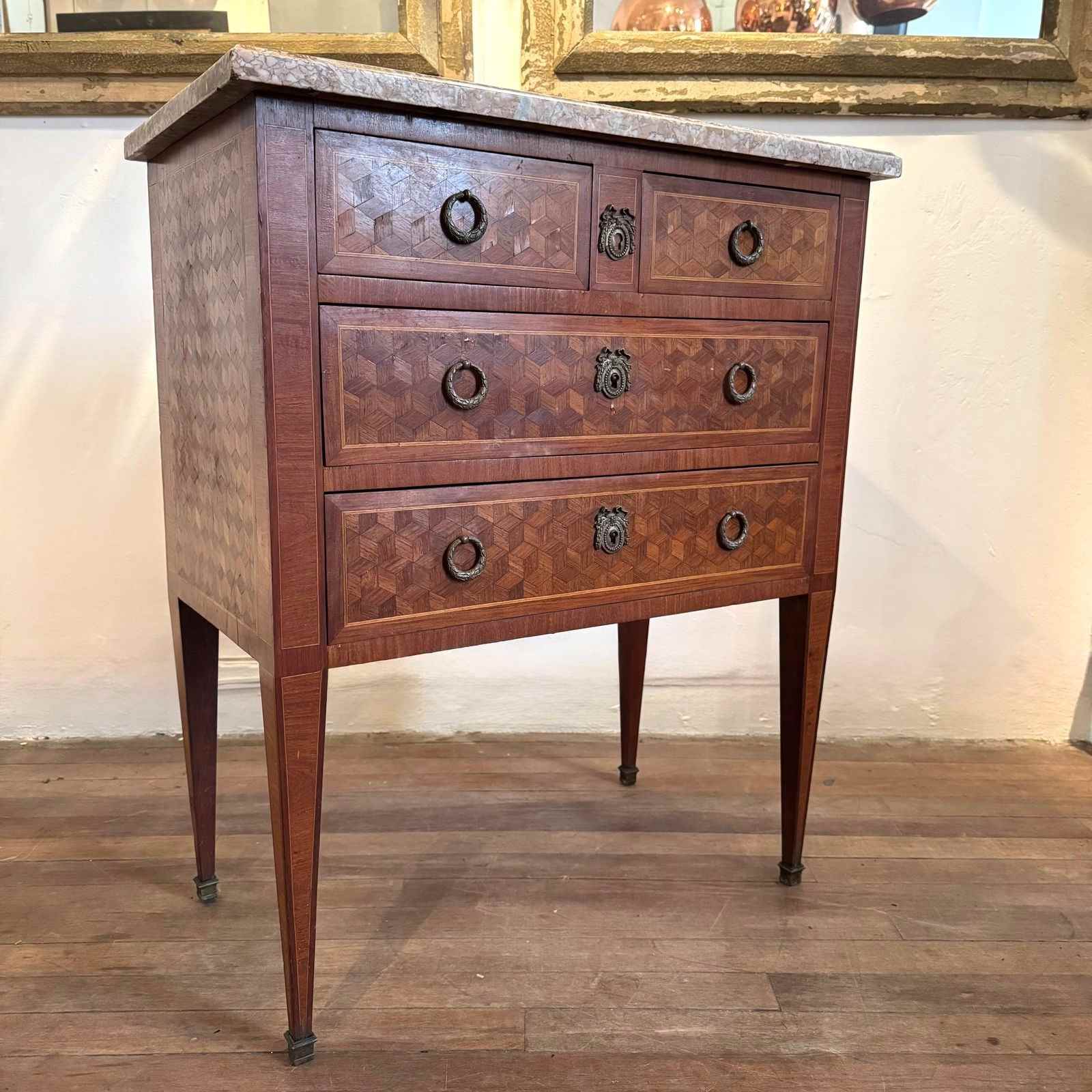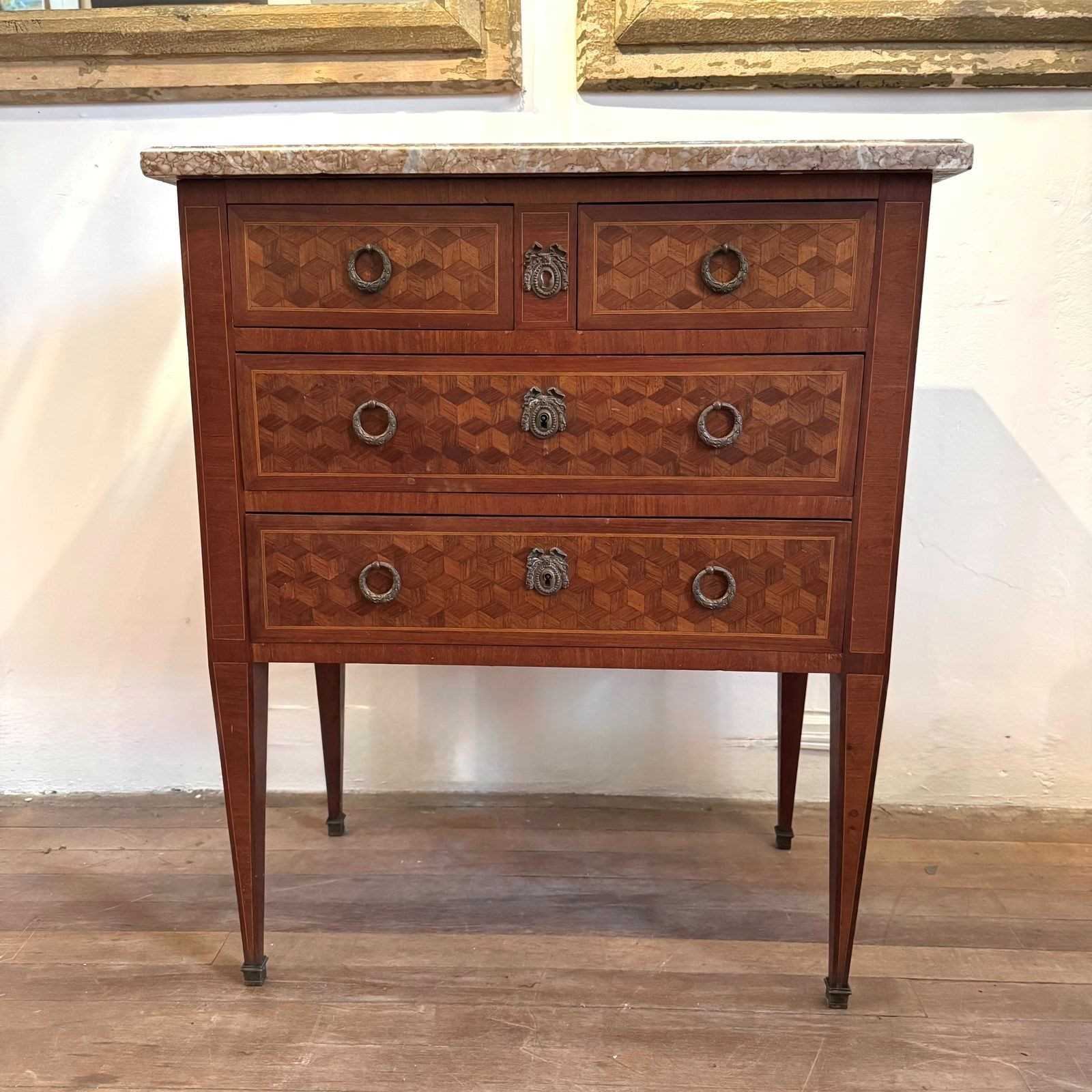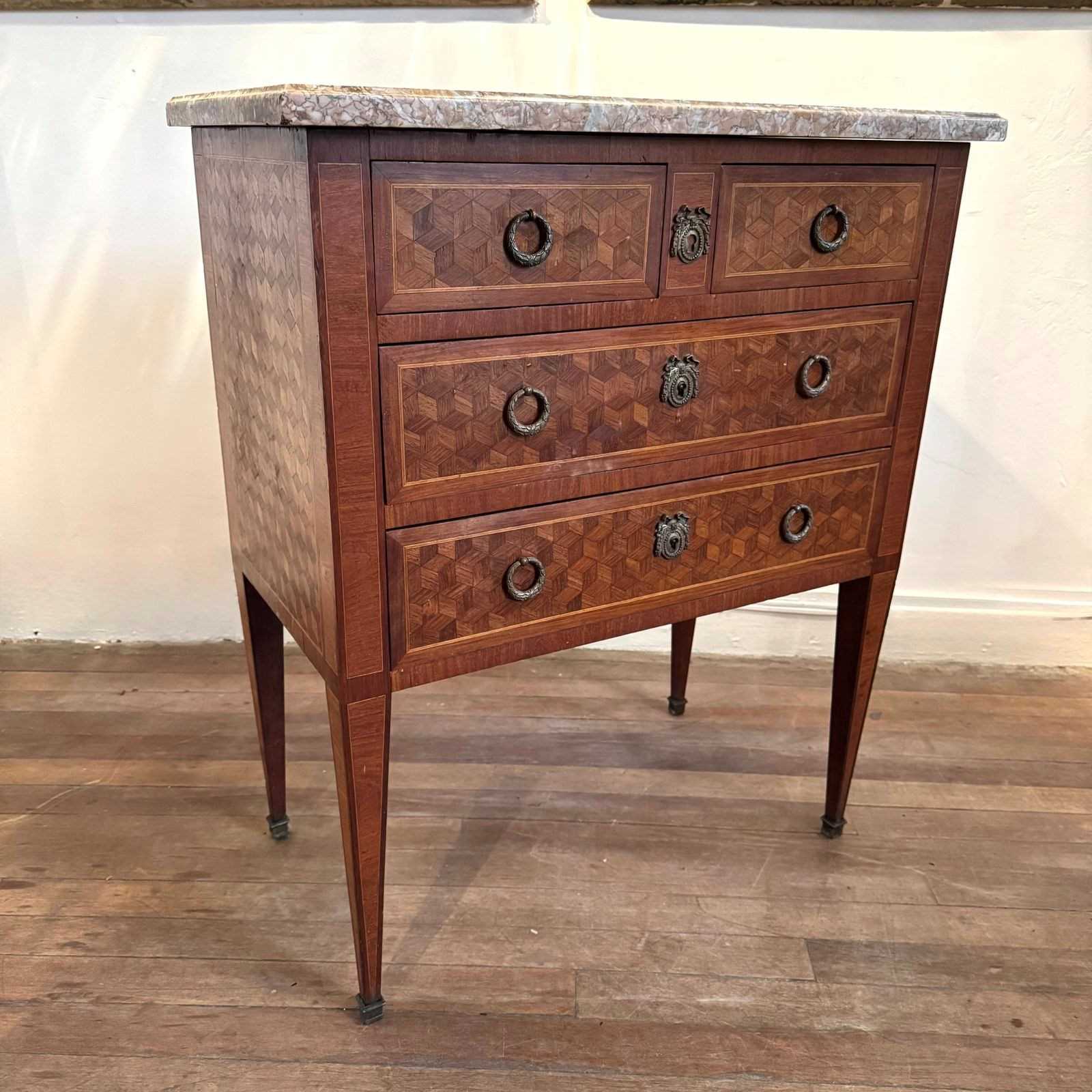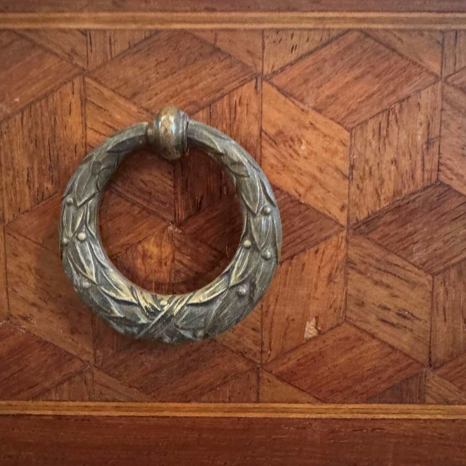 20th century French Parquetry three drawer commode round brass pull handles with a marble top. C. 1920s