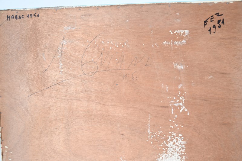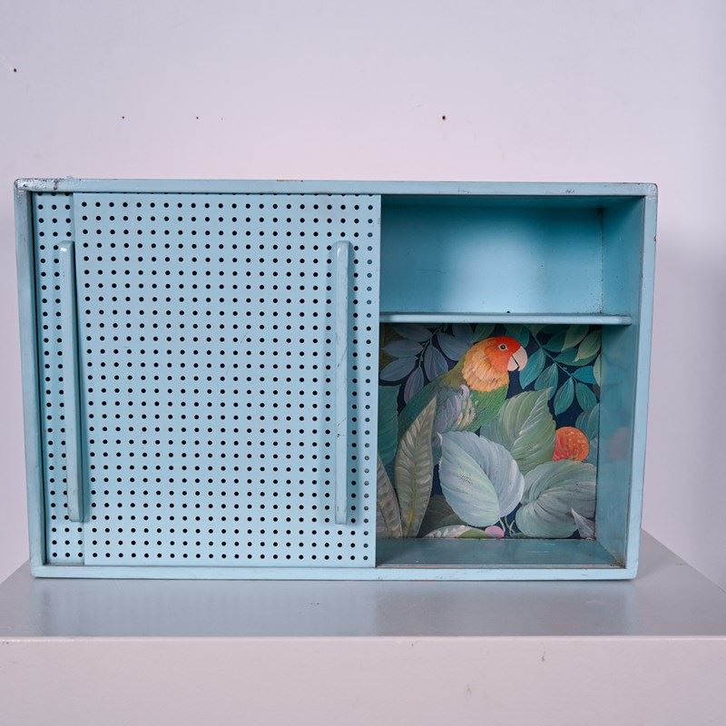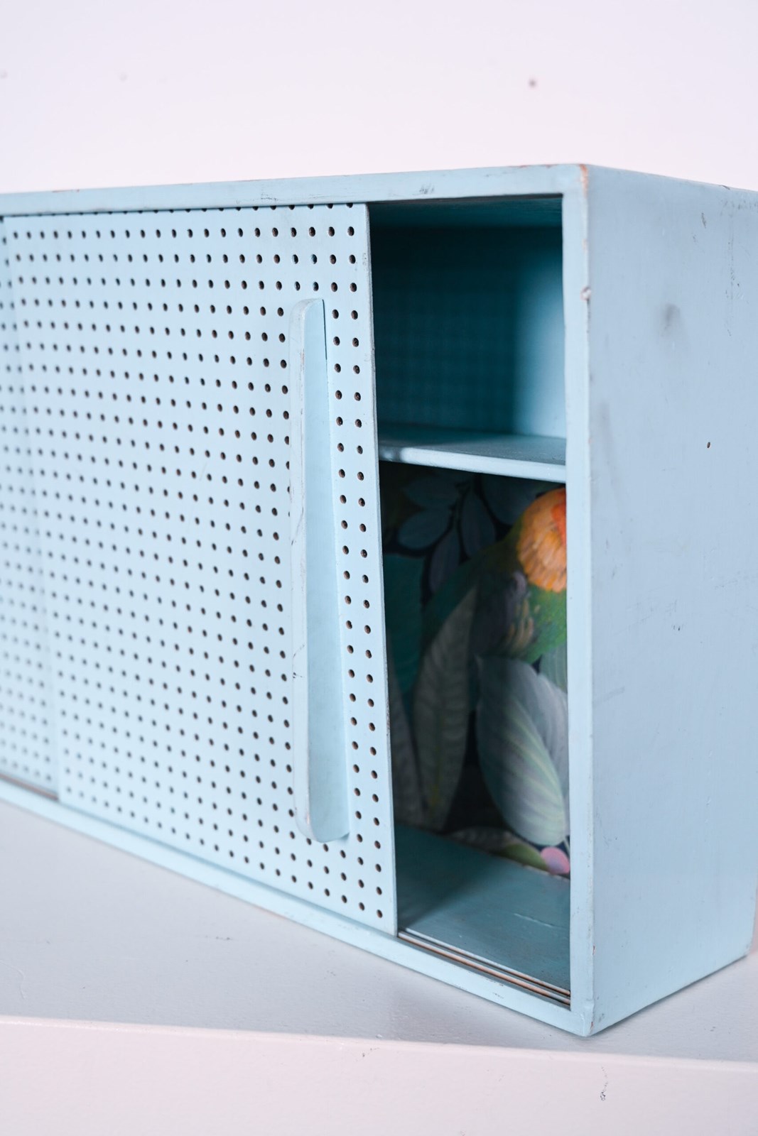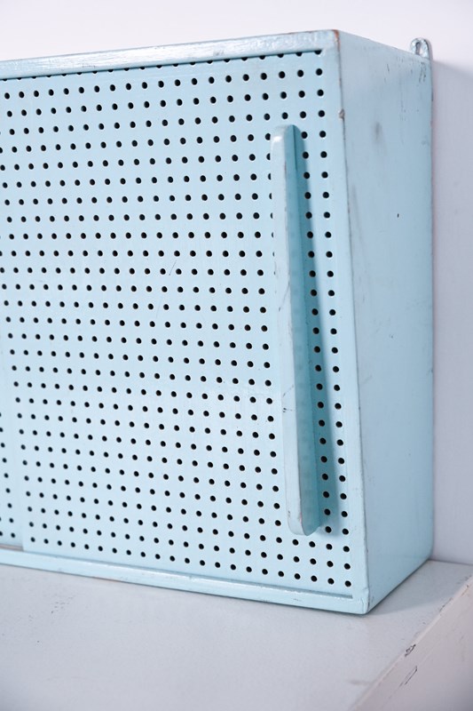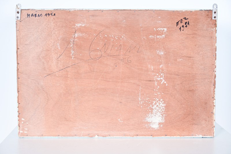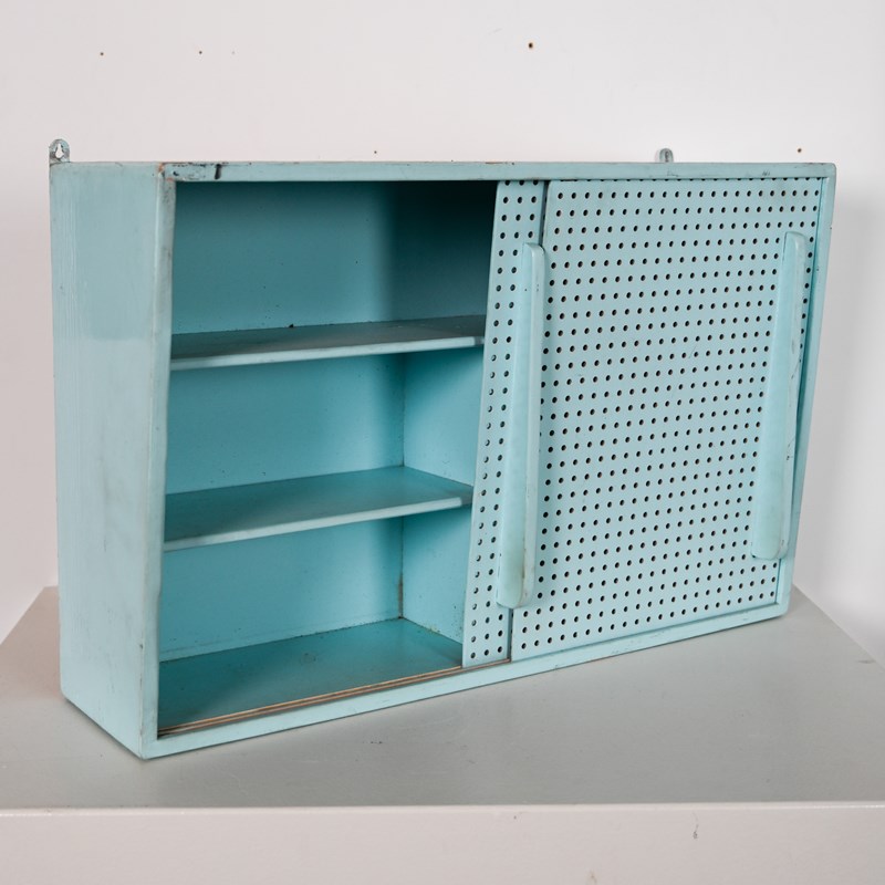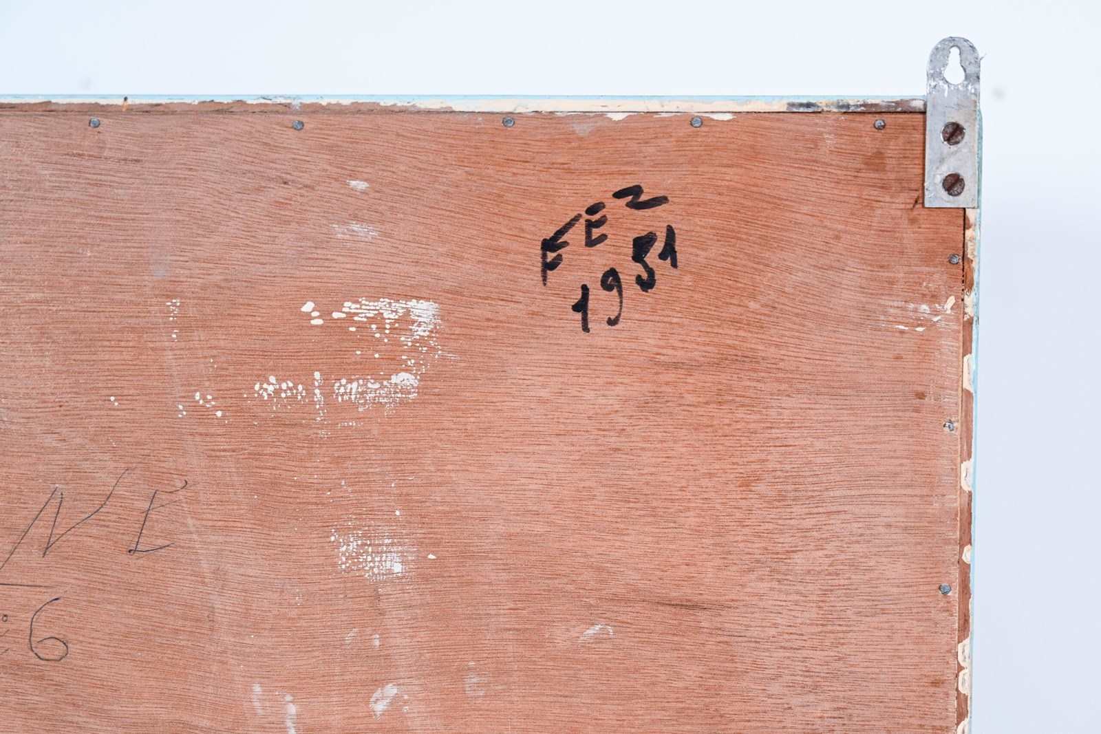 Mid-century painted wooden wall cupboard with sliding pierced doors and open shelving, inscribed to the reverse “1951 – Fez, Morocco.” The cupboard’s simple geometric form, elongated wooden pulls and perforated sliding panels give it a distinctly modernist character, reflecting the functional design language that was emerging across Europe in the post-war period.