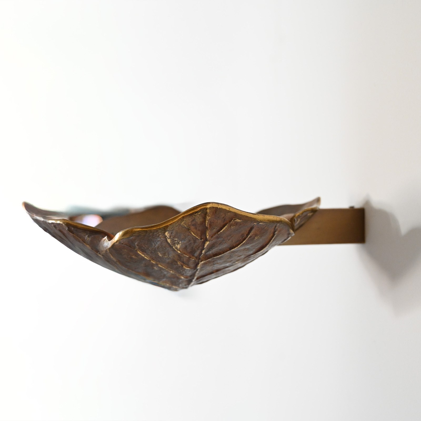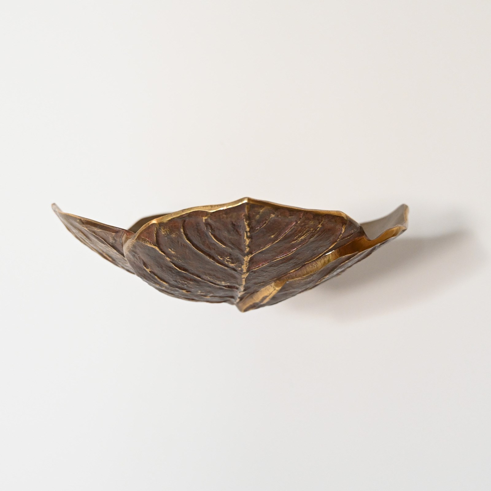 In the form of a stylised leaf, deeply modelled with pronounced veining and a gently animated silhouette. The bronze is finished in a rich, dark patina, selectively heightened with gilded accents along the ribs and edges — a sophisticated contrast that became characteristic of Maison Charles under Chrystiane Charles’ creative direction during the post-war period.