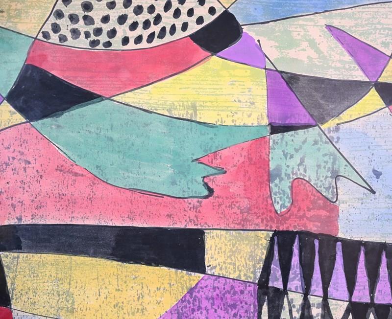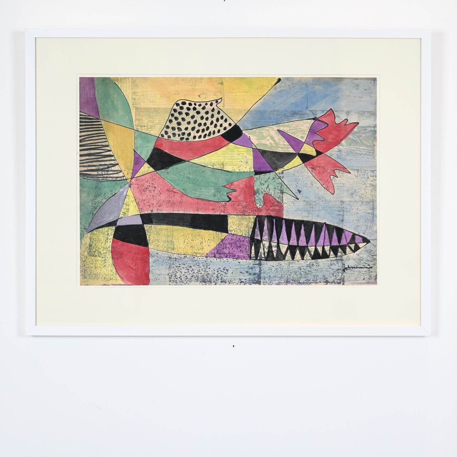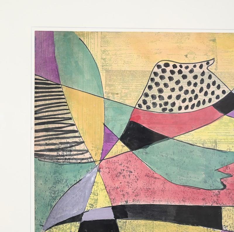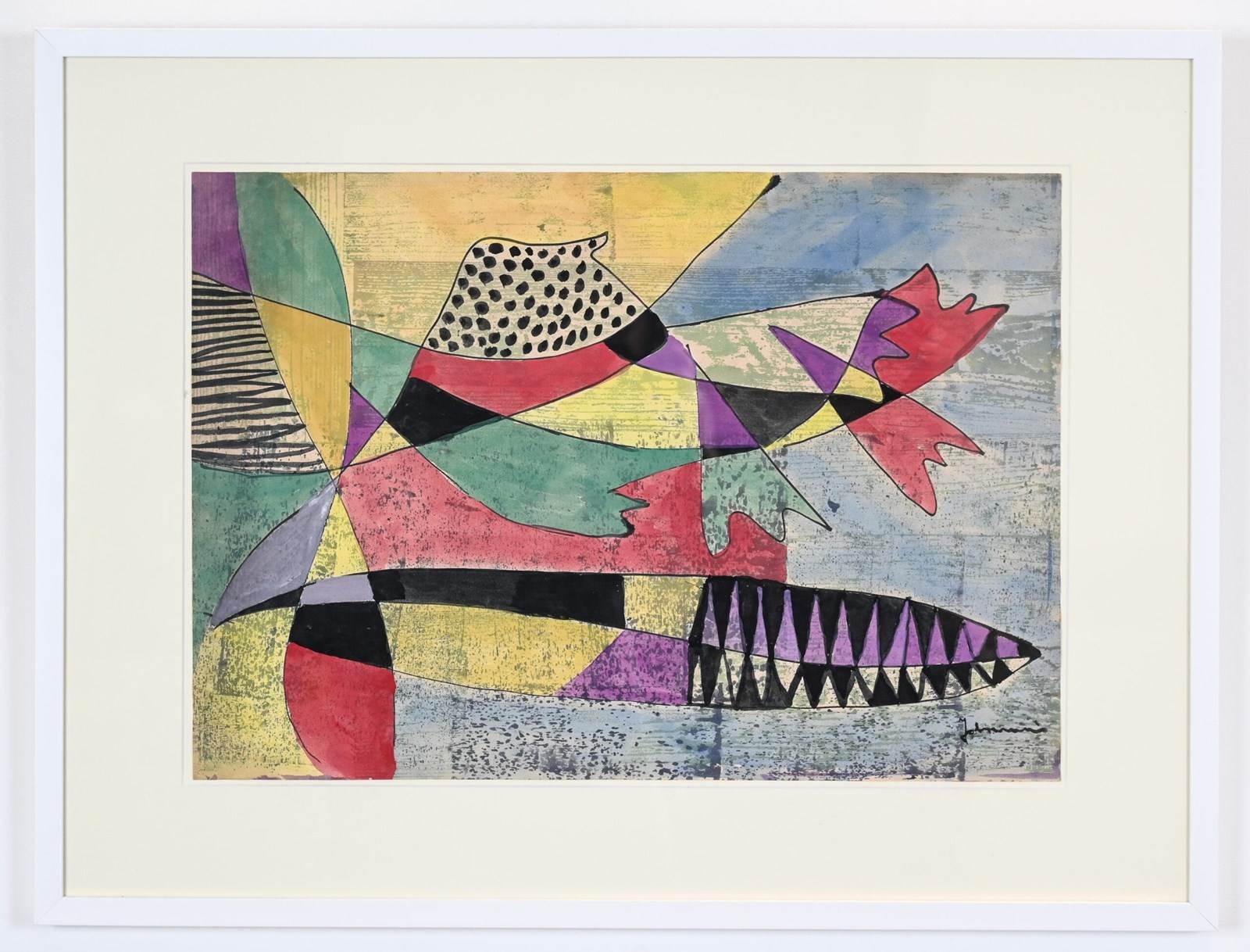 The work reflects Brenneis’s close engagement with the legacy of Paul Klee and Joan Miró, evident in the segmented picture plane, animated surface textures and the tension between order and spontaneity. The palette—cool blues and greens offset by warmer reds, ochres and violets—is characteristic of his early-1950s works on paper, widely regarded as the most refined and resolved of his career.