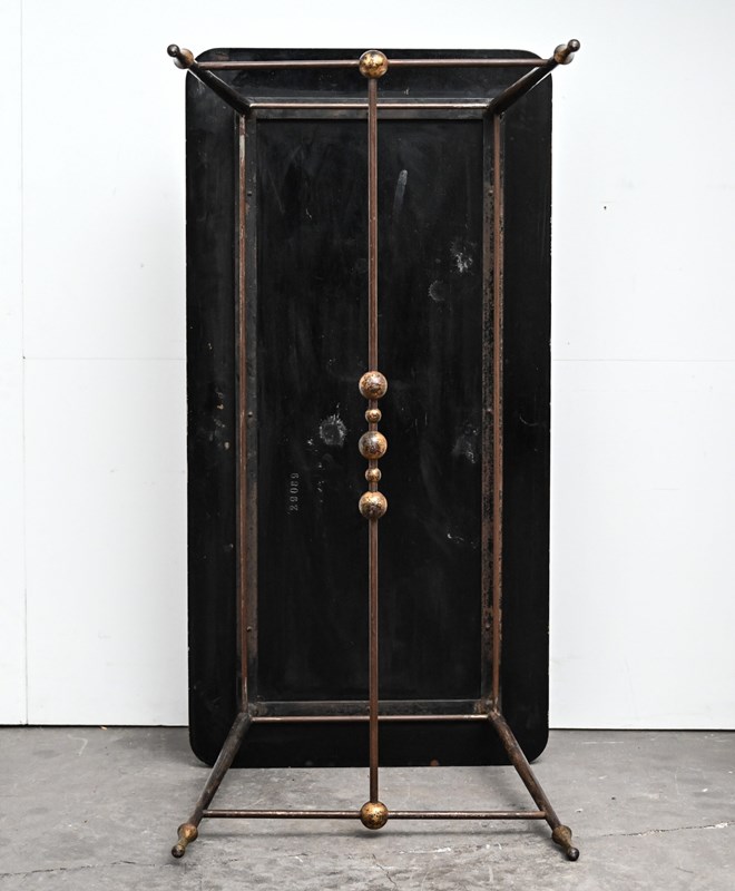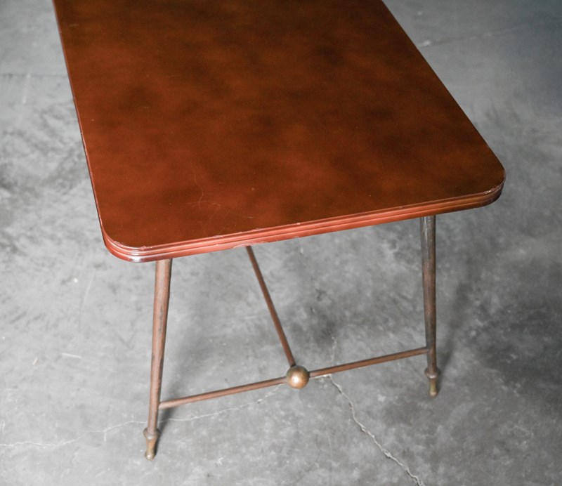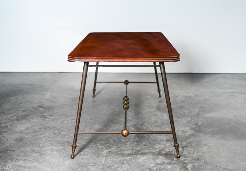 The table is constructed with a slender patinated iron base enriched with gilt-bronze detailing, supporting an original mottled “acajou tabac” nitrocellulose lacquer top. This distinctive finish, developed by Leleu for Mediterranean interiors, is prized for its warmth, depth, and subtle tonal variation, designed to respond to natural light rather than present a uniform gloss.