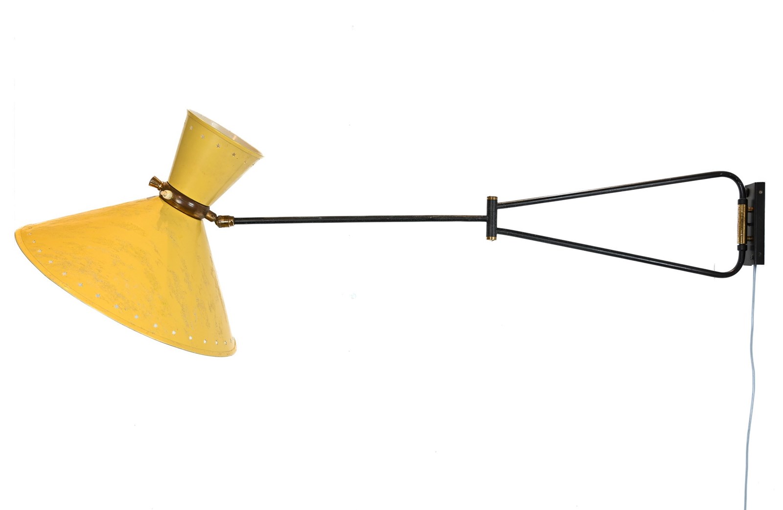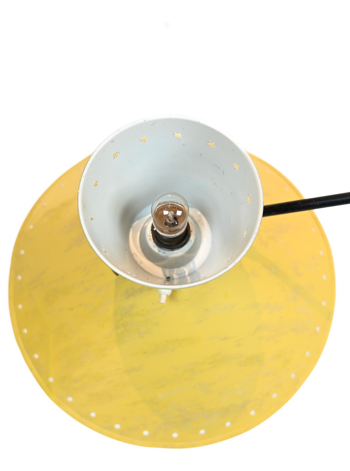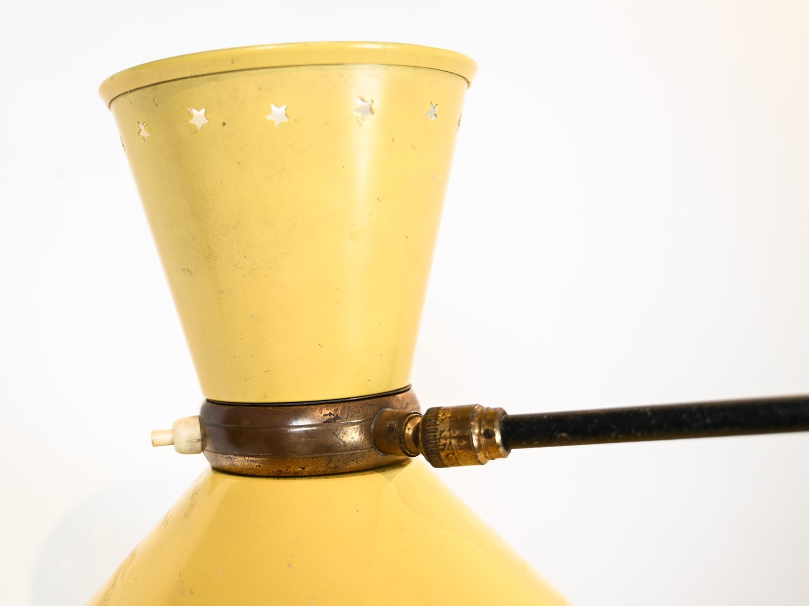 This elegant design features a yellow lacquered double-cone (diabolo) shade with star-shaped perforations around the rim — a distinctive Lunel detail. The shade is mounted on a black enameled metal swing arm with brass joints and fittings, allowing smooth horizontal and vertical adjustment.