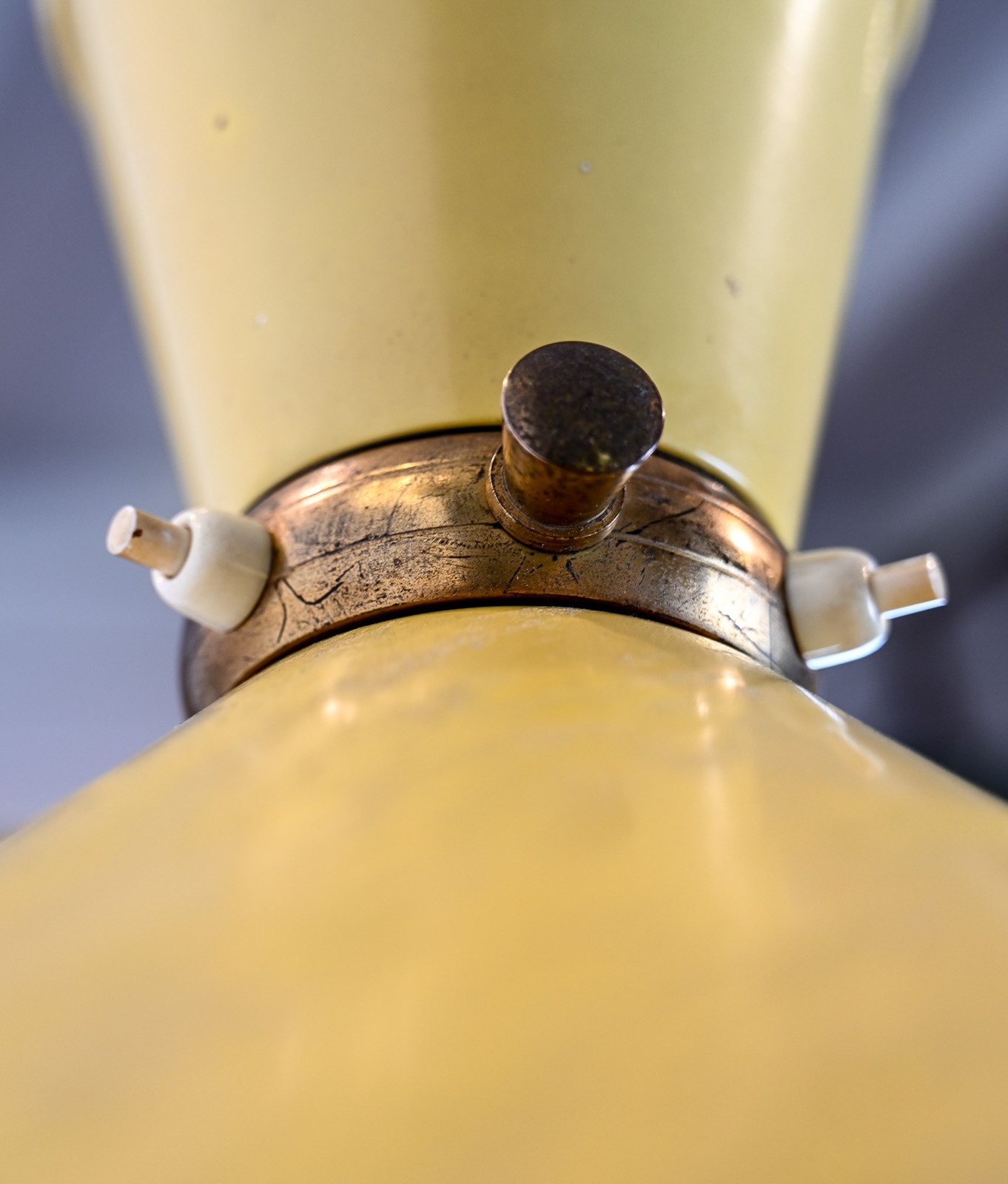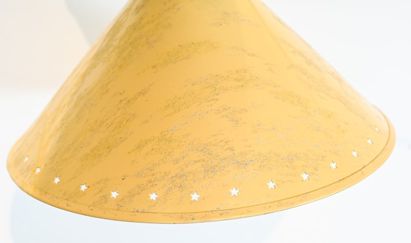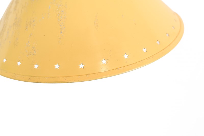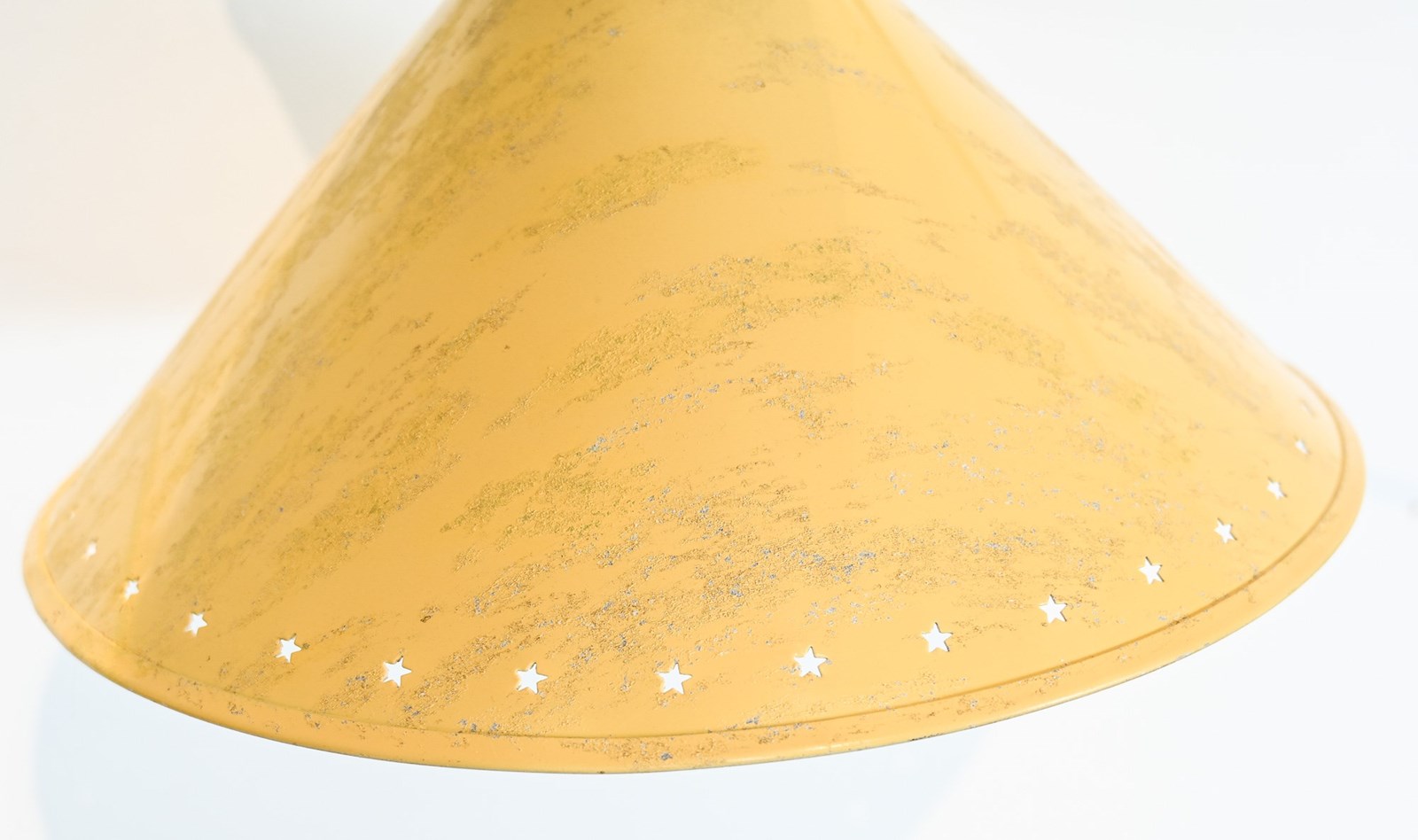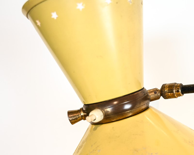 This elegant design features a yellow lacquered double-cone (diabolo) shade with star-shaped perforations around the rim — a distinctive Lunel detail. The shade is mounted on a black enameled metal swing arm with brass joints and fittings, allowing smooth horizontal and vertical adjustment.