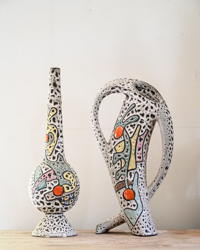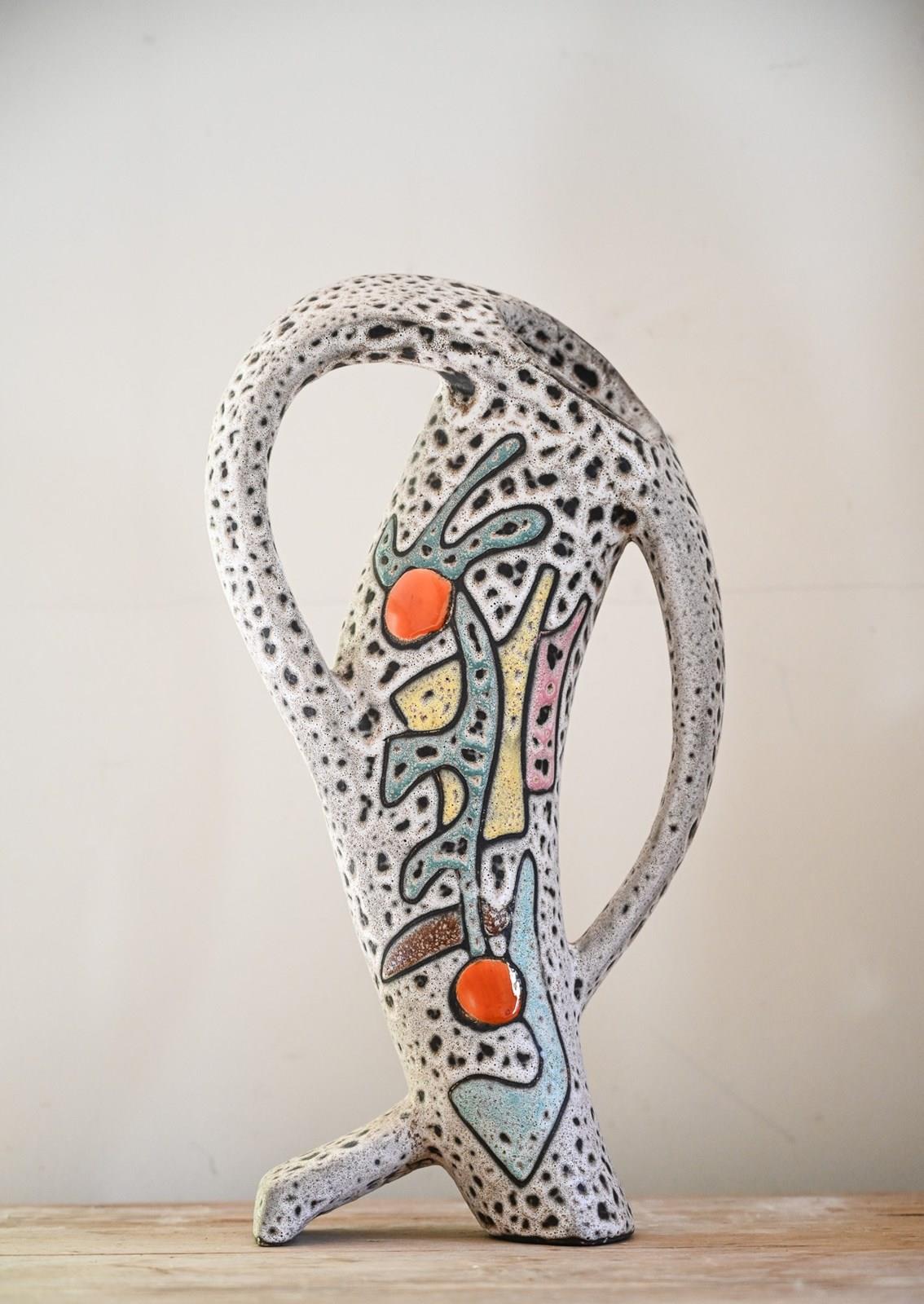 This unique, hand-built form twists elegantly with a pierced handle, its volcanic lava-like glaze punctuated by vibrant abstract motifs in turquoise, yellow, pink and vivid orange enamel.