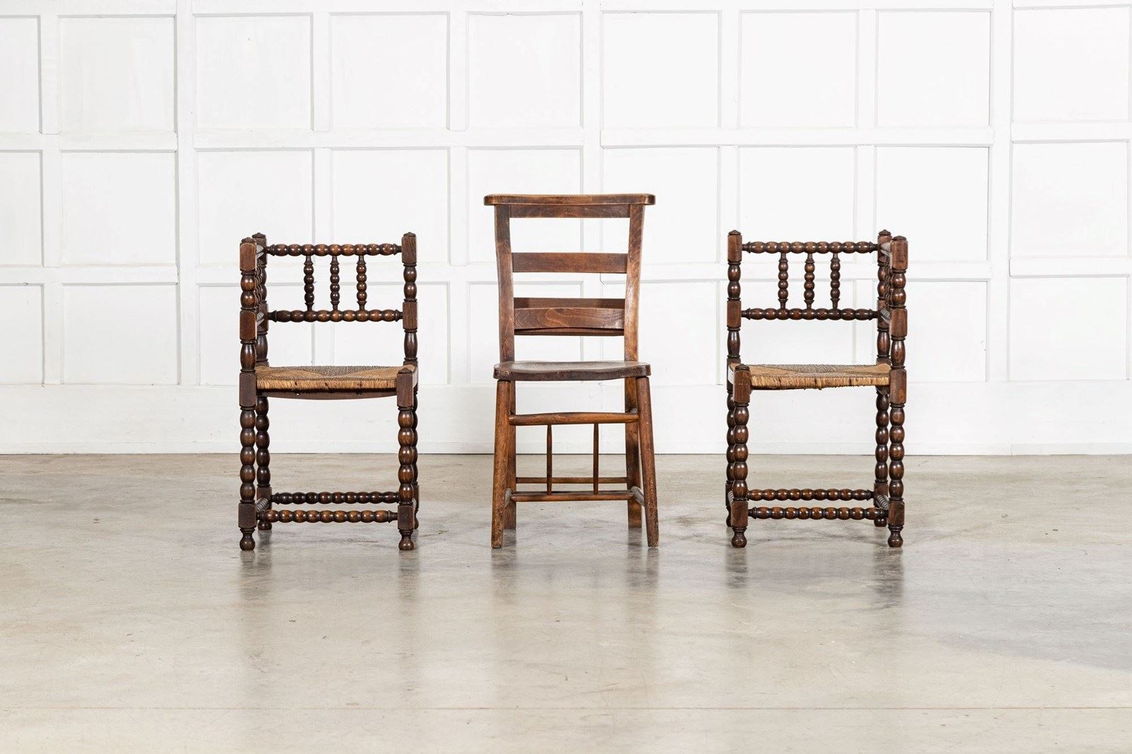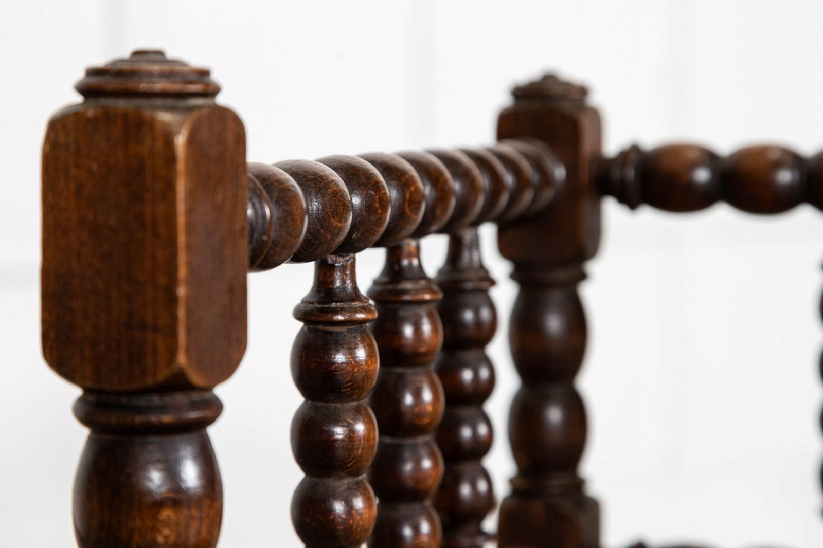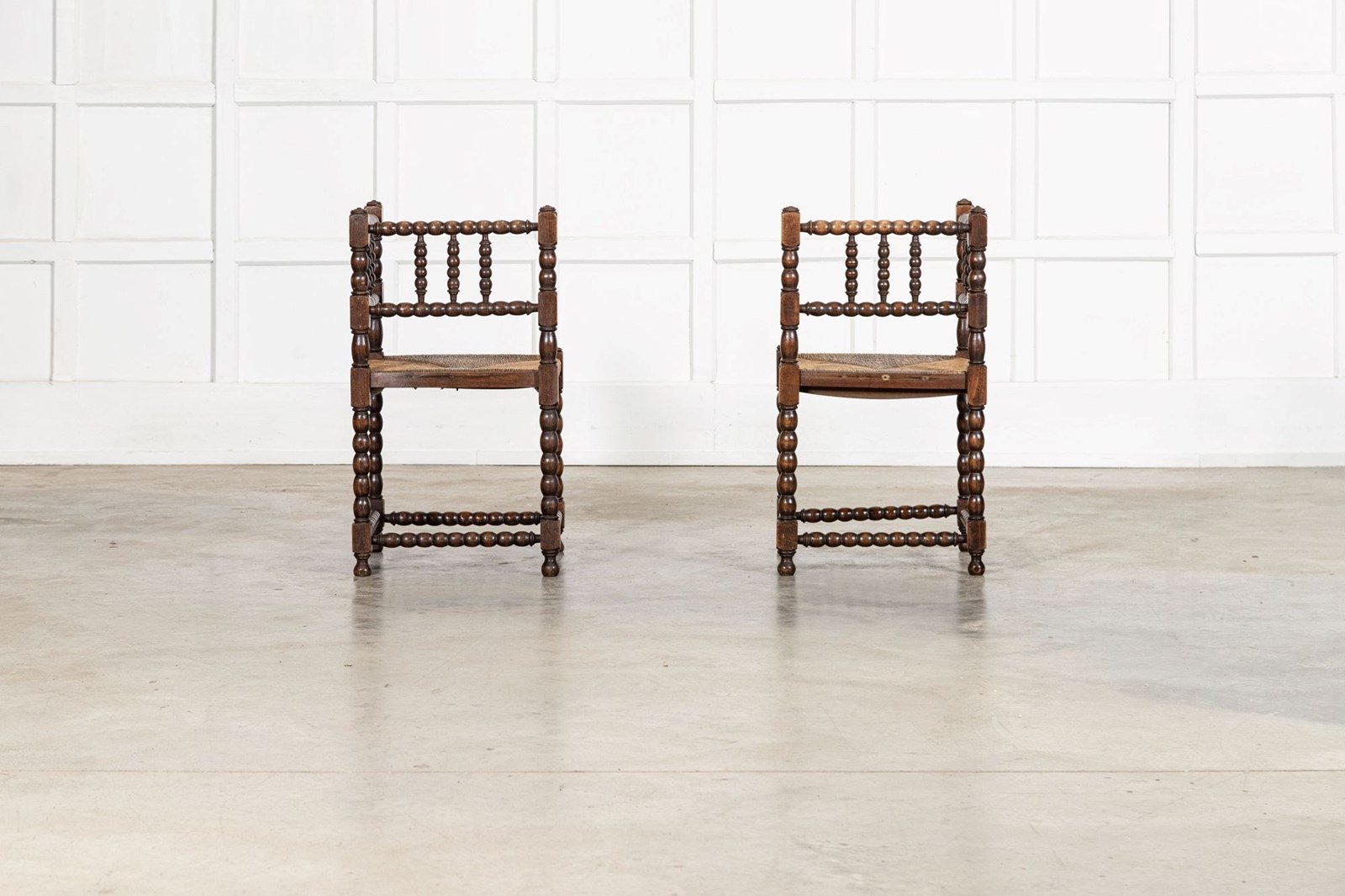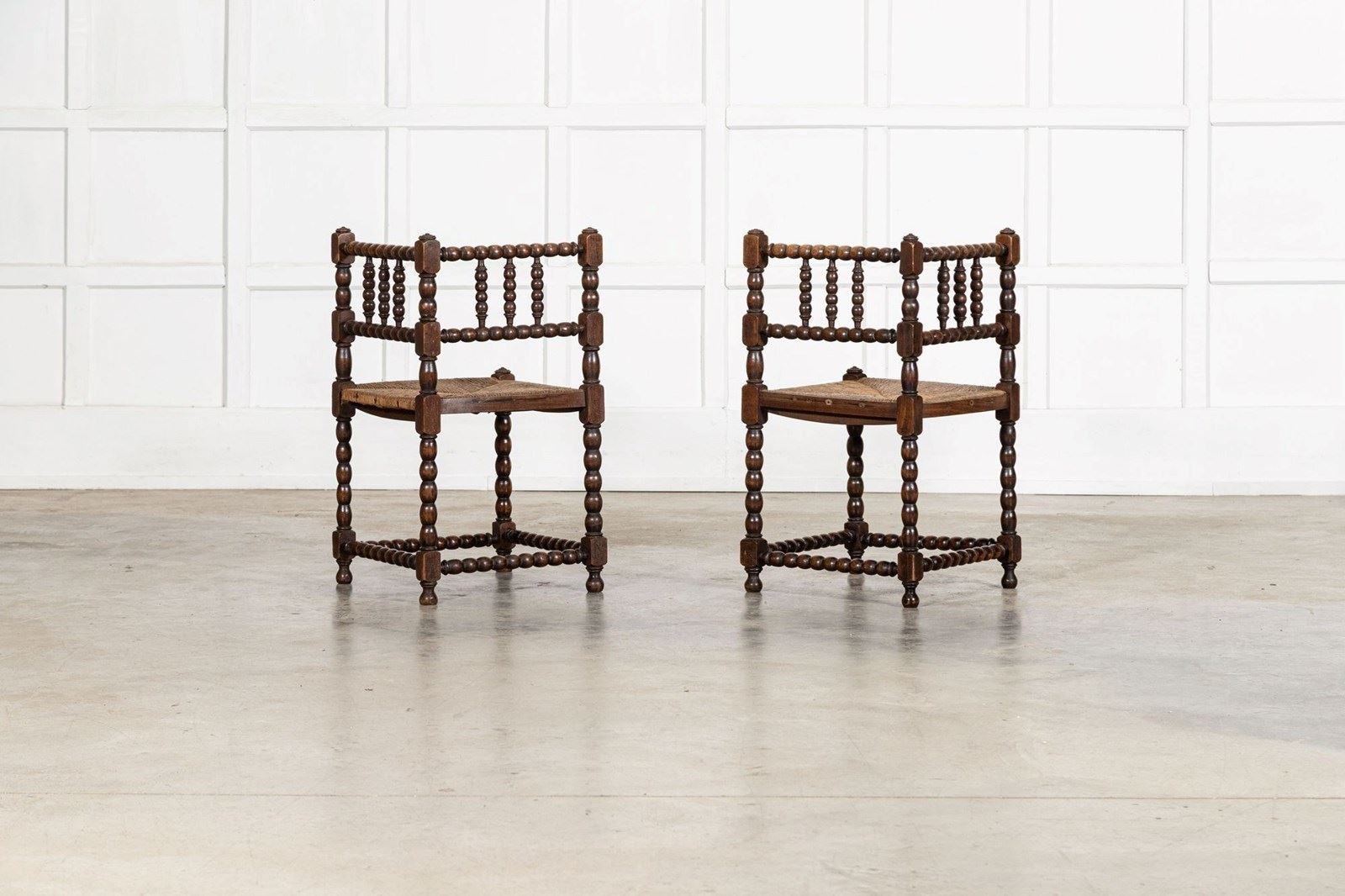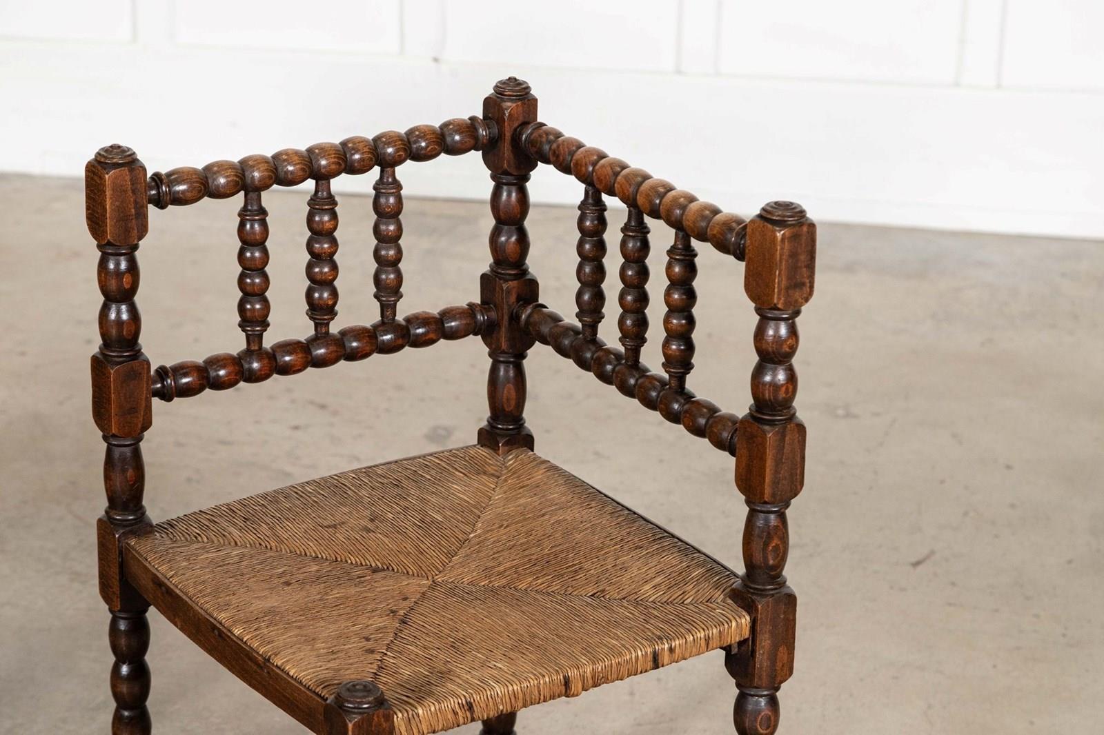 Pair English 19thC Beech Bobbin Corner Chairs