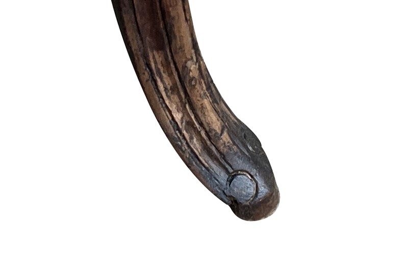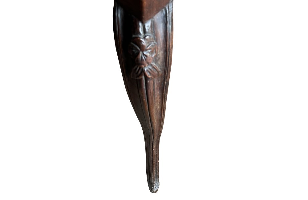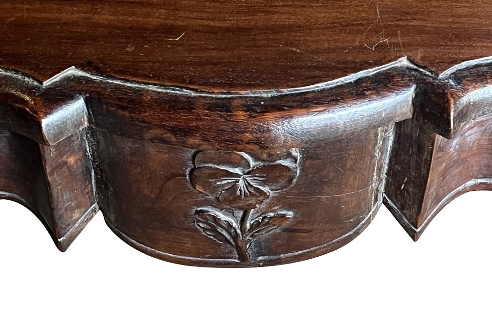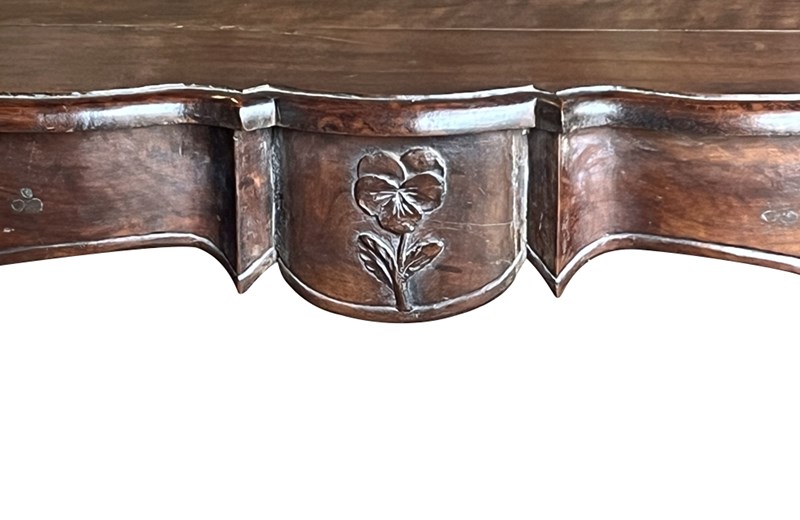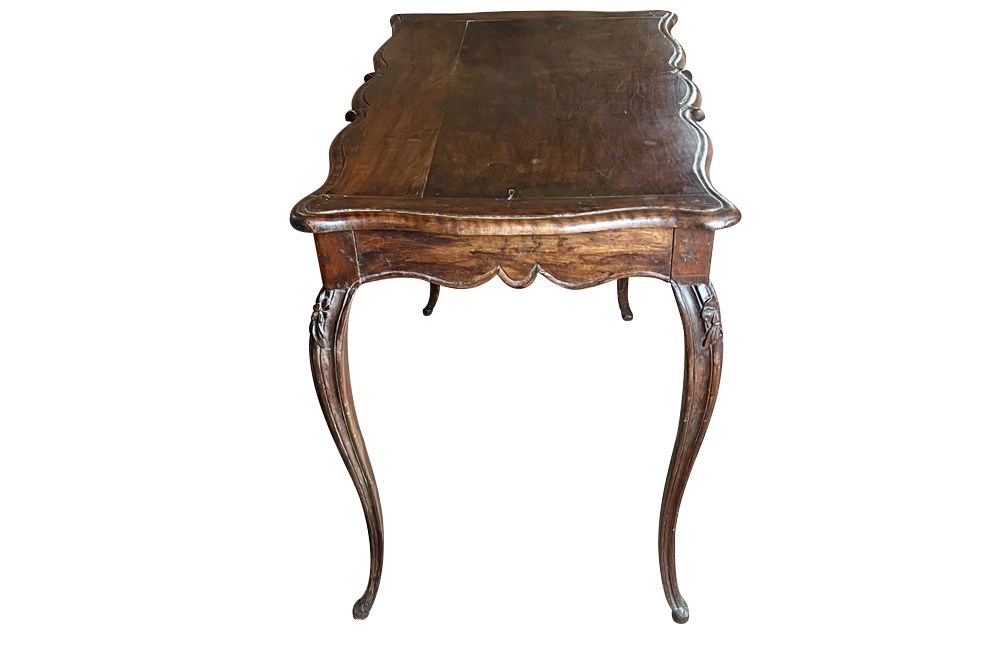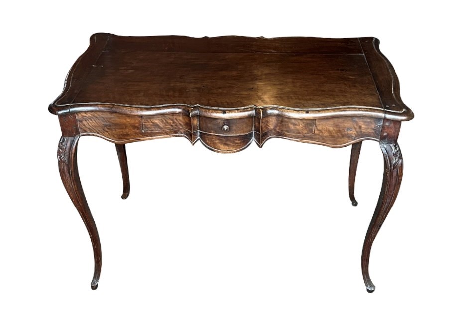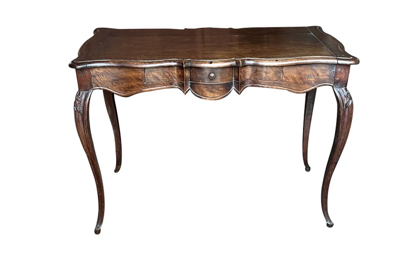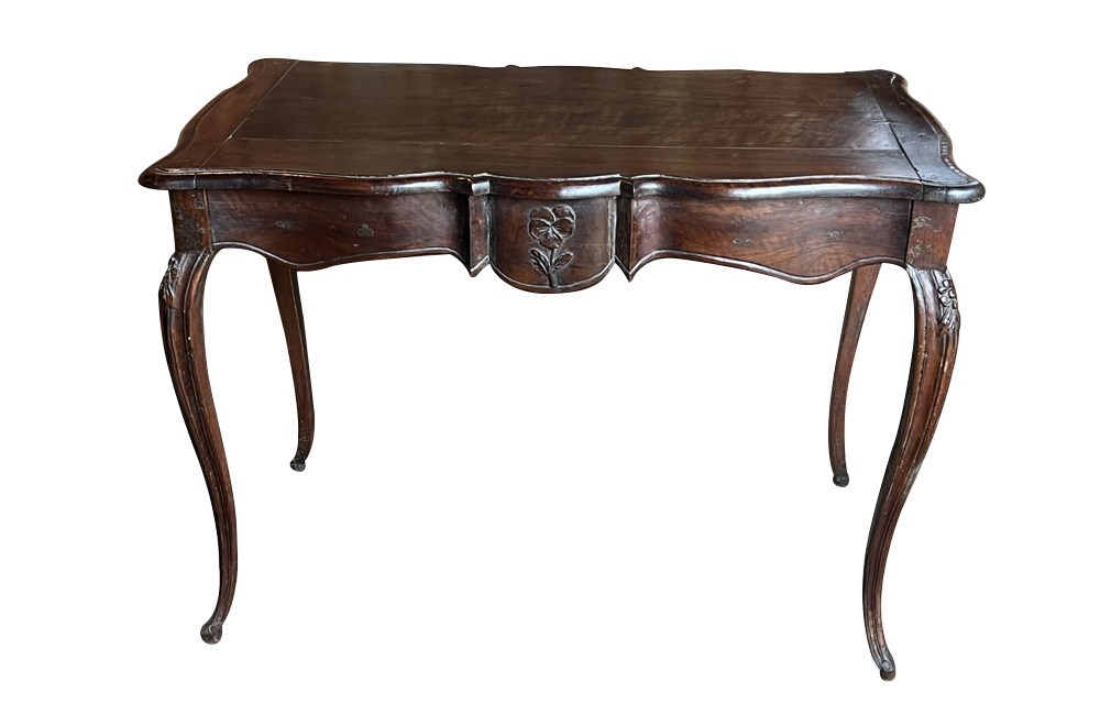 Of refined serpentine form and raised on slender cabriole legs terminating in shaped feet. The flowing lines of the apron and sides reflect the graceful character of the Louis XV period. The desk incorporates a single discreet drawer set within the frieze. To the opposite side, the shaped apron is centred with a finely carved pansy motif, an unusual and charming decorative element that adds individuality and subtle symbolism to the design. The richly figured walnut displays warm colour and attractive grain throughout. Subtle carved floral ornament to the legs enhances the elegant proportions of the piece.