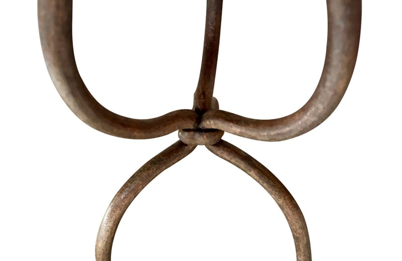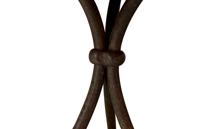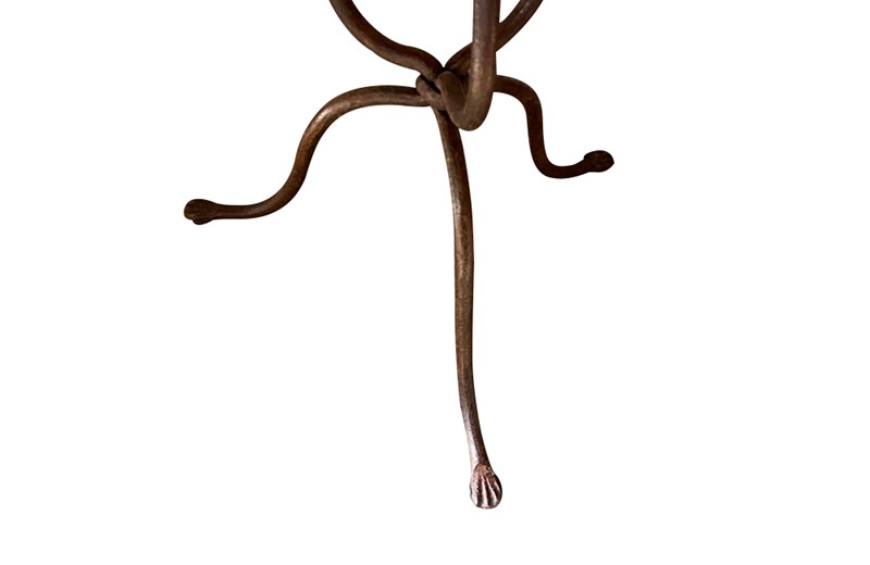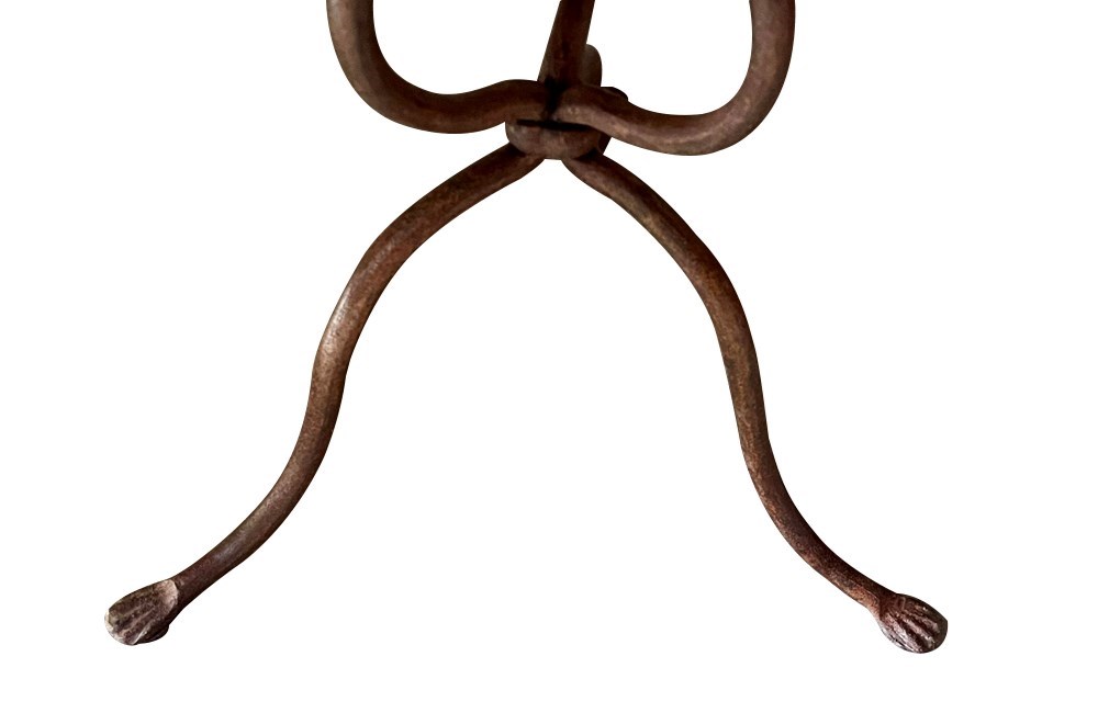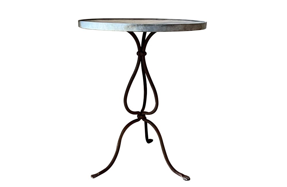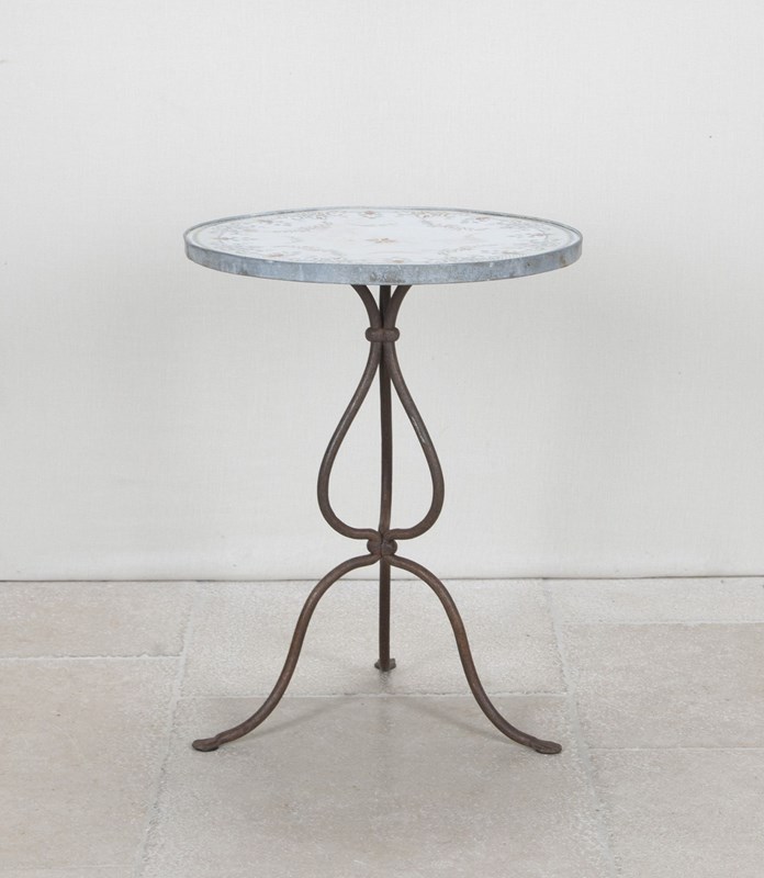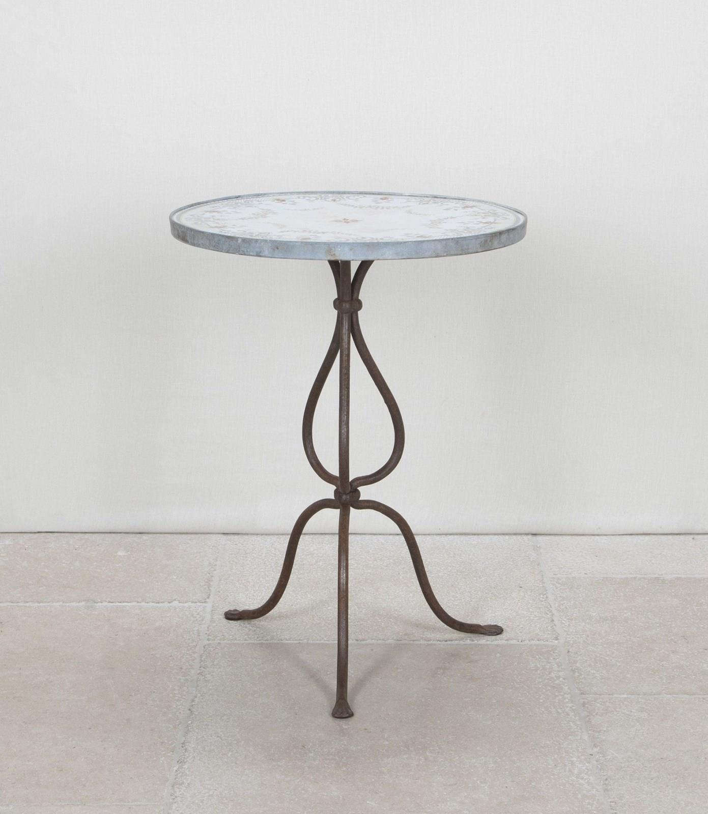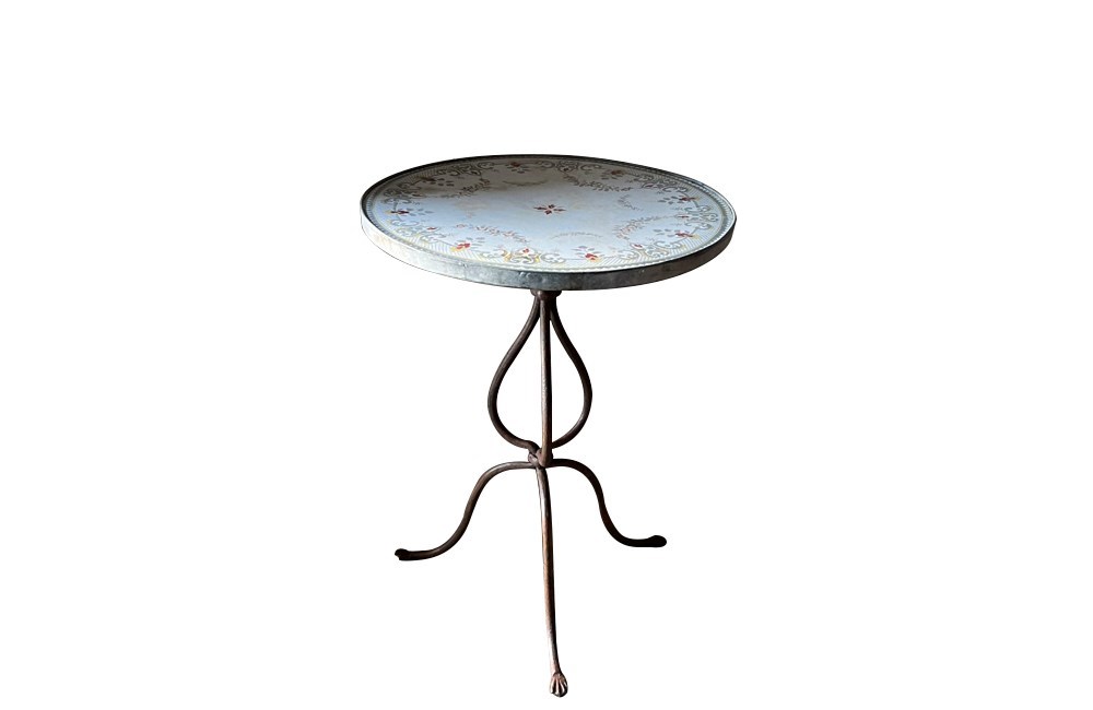 This charming bistro table has an curvaceous wrought iron tripod base. The legs terminate on paw feet. With metal surround, the pretty enamelled top features floral and foliate motifs and a decorative border of Rococo influence.