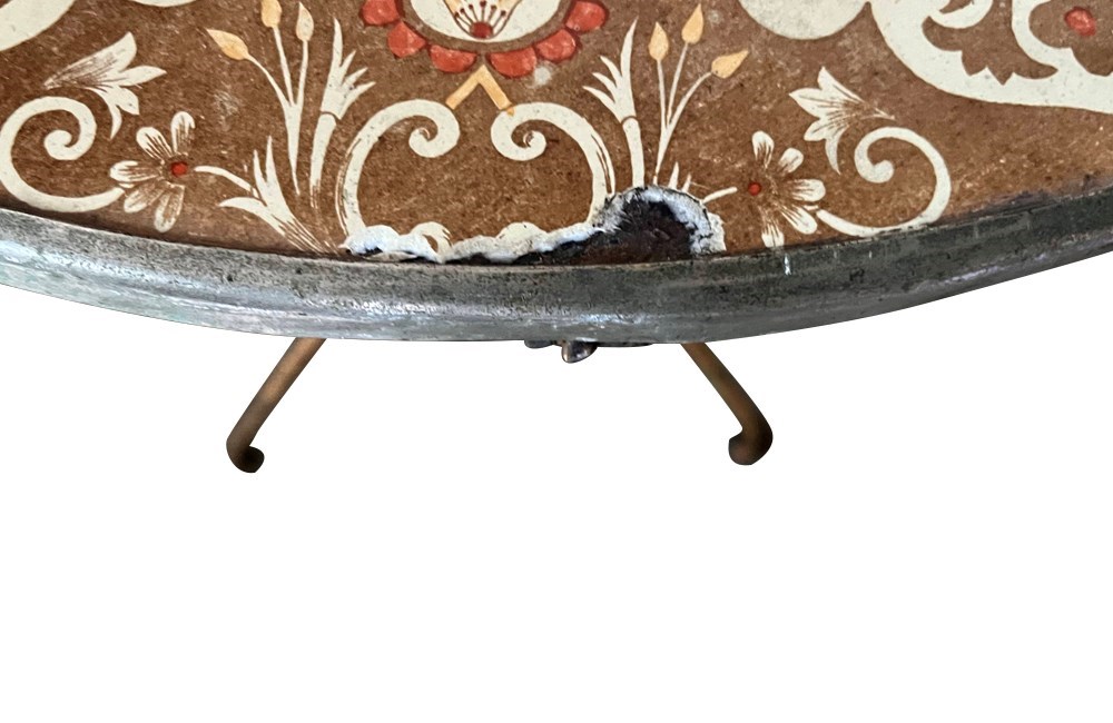 Rare, French enamel top gueridon. This charming bistro table has an iron tripod base.