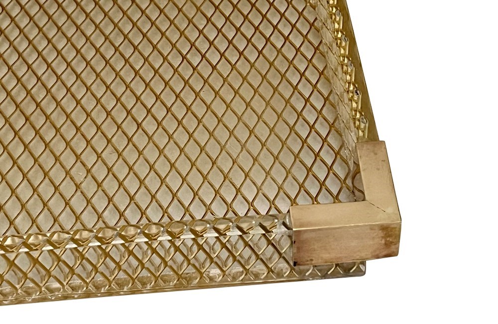 Large lucite tray with brass corners and embedded mesh with two incorporated handles It sits on a separate brass stand.