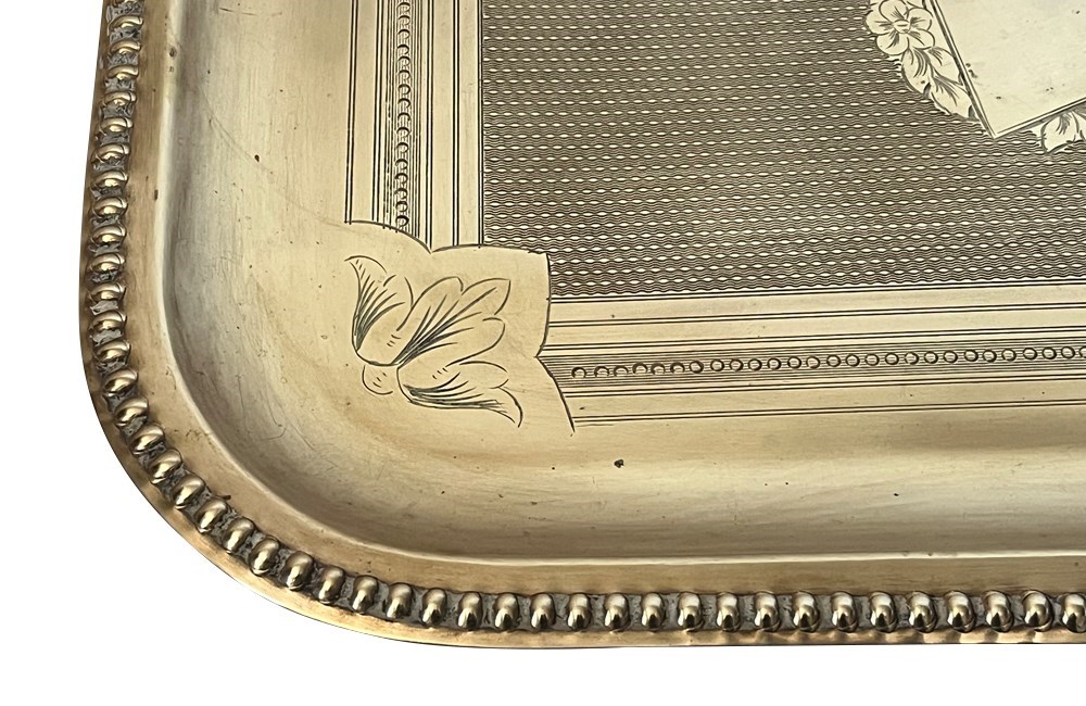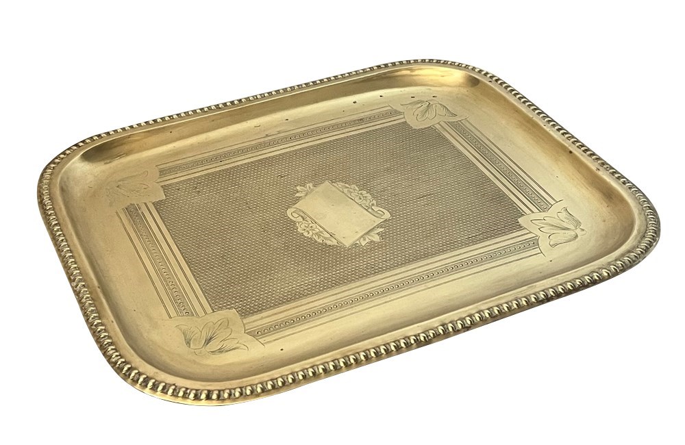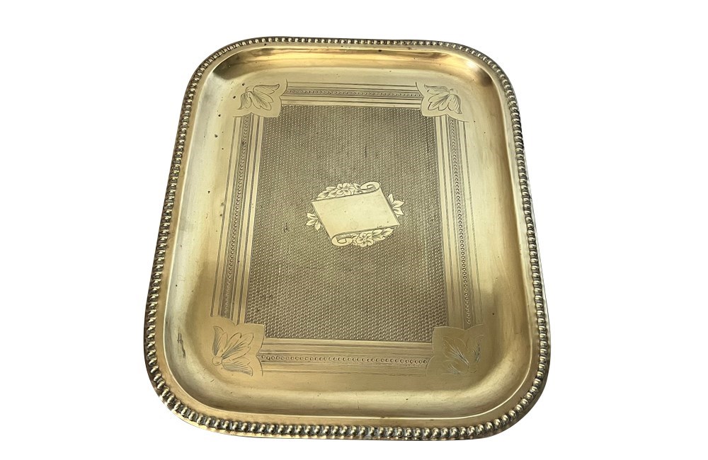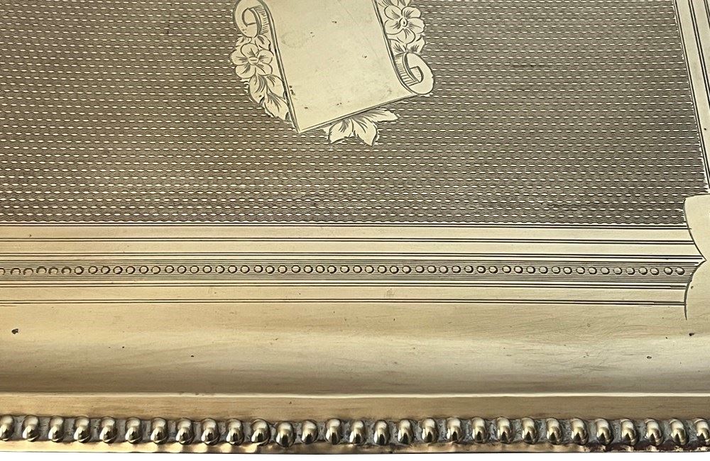With engine turned and foliate pattern. With central empty scroll cartouche and gadrooned rim.