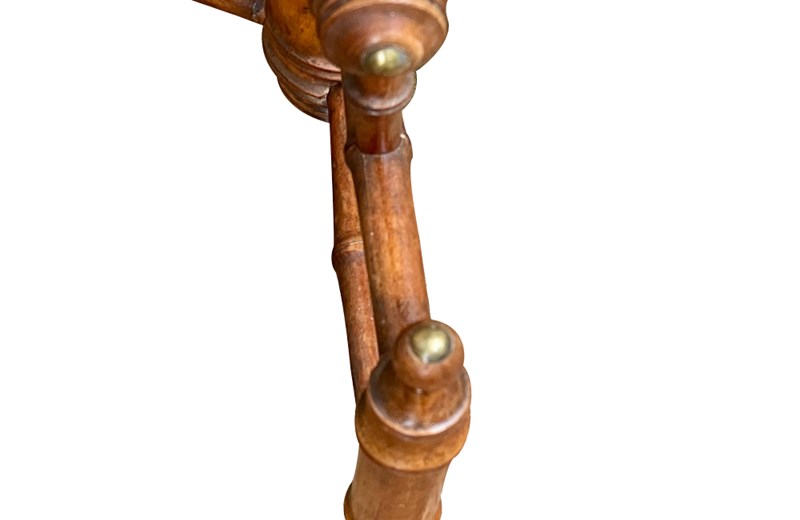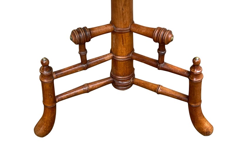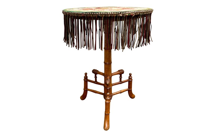 Charming faux bamboo occasional table with worn tapestry fabric top and decorative fringed surround.