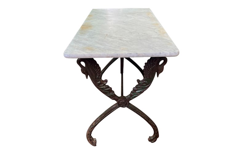 Elegant, French bistro / garden table with stunning cast iron swan design base. Lovely green patination to base and old marble top. Circa 1900