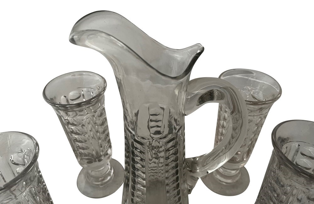 French Normandy glass jug and four matching tall stemmed glasses. Circa 1900