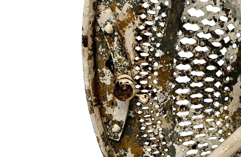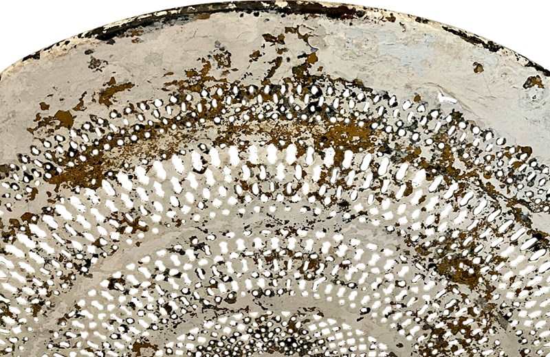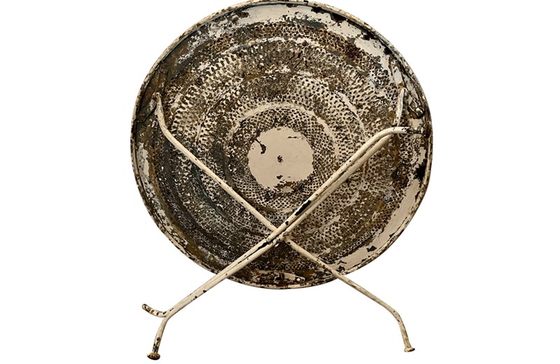 This round iron table of good size features a decorative pierced top and lovely patination. It is equally suitable for use as a garden or interior table.