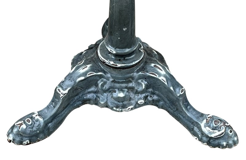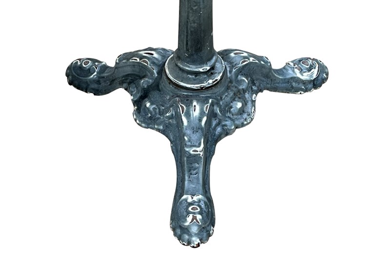 Enamelled grey iron base with reeded downright terminating on ornate tripod foot.