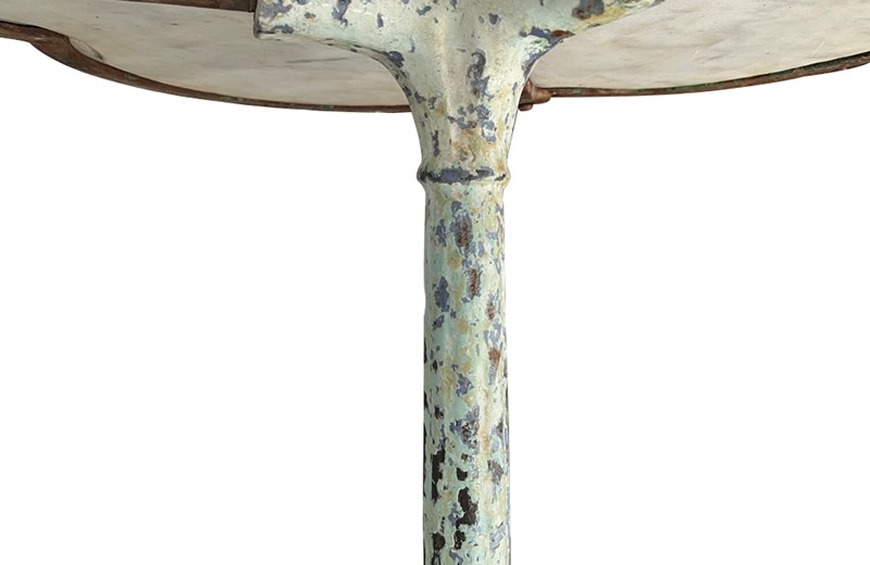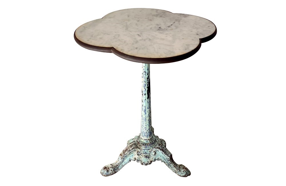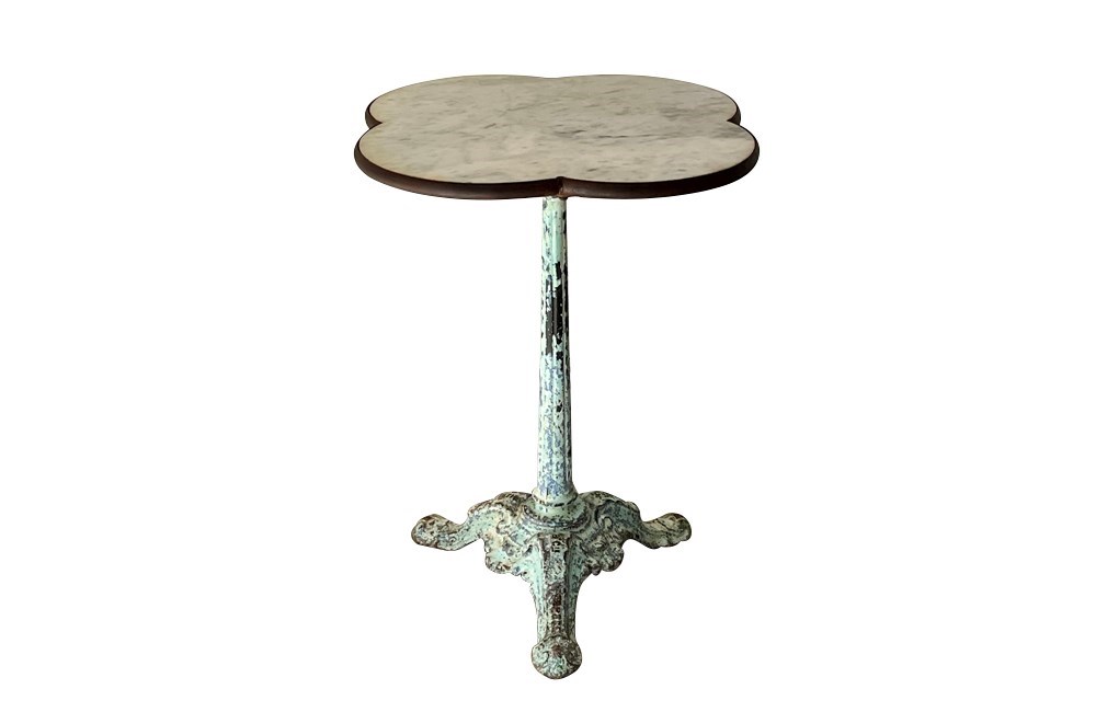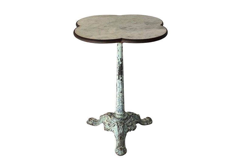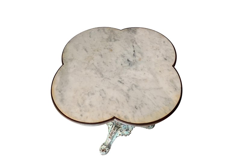 Beautiful 19th Century French bistro table with quatrefoil (clover) shaped marble top with iron surround.