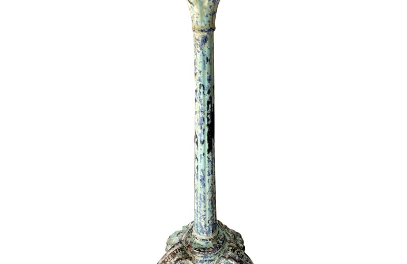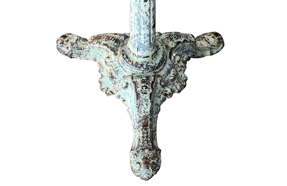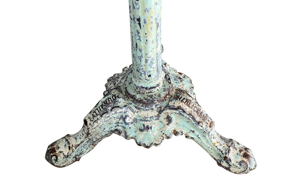 Lovely, colour and worn patination to the enamelled iron base. It bears the foundry stamps to feet of Charlionais Pourailly & Cie.