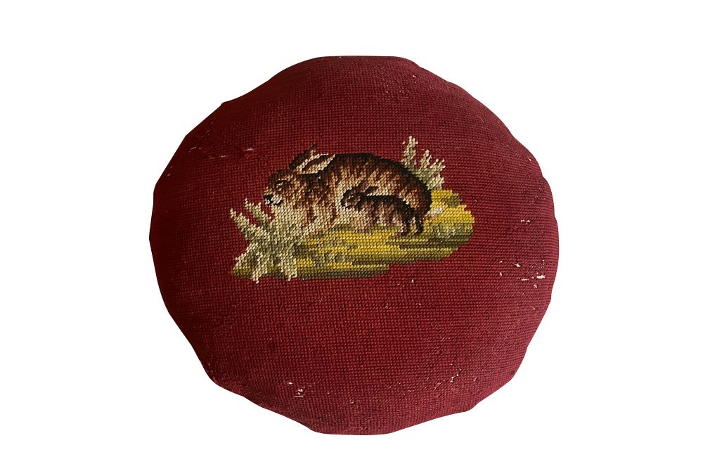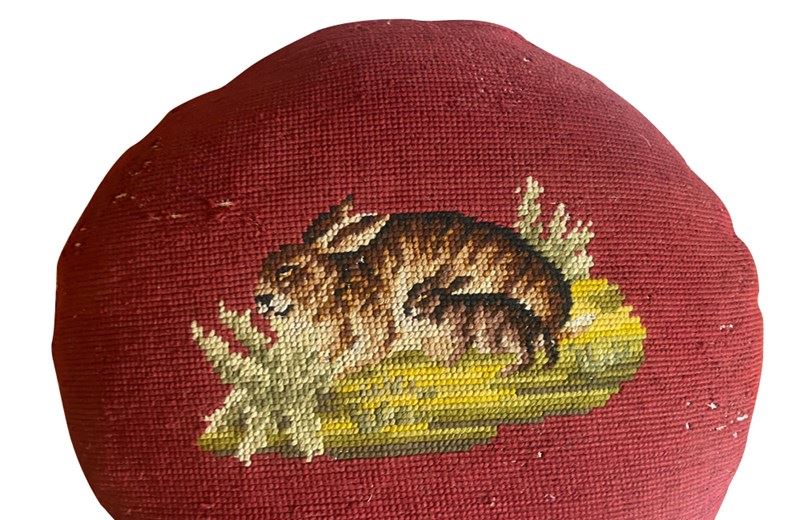 Charming cushion fashioned from a 19th Century French handstitched needlepoint depicting a rabbit and kit.