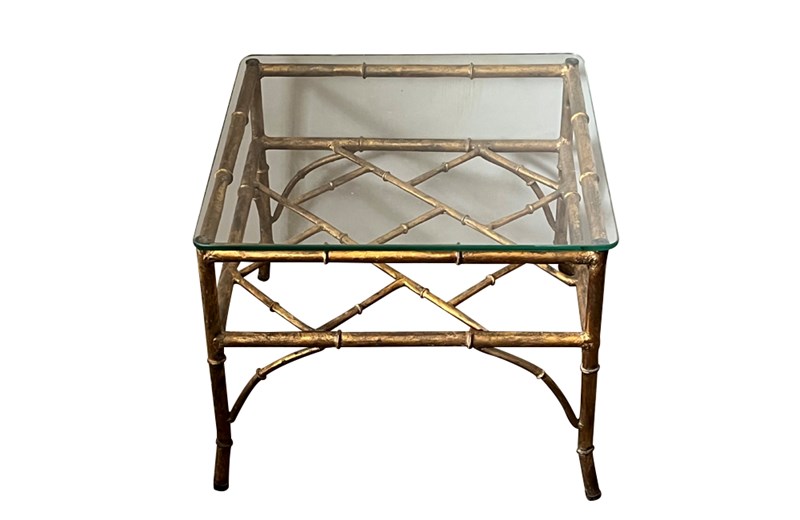 20th Century French square gilt metal faux bamboo coffee or end table with clear glass top. Circa 1970