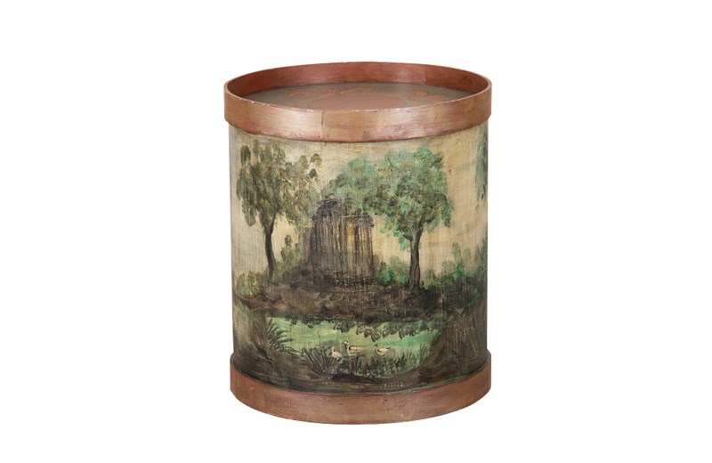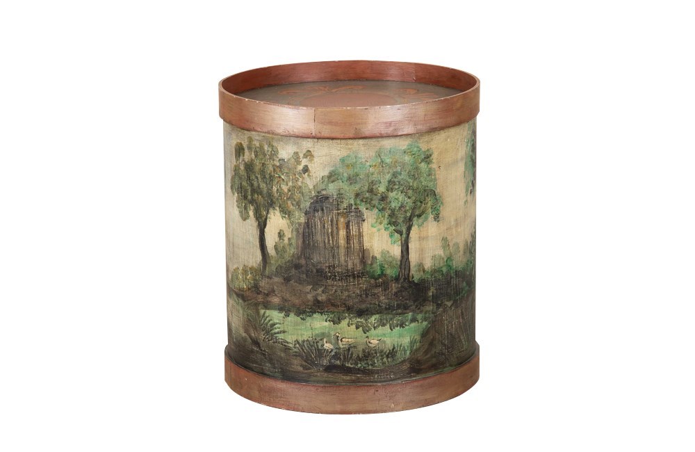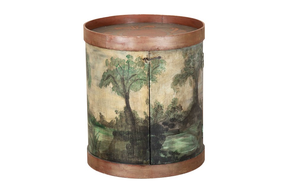 A charming 20th Century French decorative drum cupboard, hand-painted with romantic pastoral landscapes in soft green and earthy tones.