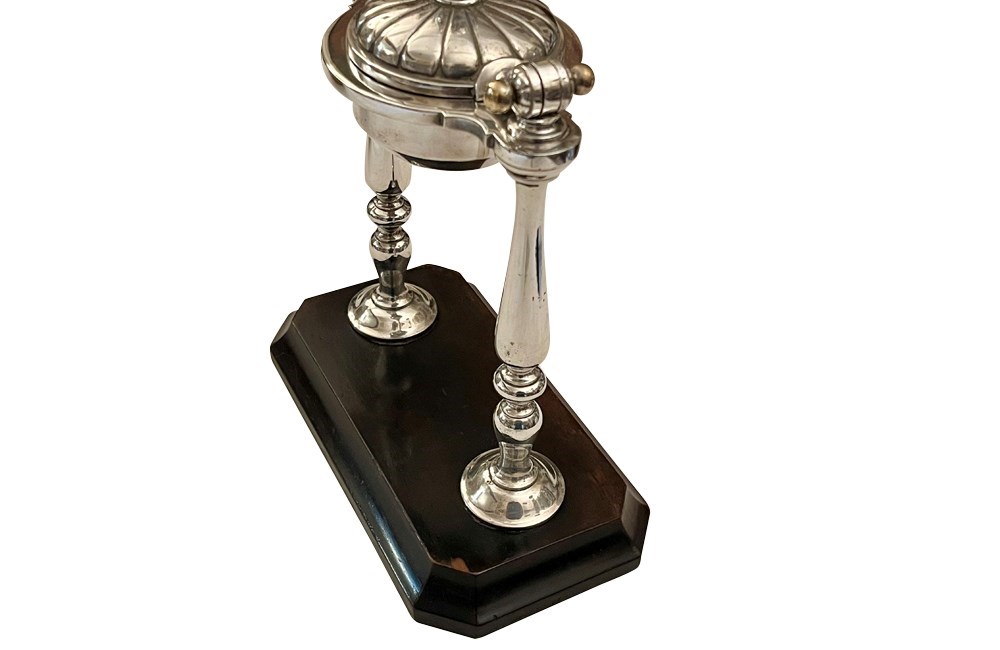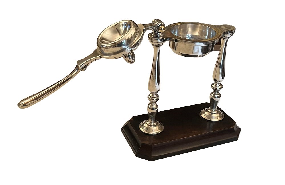 With manual vice push down lever and pierced strainer insert. It stands on a rectangular wooden plinth. A perfect bar accessory to press fresh lemons and limes directly into your mixing vessel or glass.