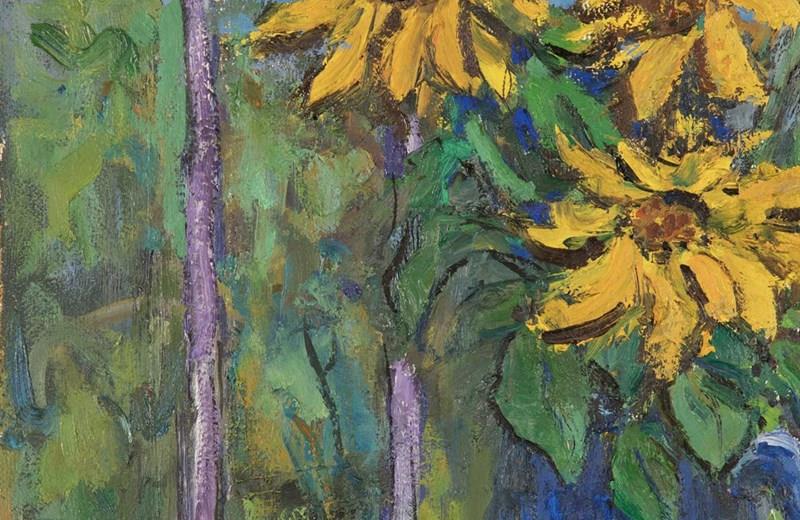 Signed to the lower left [undeciphered] and annotated, signed and dated to the rear with the title 'Girasols' [Trans: Sunflowers]. Circa 1984.