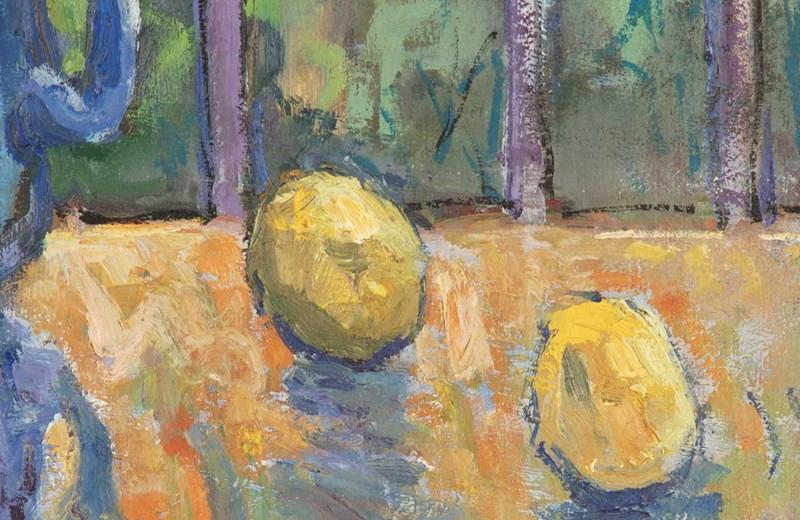 Depicting a vase of sunflowers with lemons on a balcony. To the rear is a view of blue skies and Mediterranean Sea over tree tops.