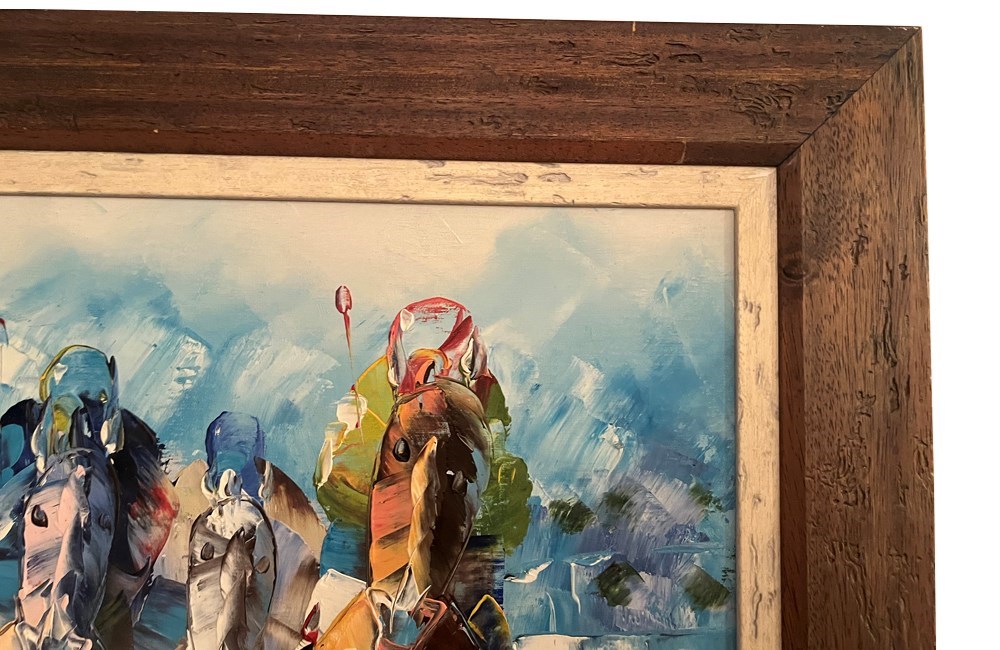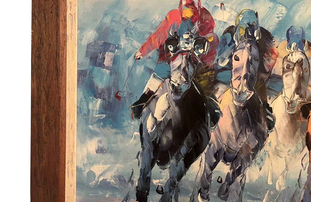 20th Century decorative, palette knife painting on canvas of a horse race.